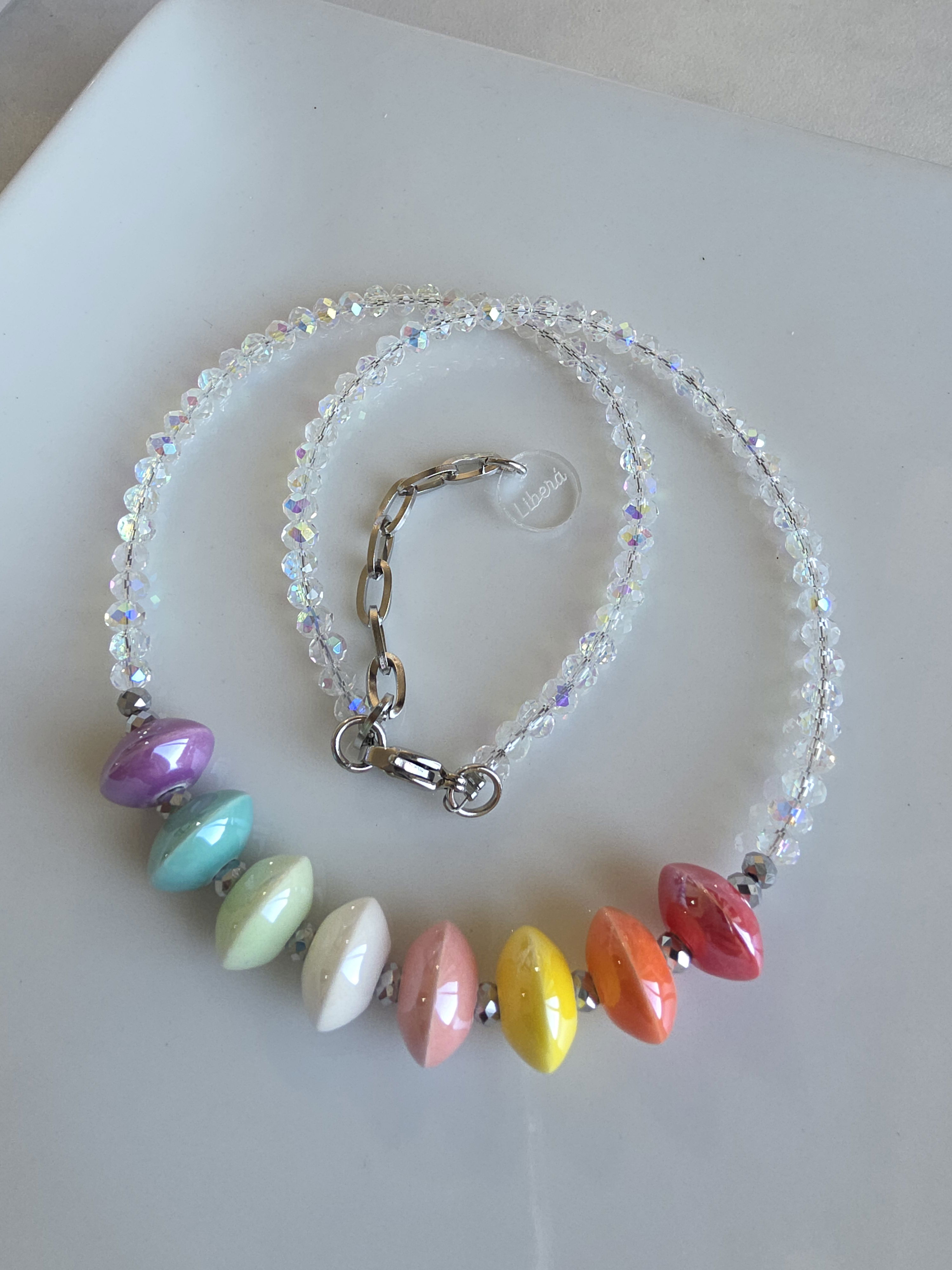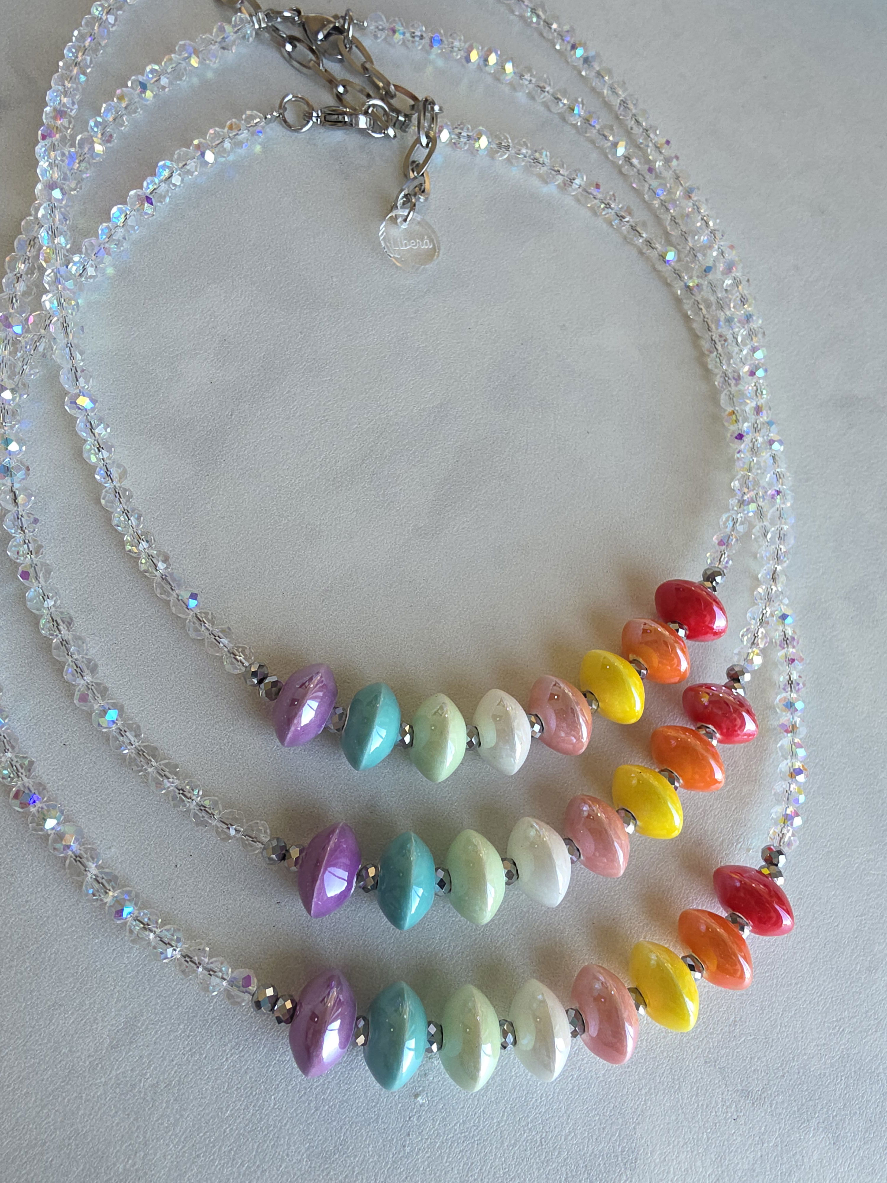 Collar de aproximadamente 40 cm (más cadena de alargue) compuesto por cristales y donas de cerámica esmaltadas.