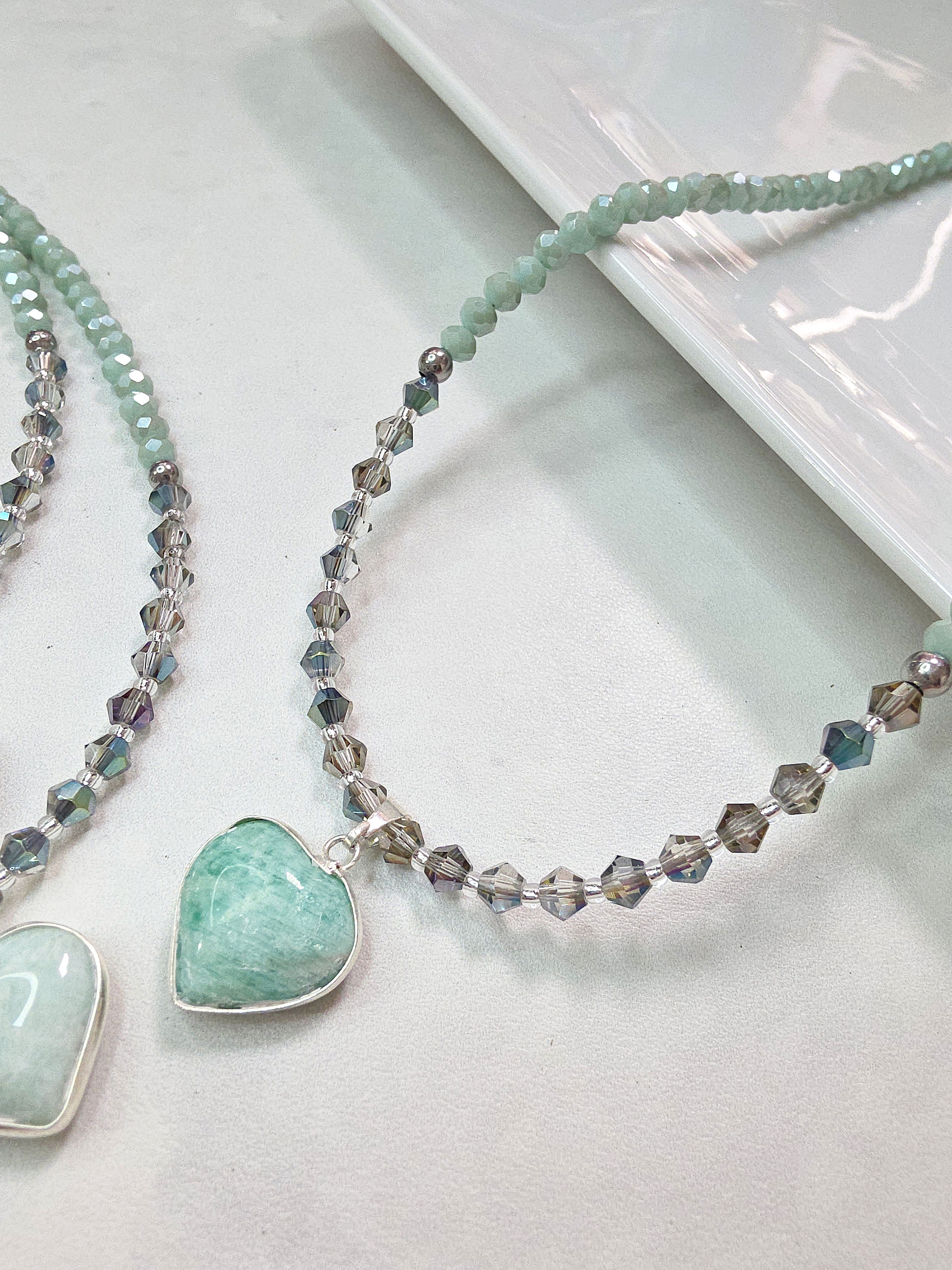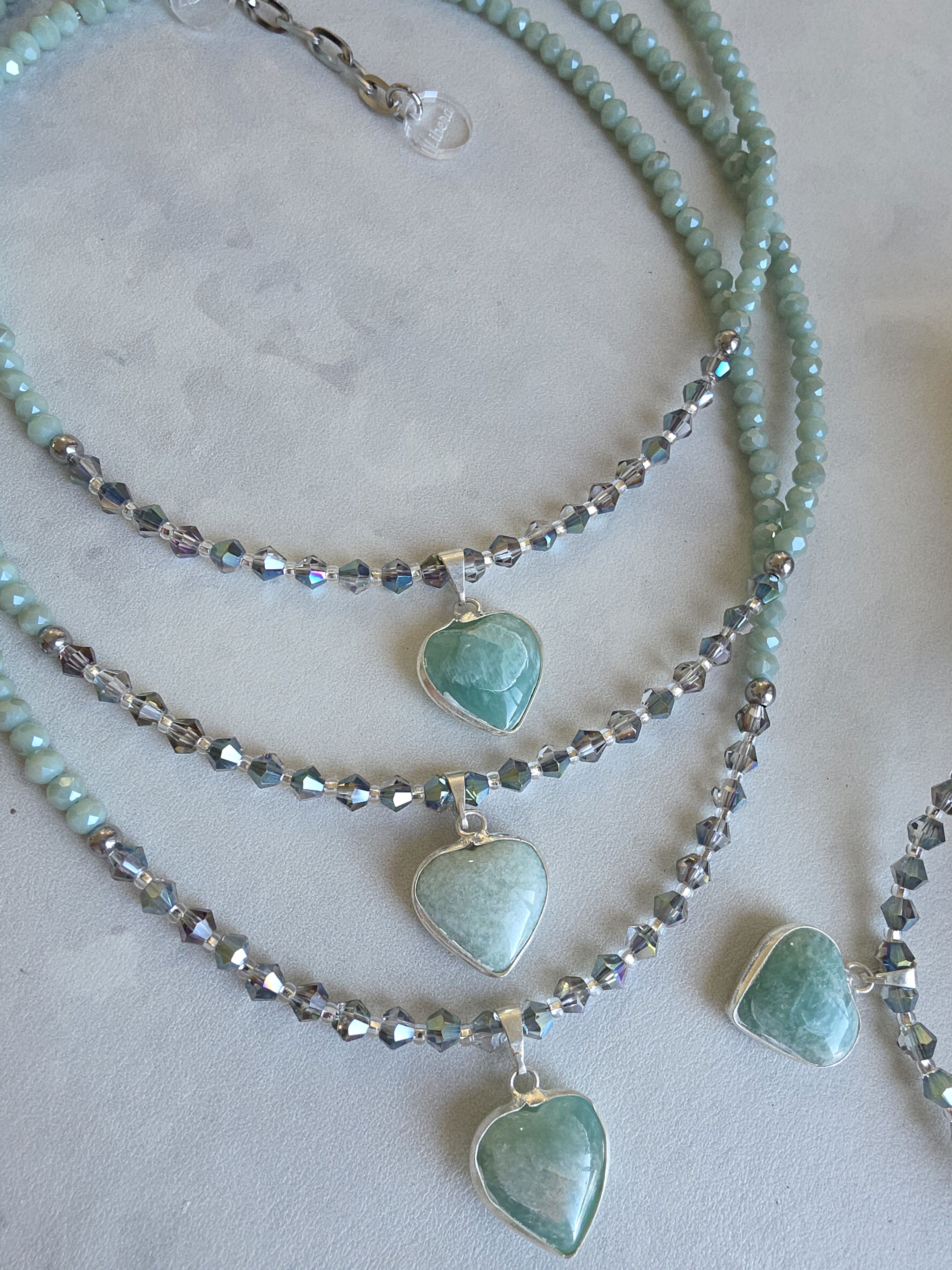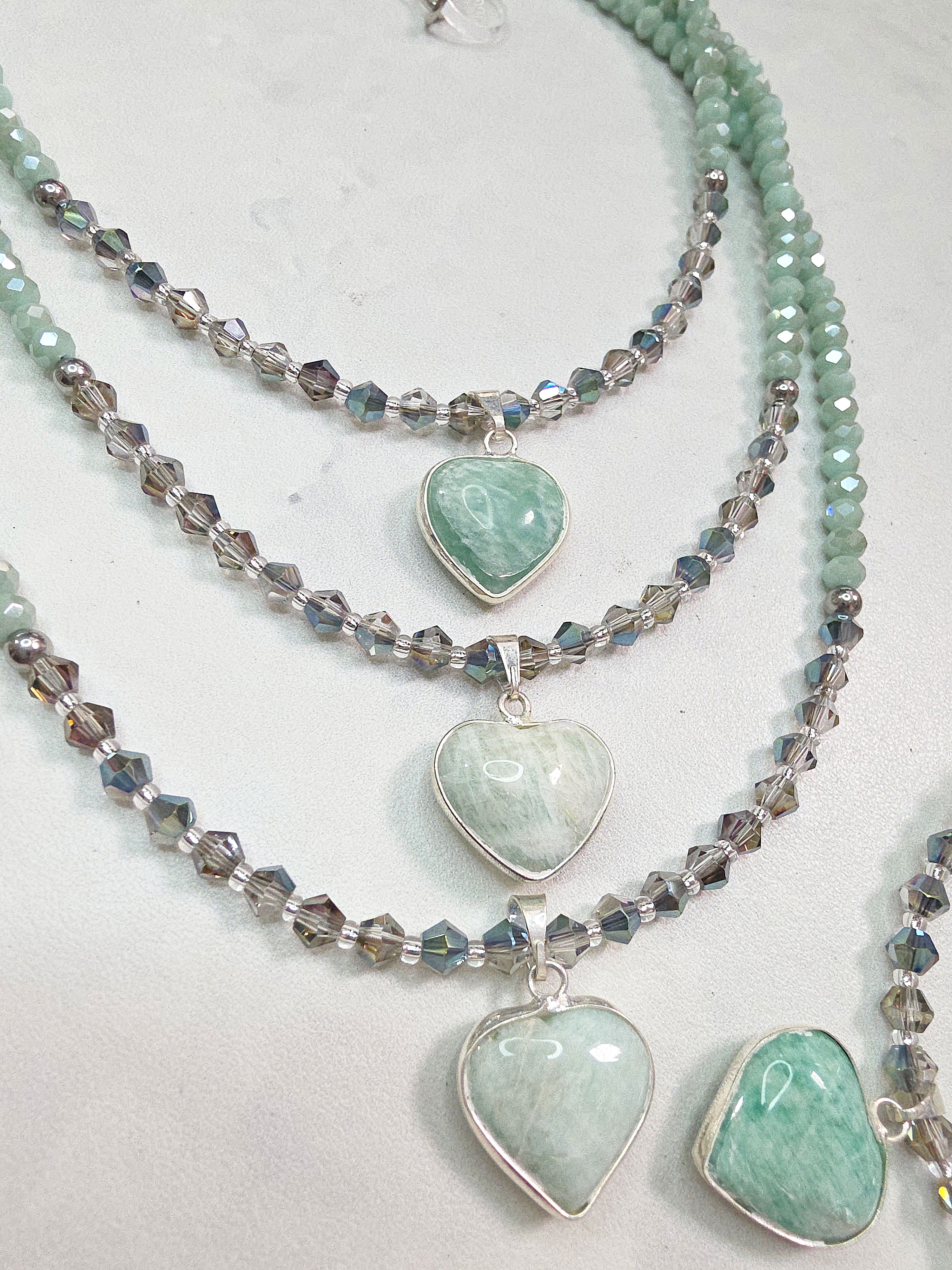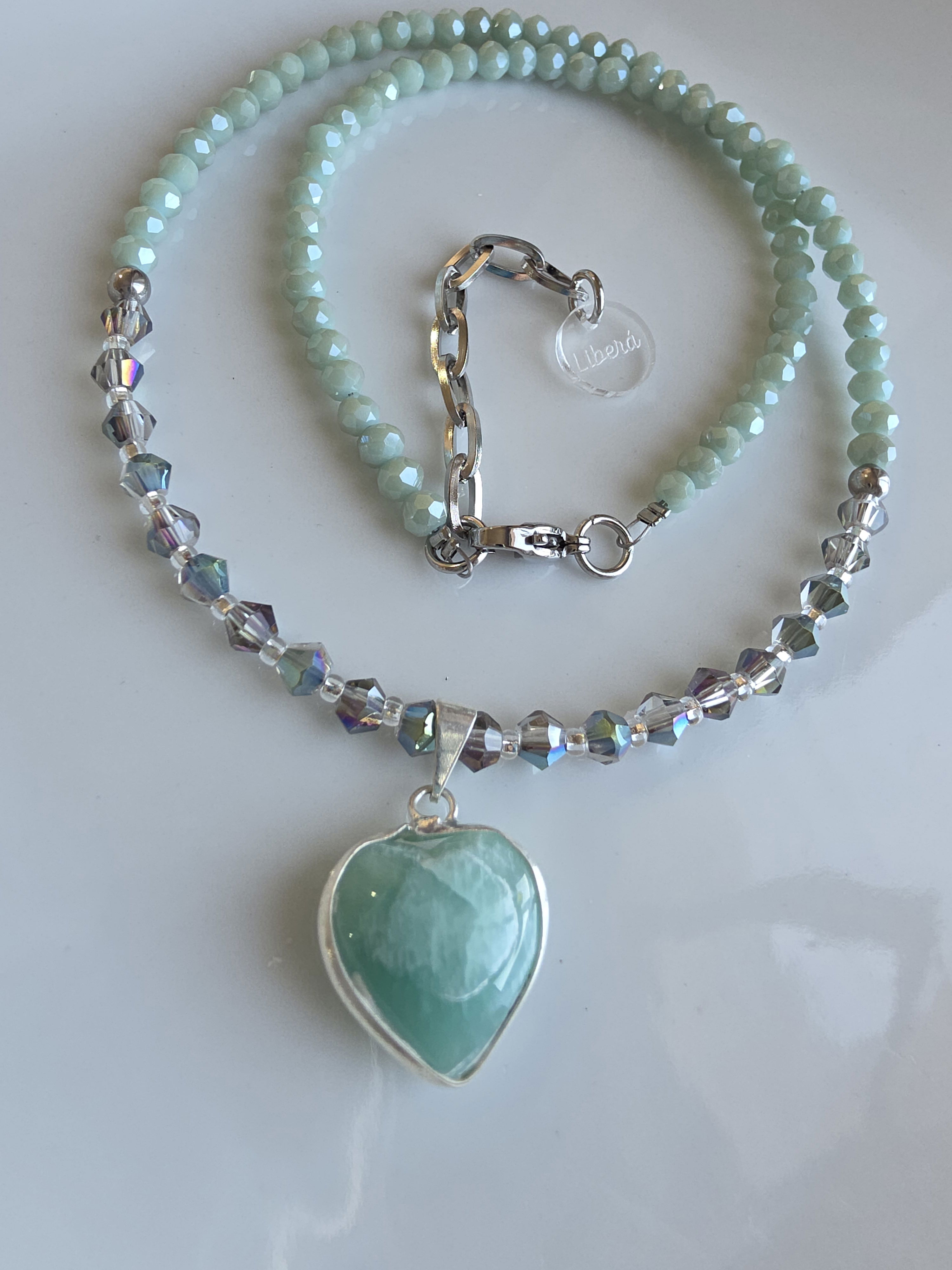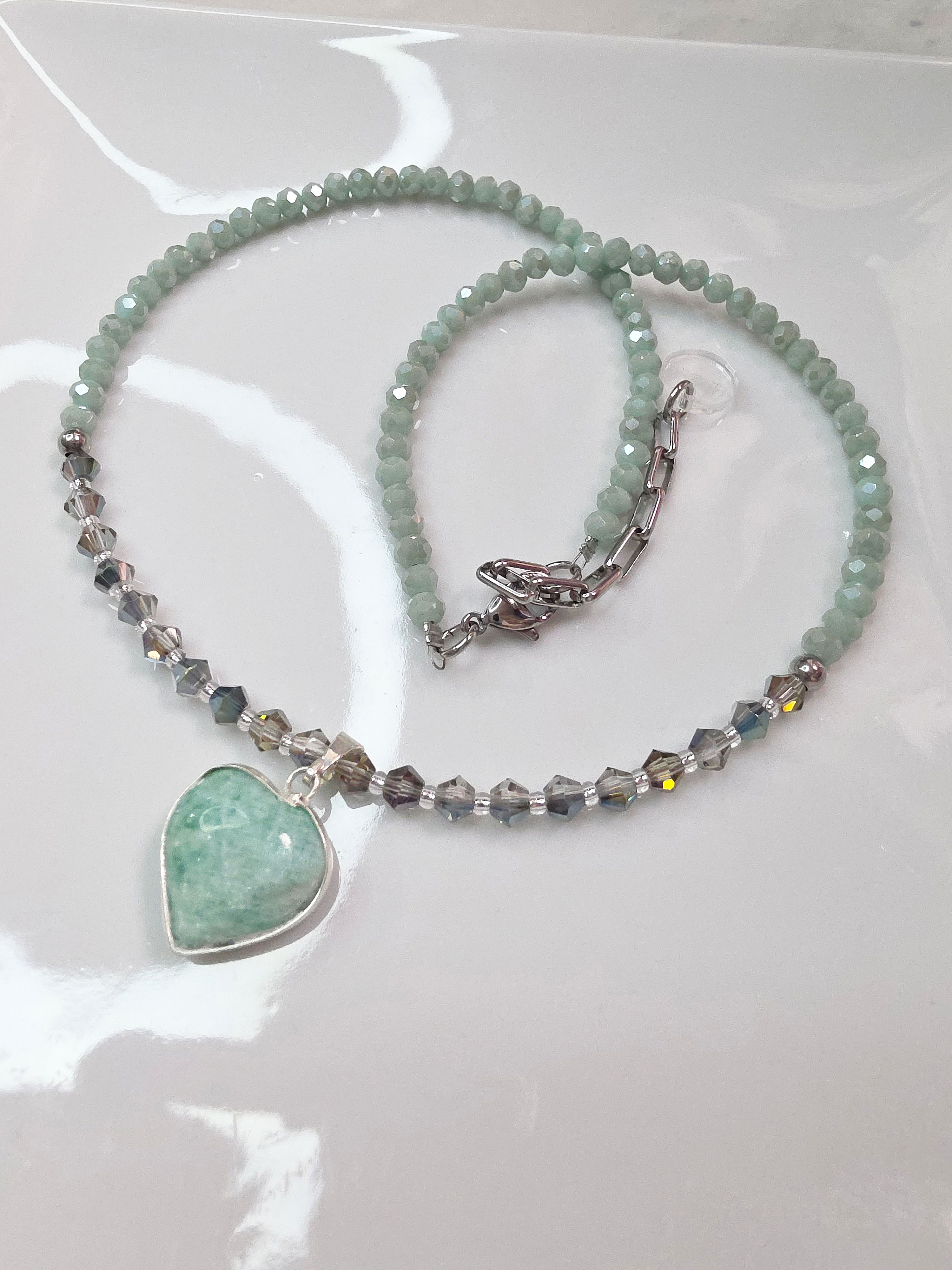 Collar de aproximadamente 40 cm (más cadena de alargue) compuesto por cristales,discos de Hematite y dije en forma de corazón de Piedra Natural Amazonita con virola baño en Plata.