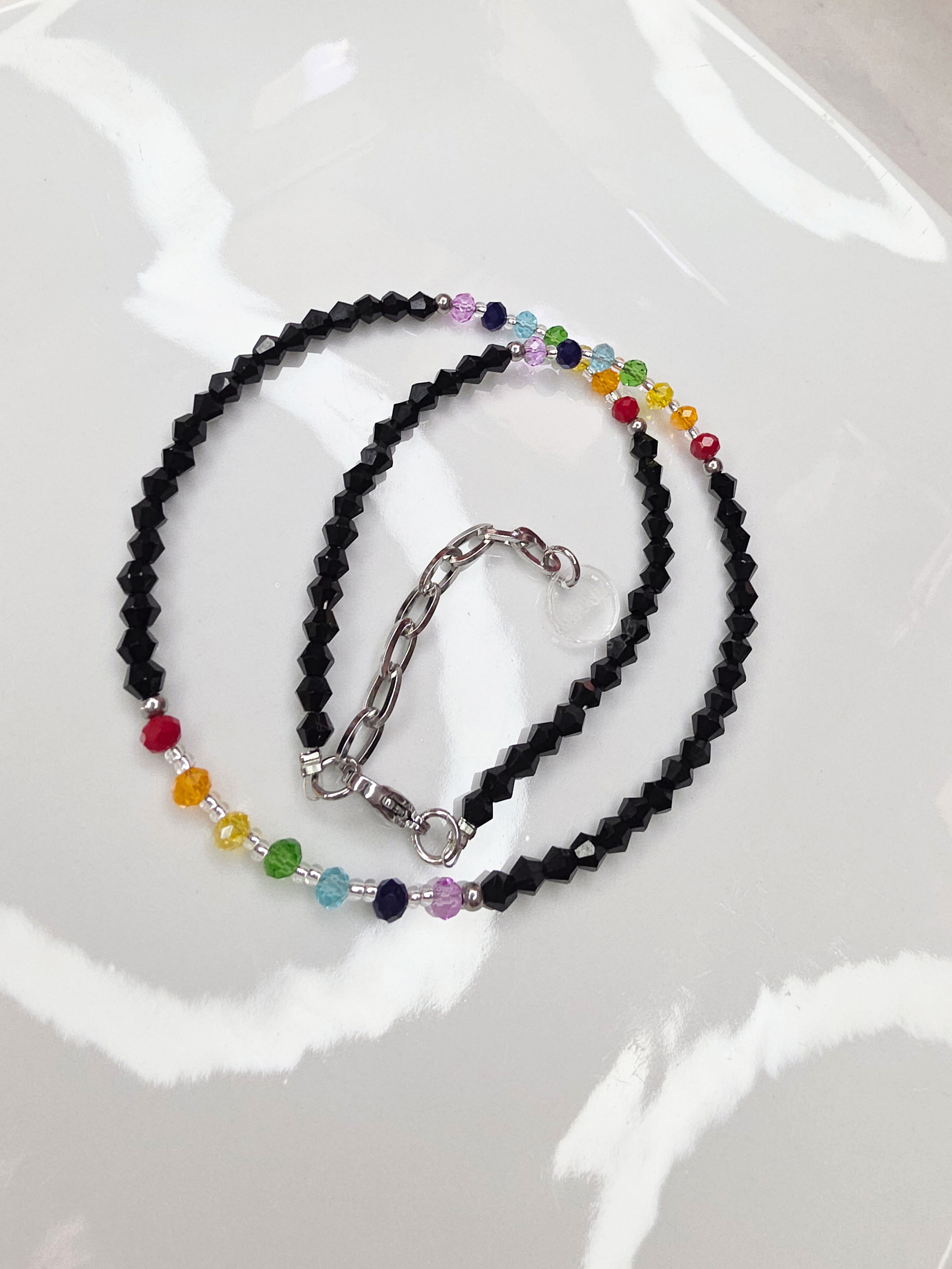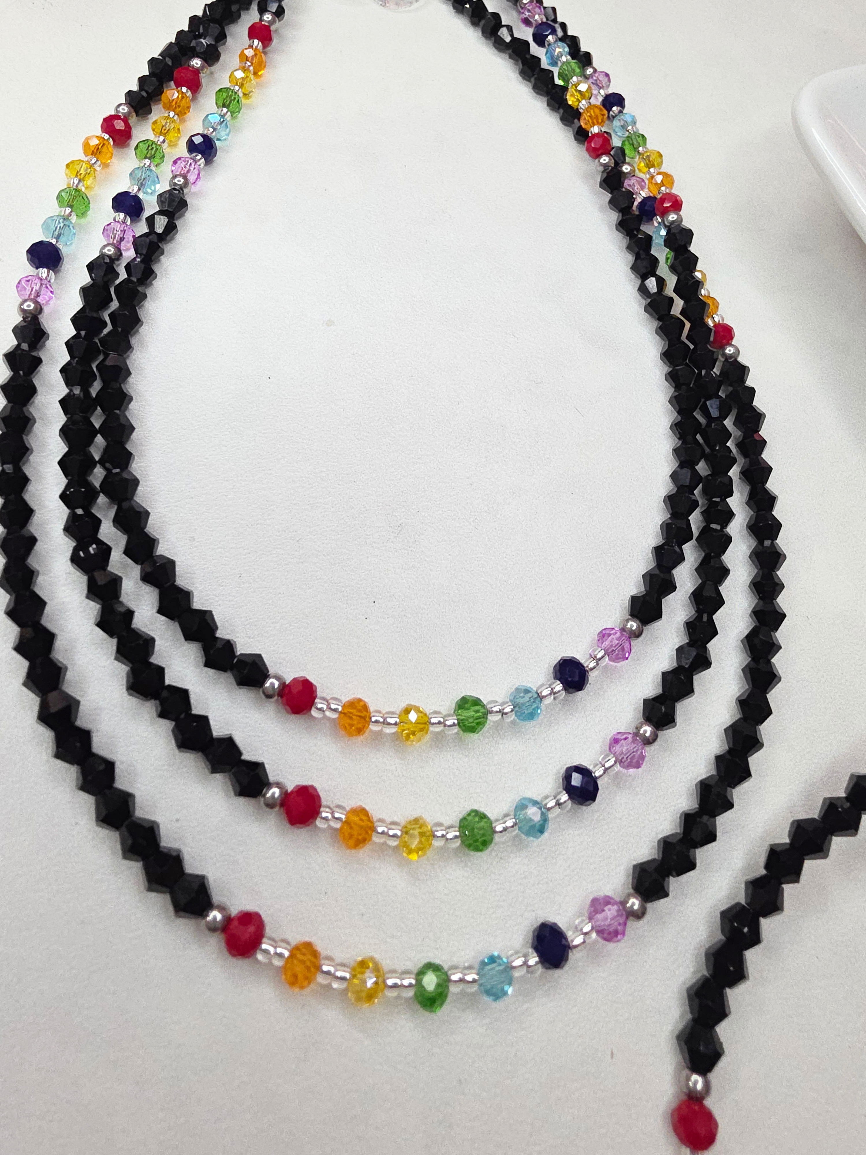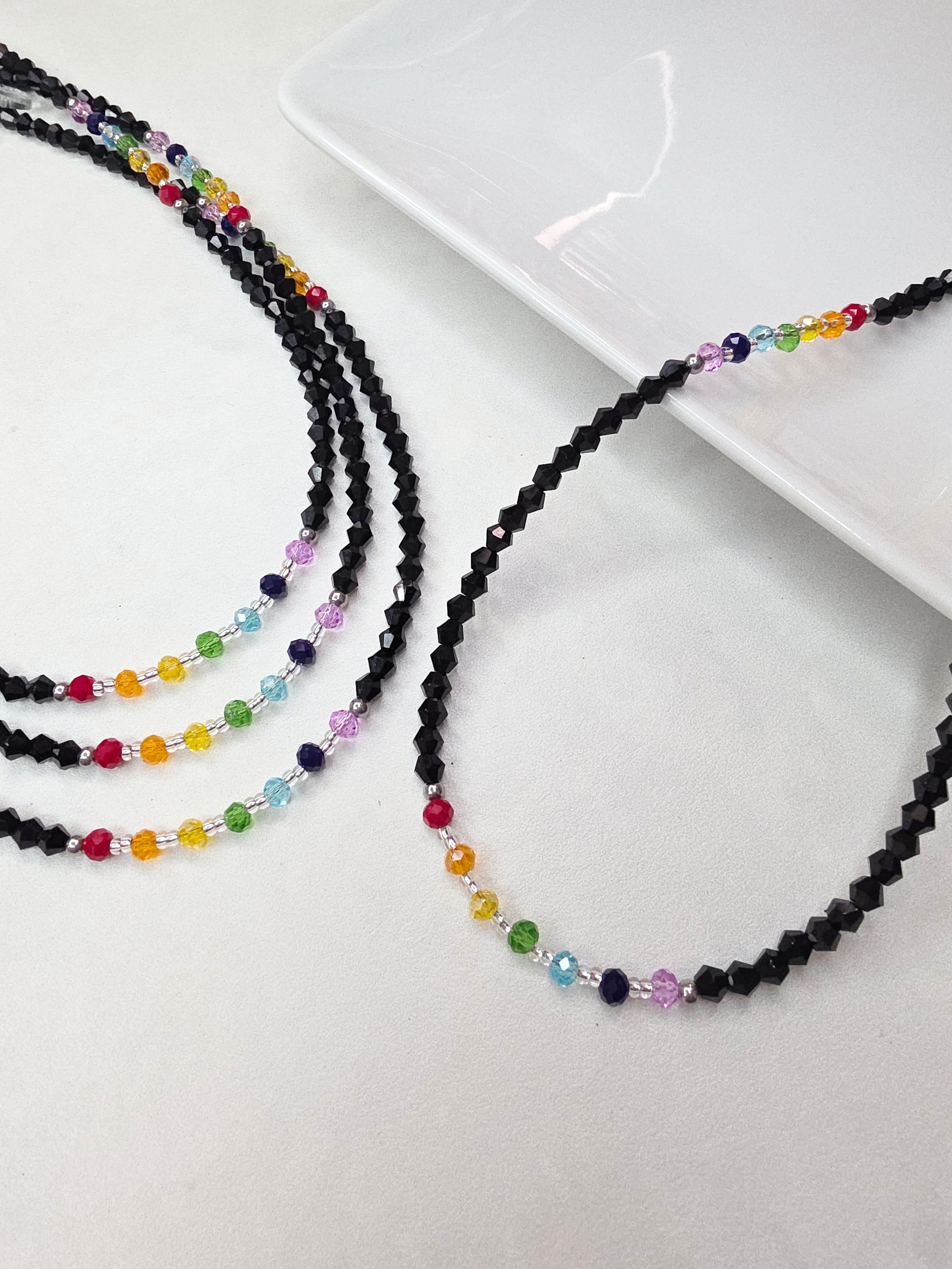 Collar de aproximadamente 40 cm (más cadena de alargue) compuesto por cristales Bicono y donas intercaladas con Mostacillas Checas calibradas marca Preciosa.