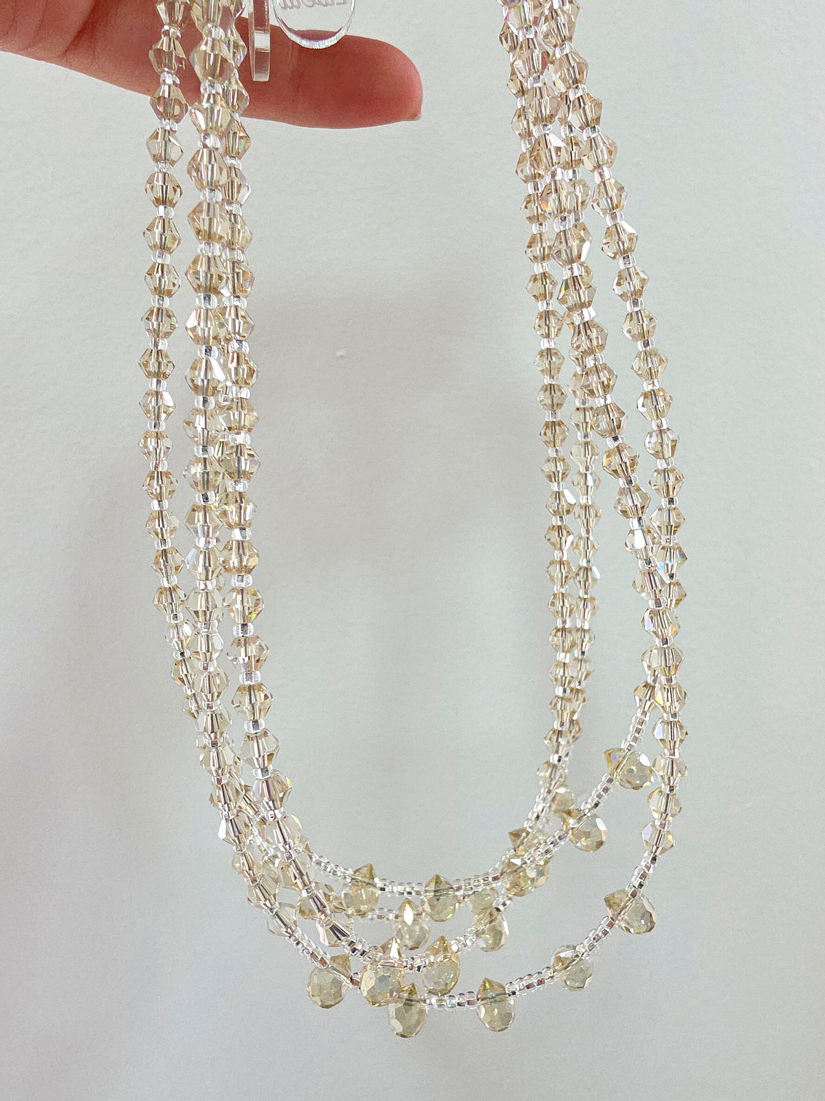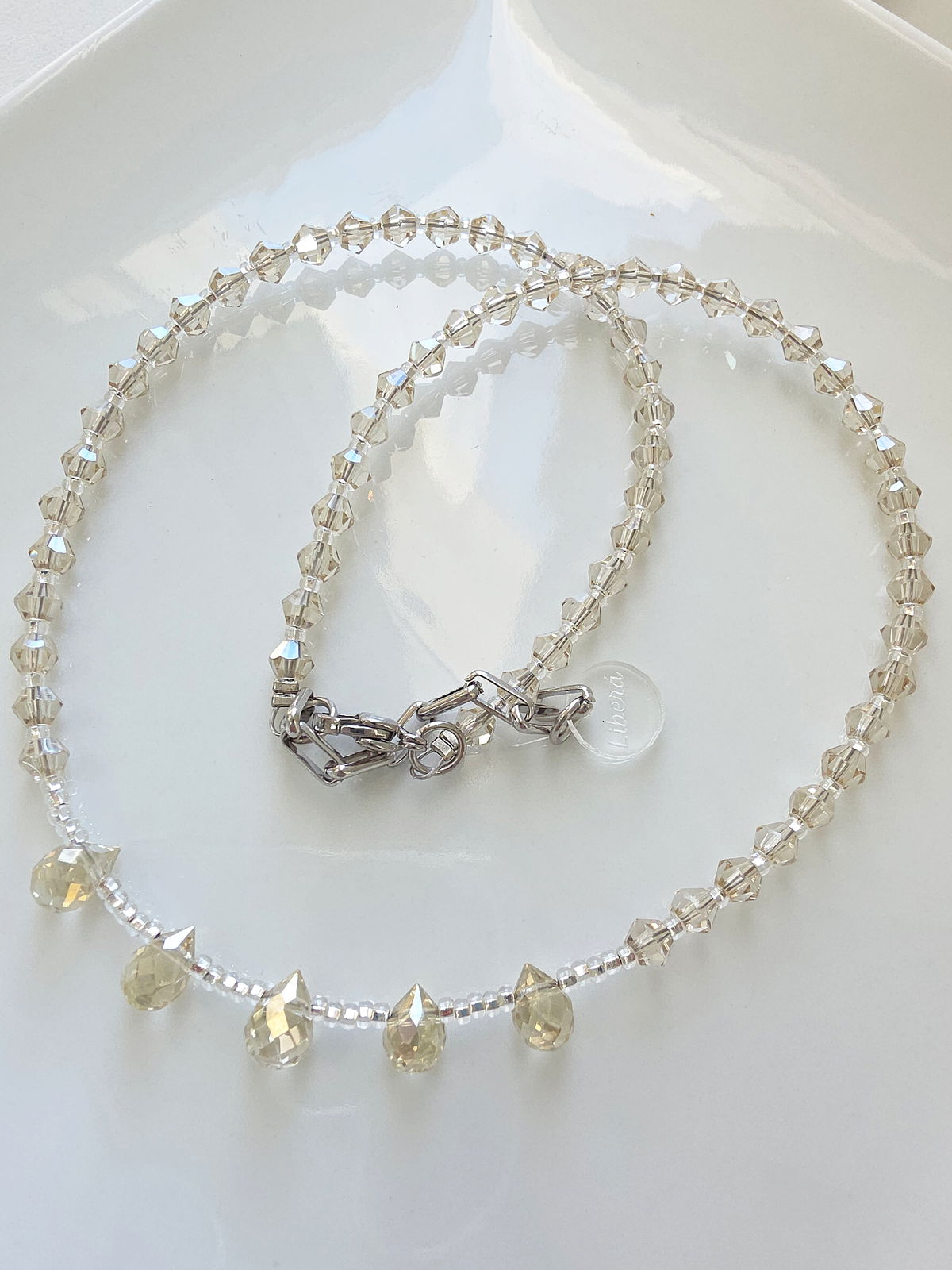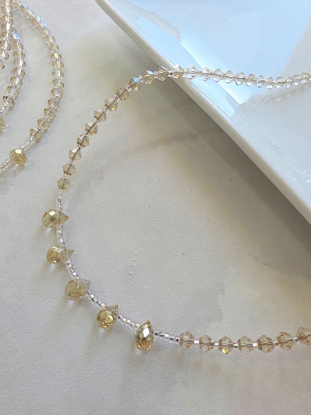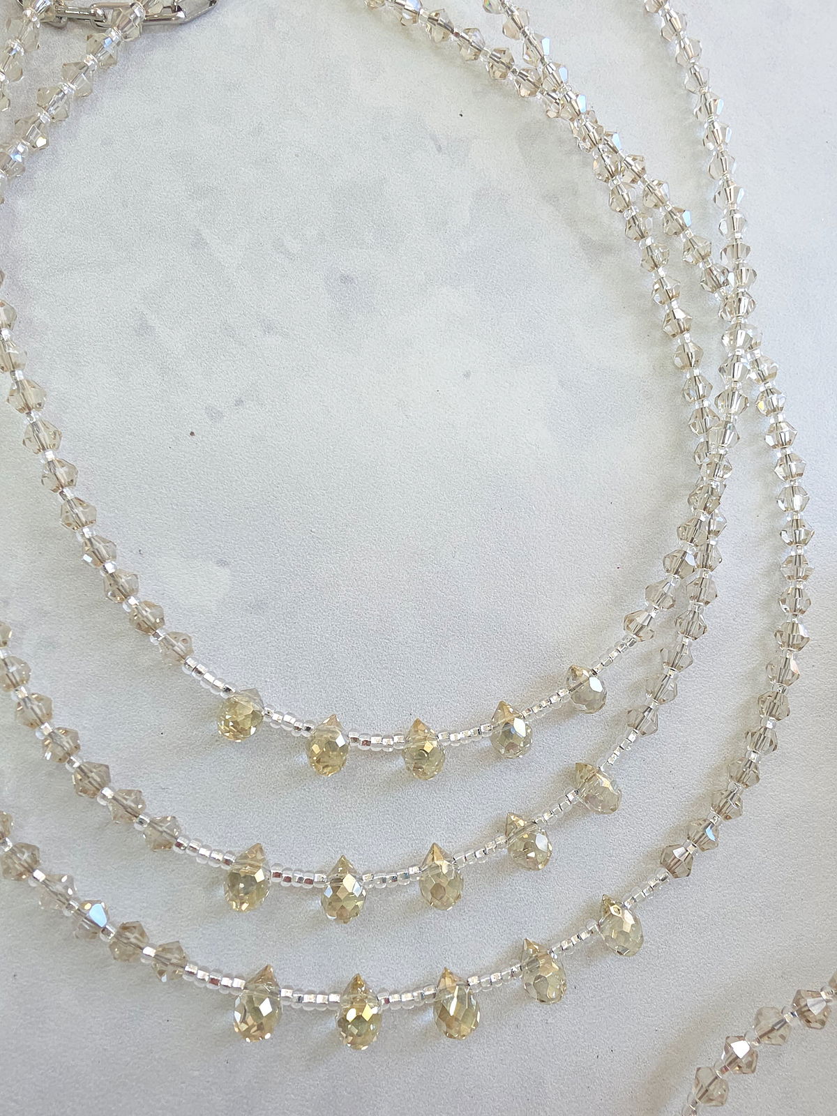 Collar de aproximadamente 40 cm (más cadena de alargue) compuesto por cristales cónicos, mostacillas Checas calibradas marca Preciosa y gotitas de cristal al tono. Cierre y cadena de Acero Quirúrgico 316l.