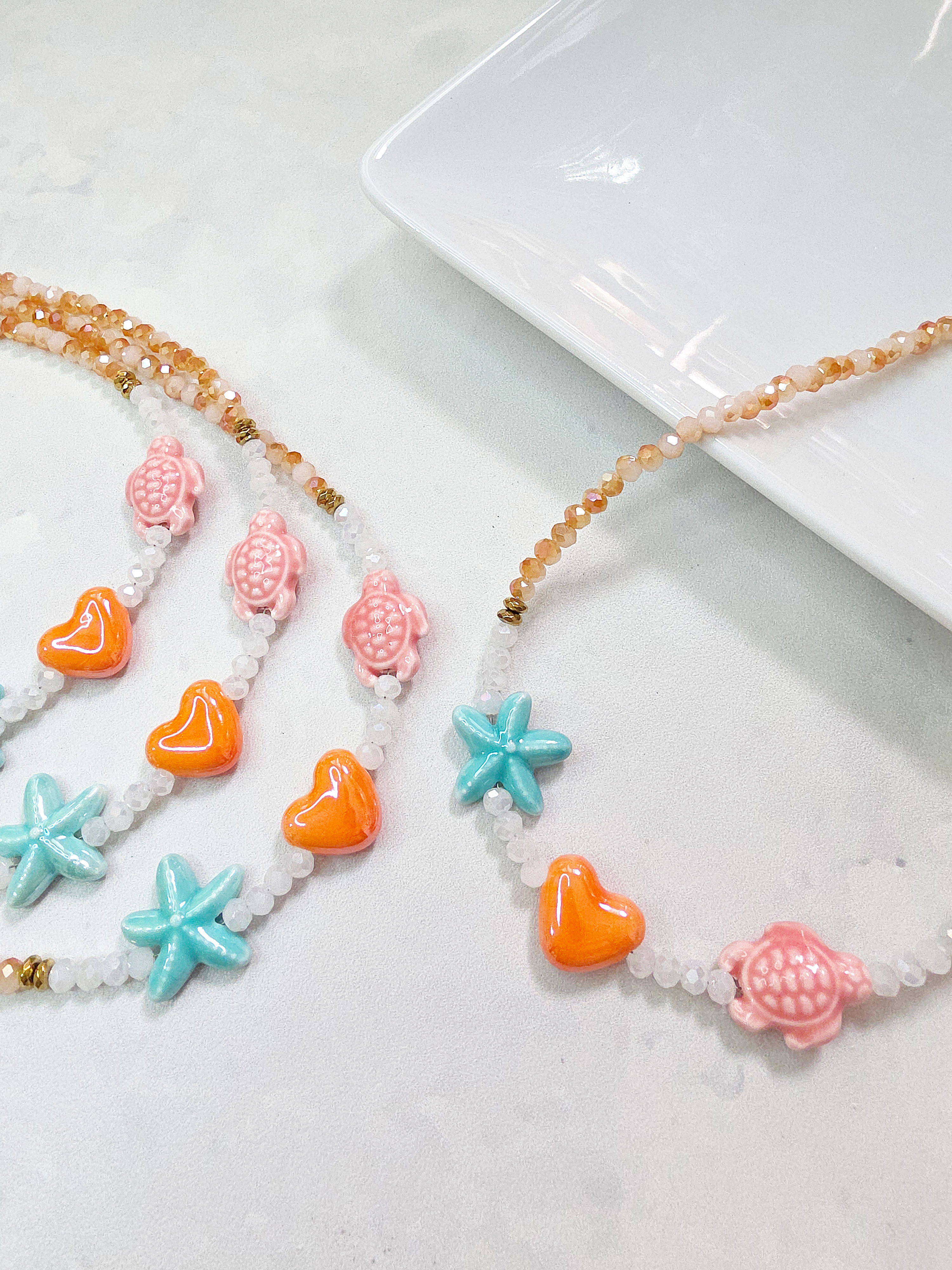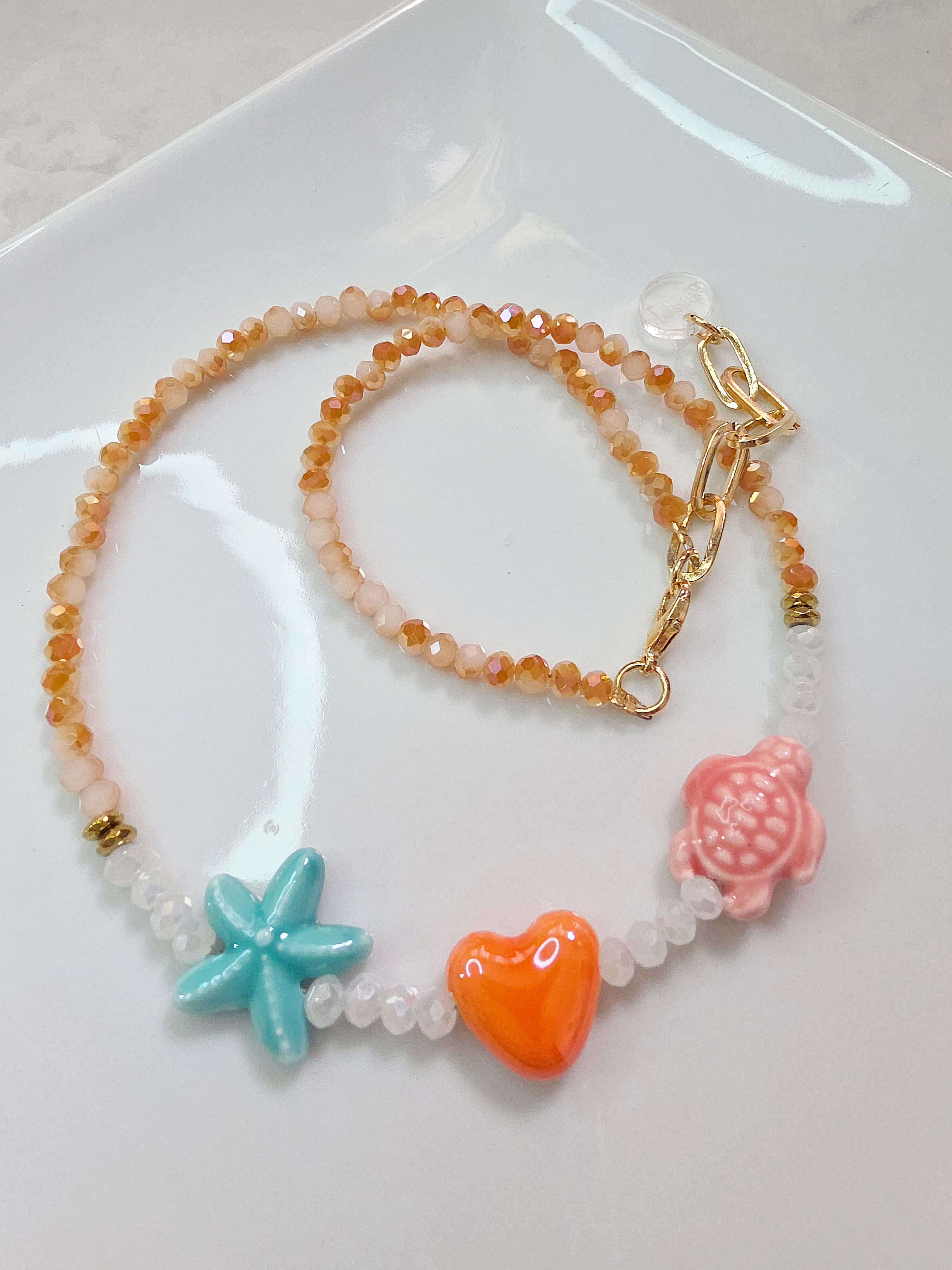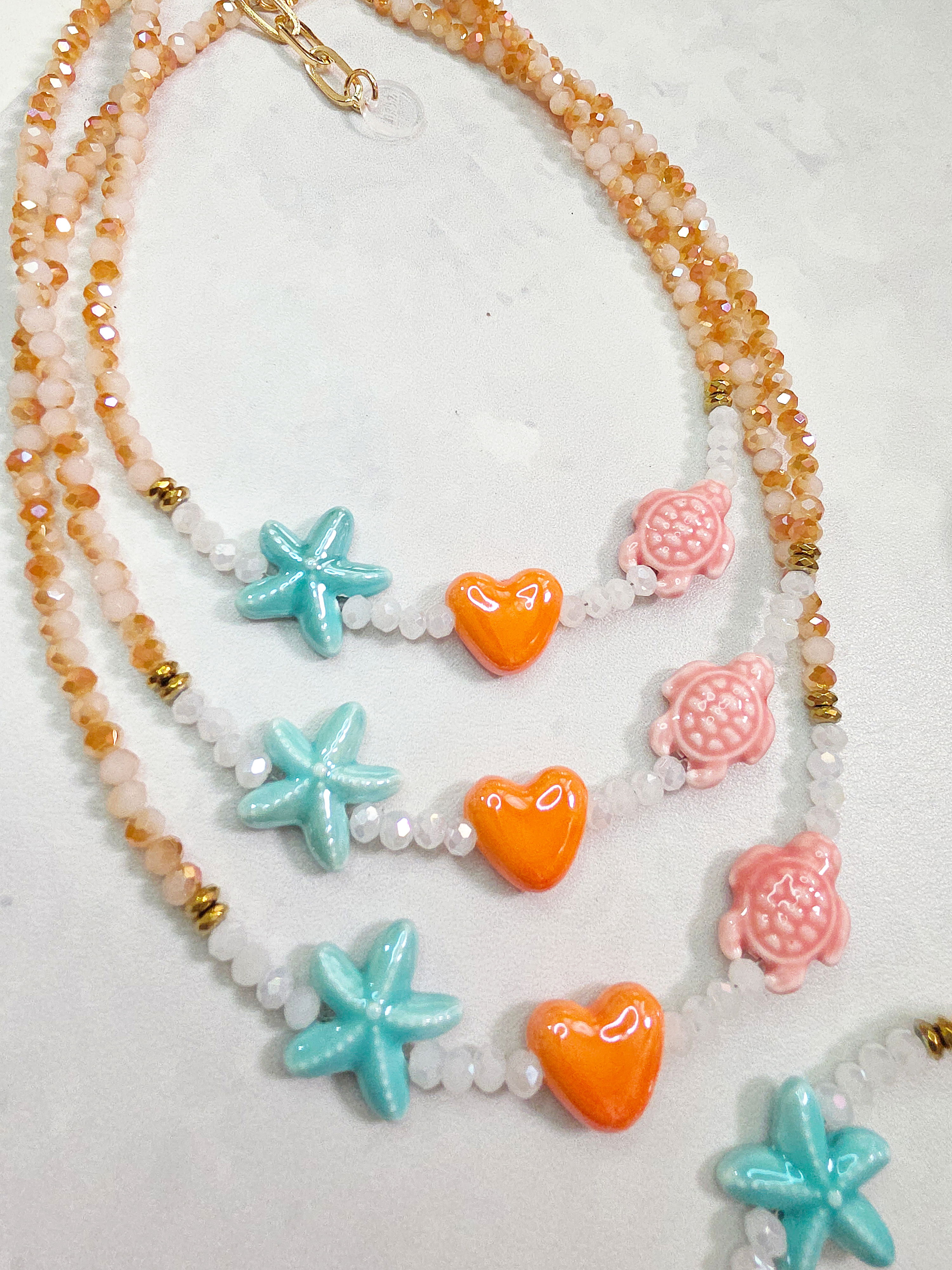 Collar de aproximadamente 40 cm (más cadena de alargue) compuesto por cristales, arandelitas de Hematite. Estrella de Mar, Tortuguita y Corazón de cerámica Esmaltada.
