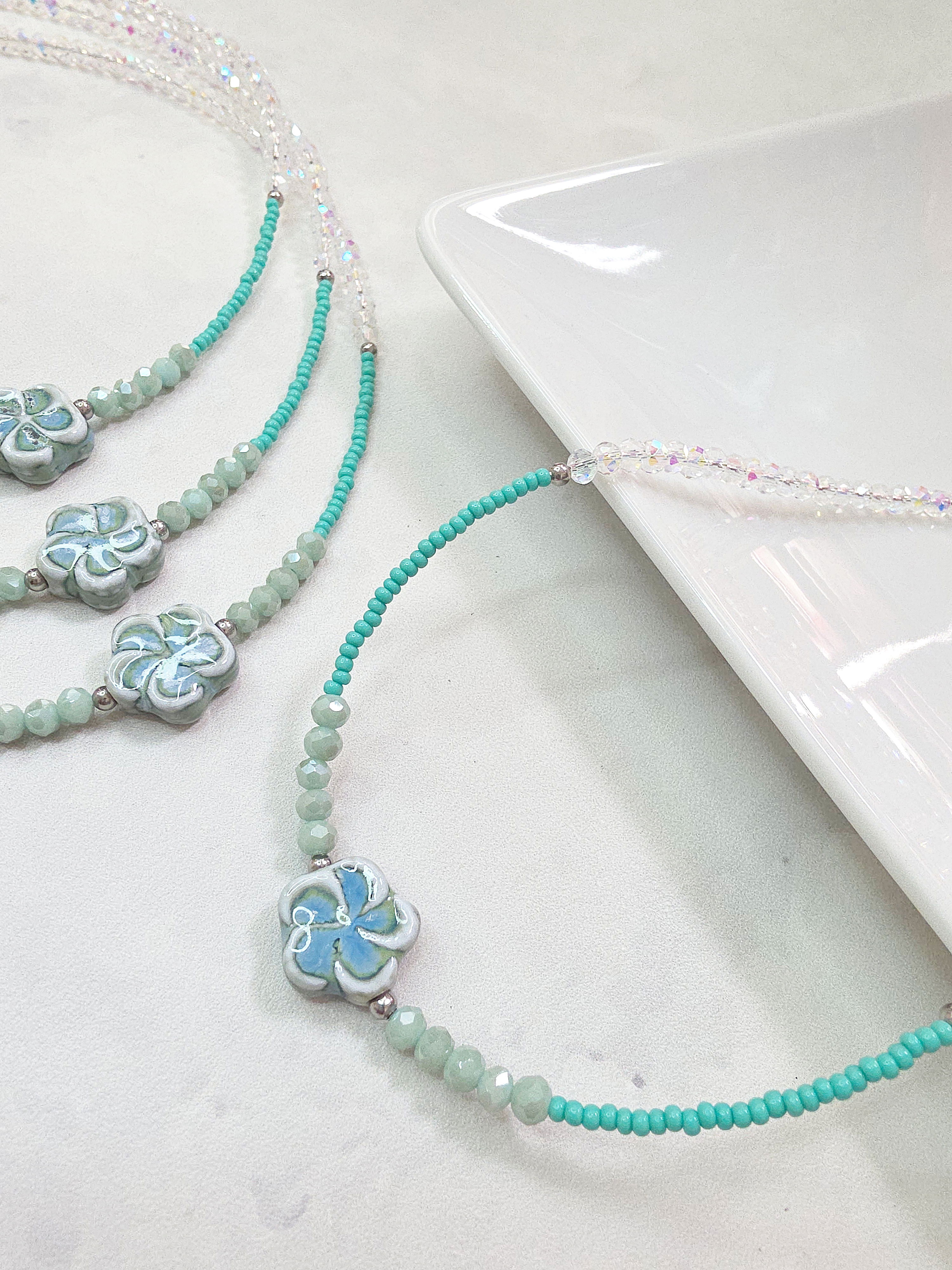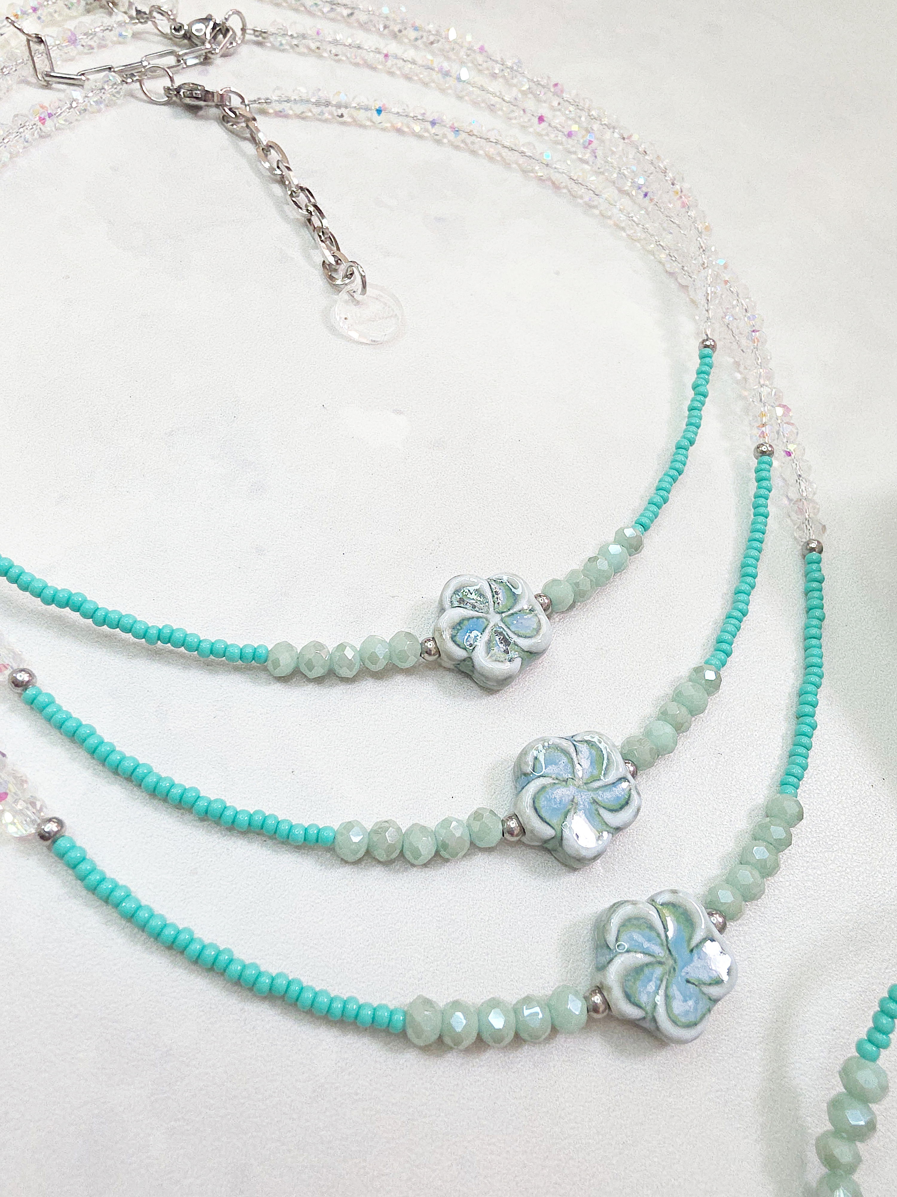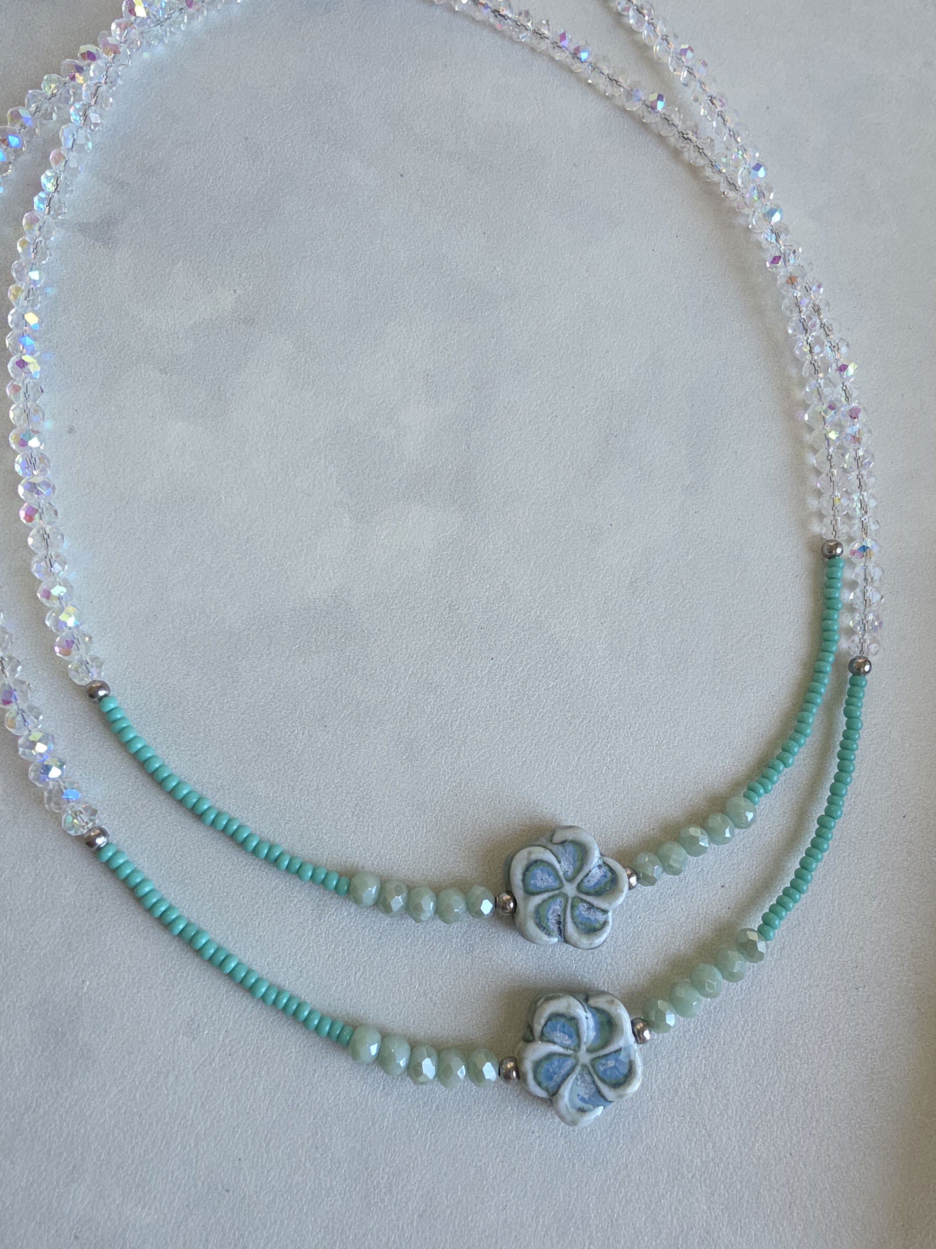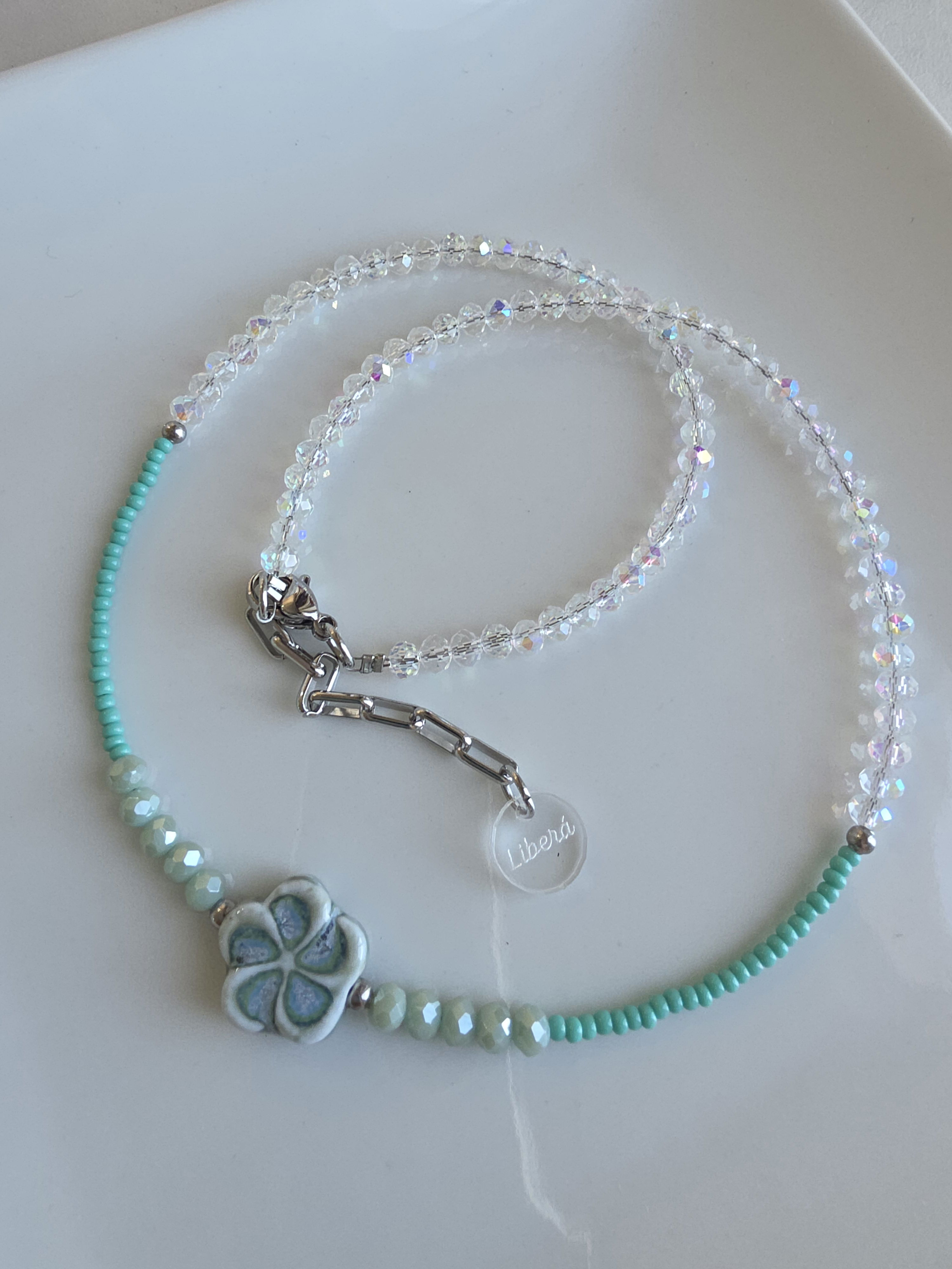 Collar de aproximadamente 40 cm (más cadena de alargue) compuesto por cristales, mostacillas Checas calibradas marca Preciosa y Flor de Cerámica.