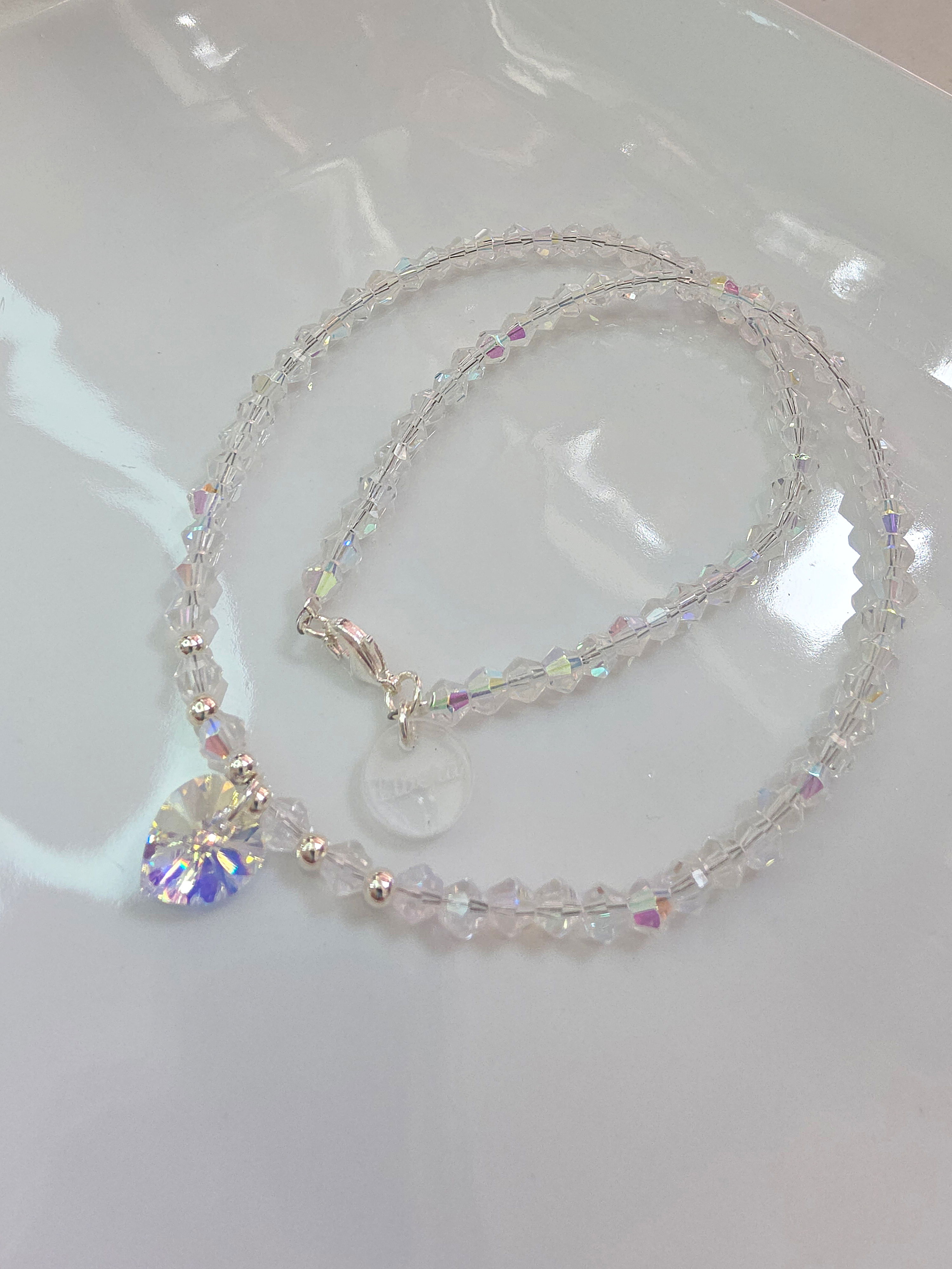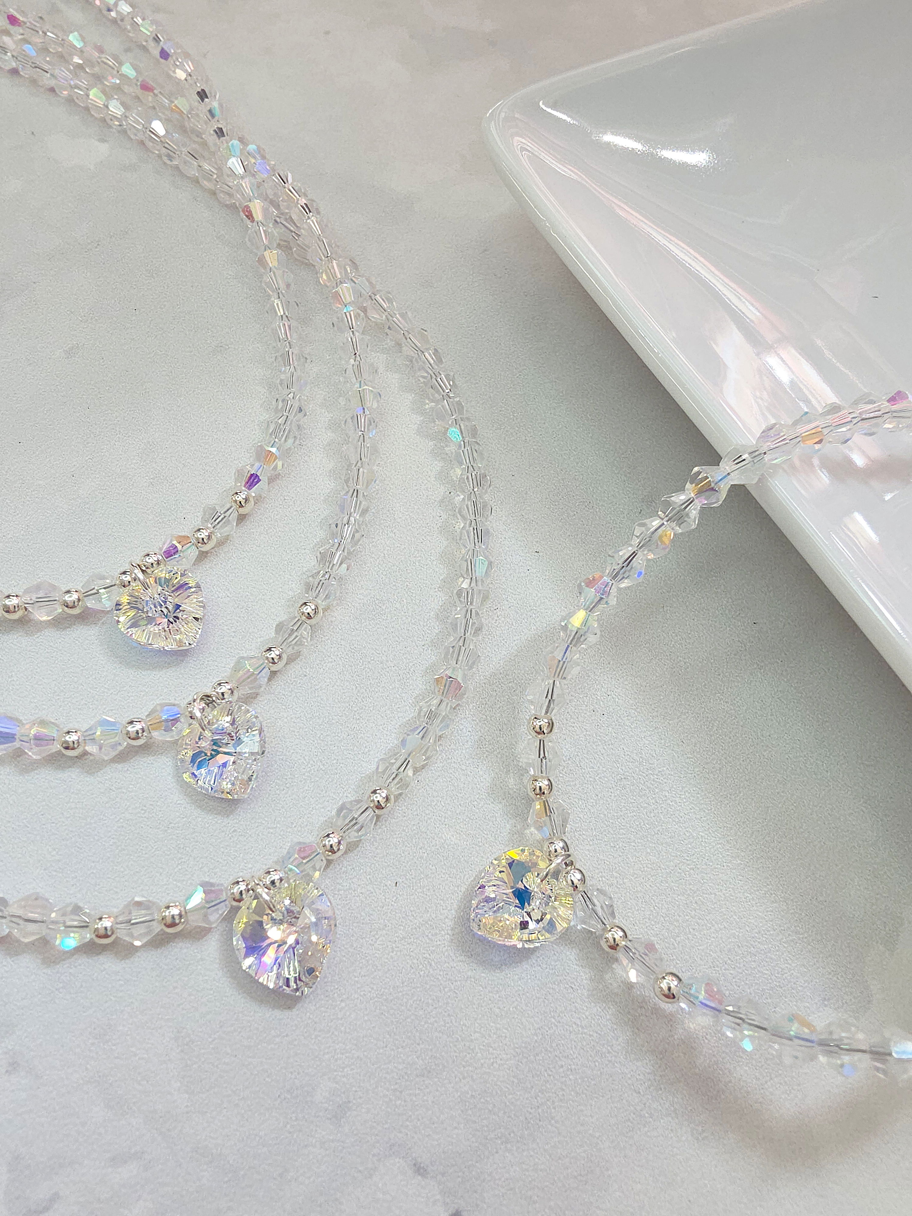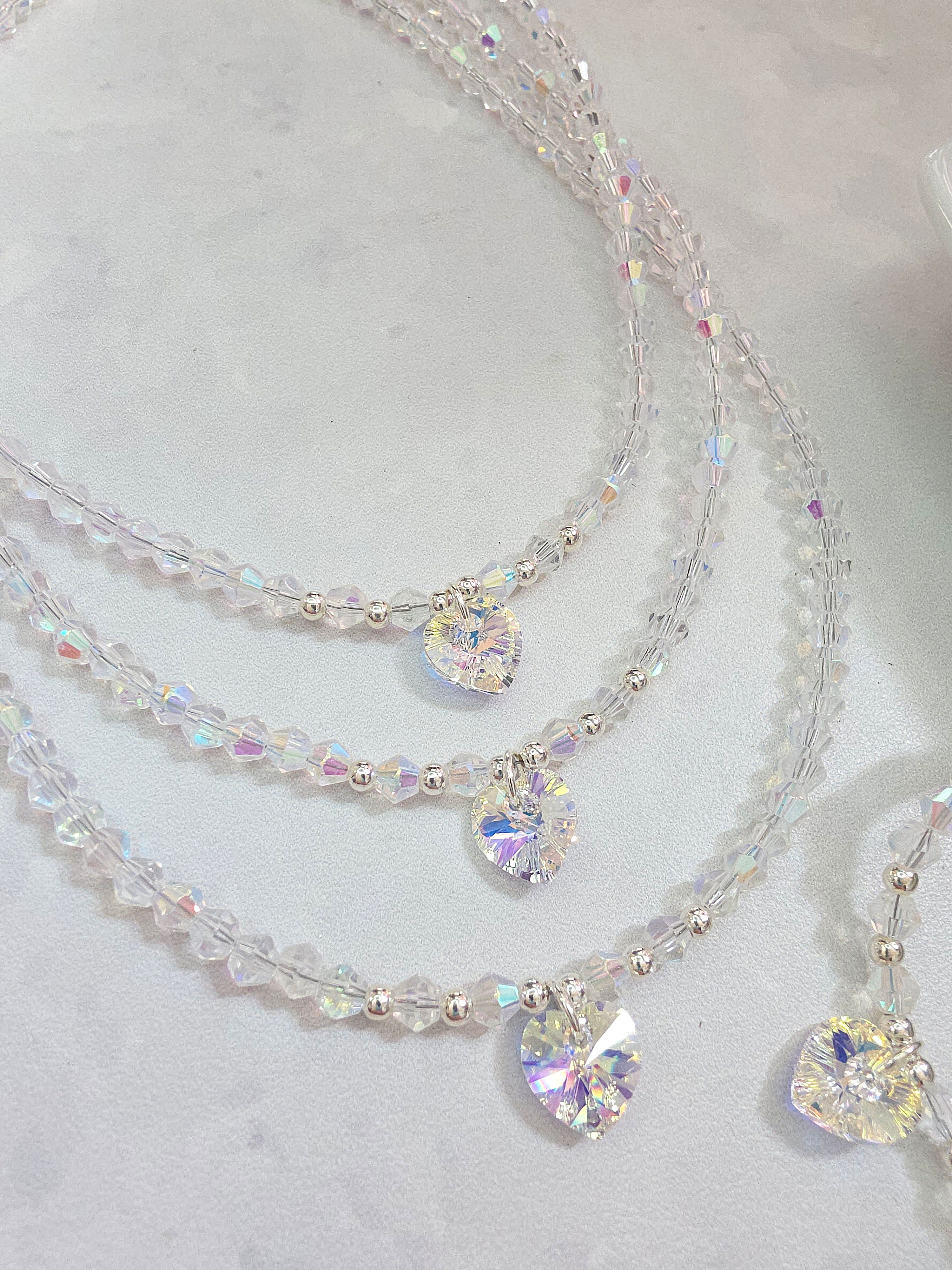 Collar de aproximadamente 40 cm, compuesto por cristales, detalles y cierre de Plata 925. Dije Corazón de Swarovski.