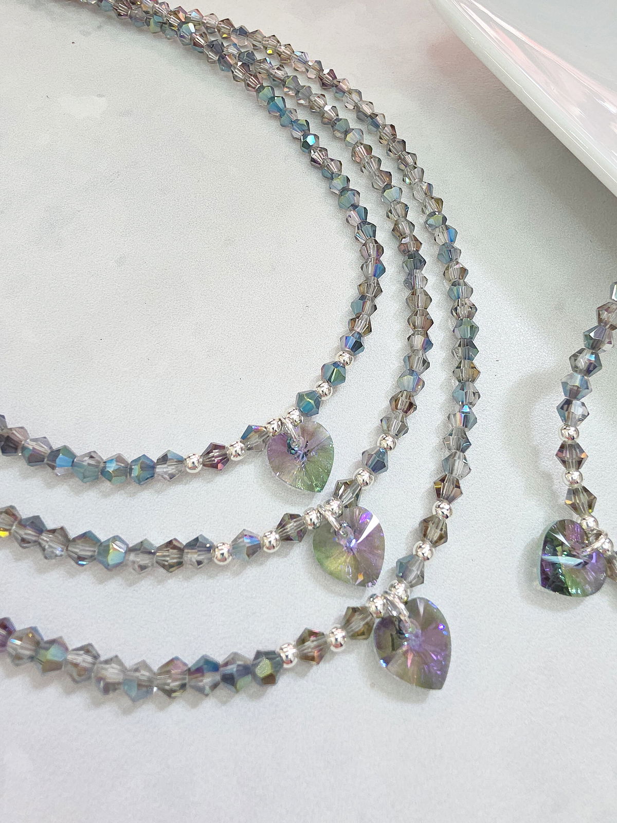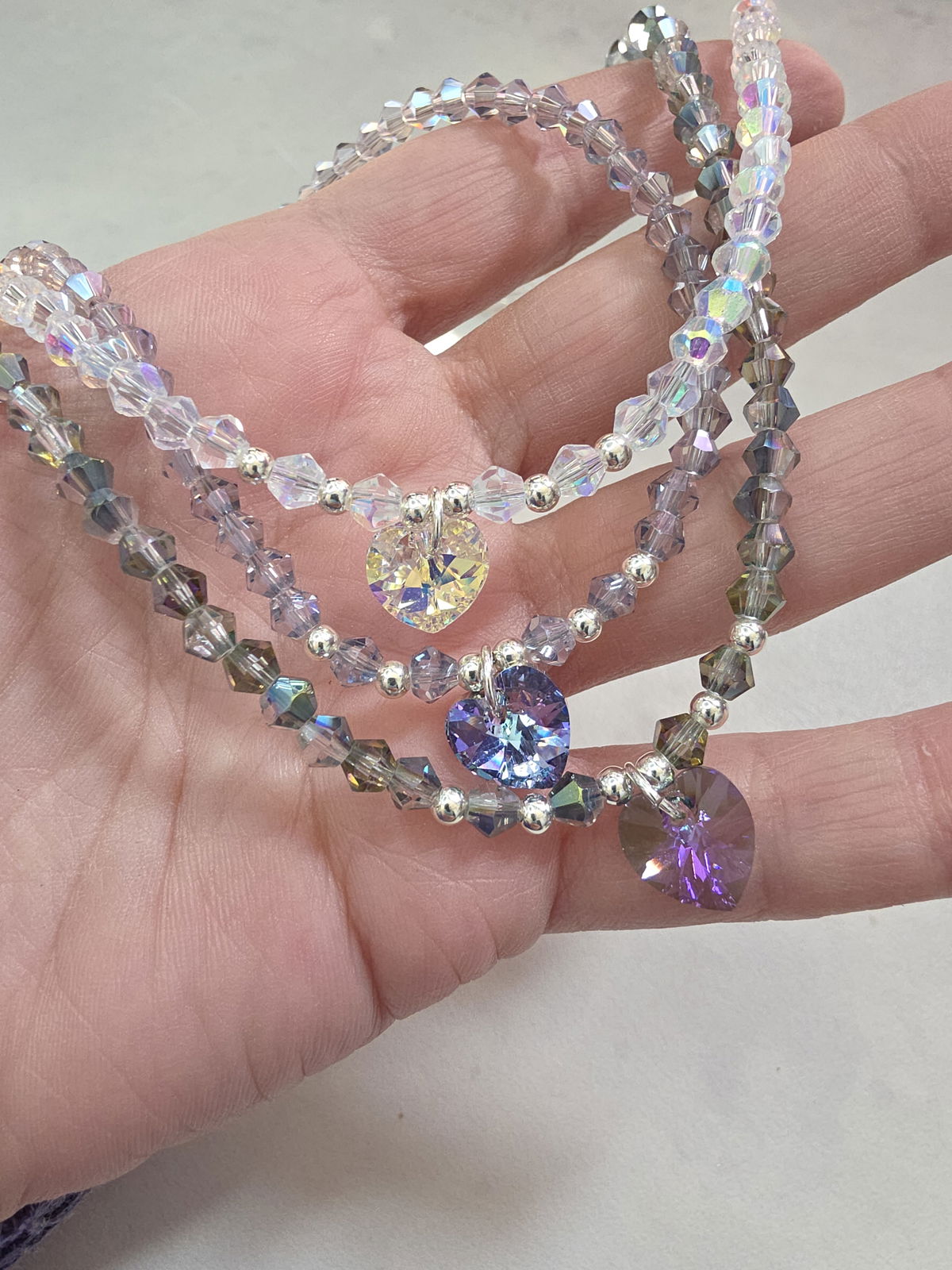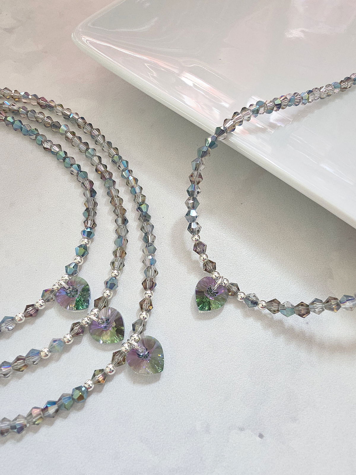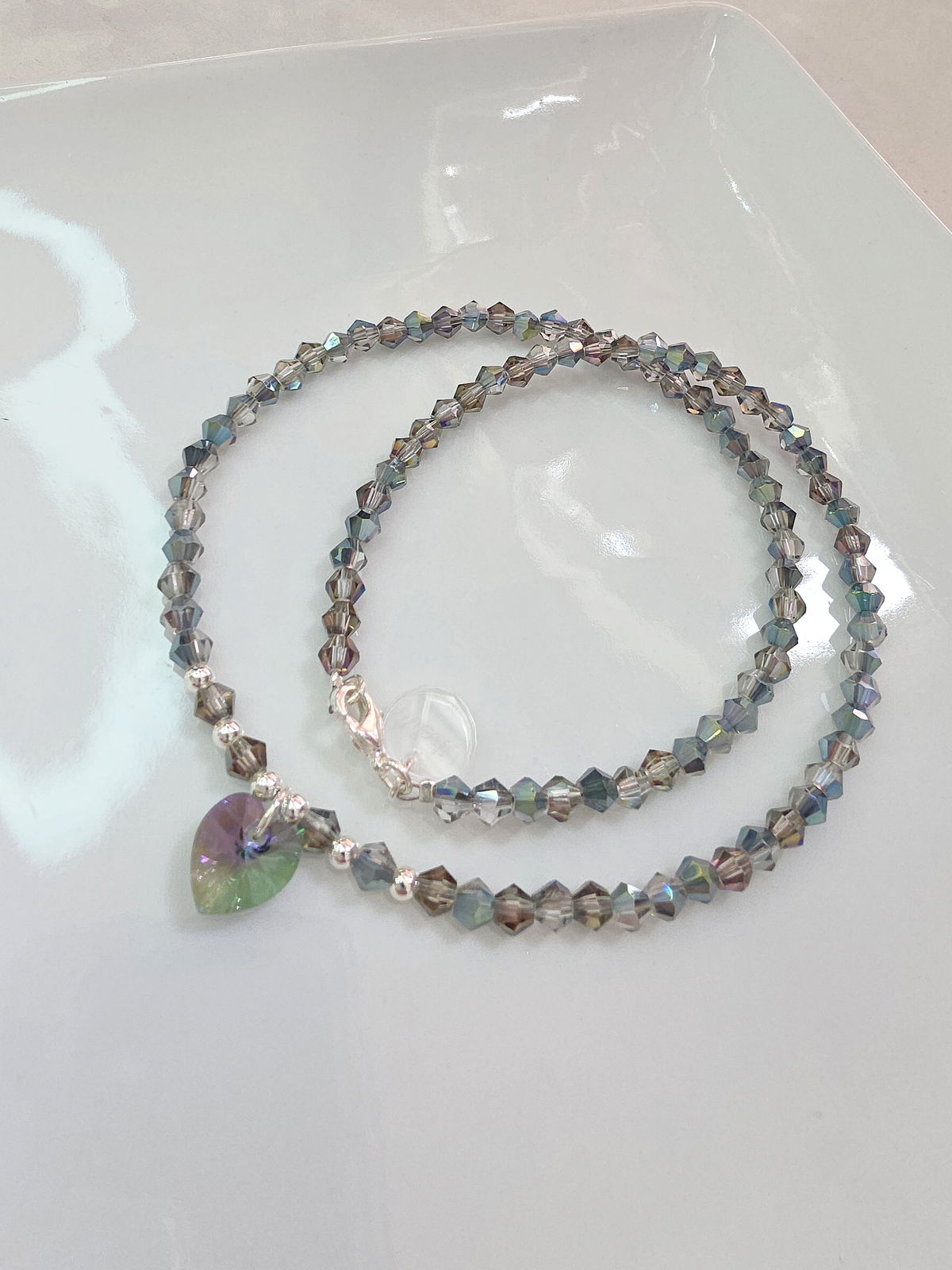 Collar de aproximadamente 40 cm, compuesto por cristales, detalles y cierre de Plata 925. Dije Corazón de Swarovski.