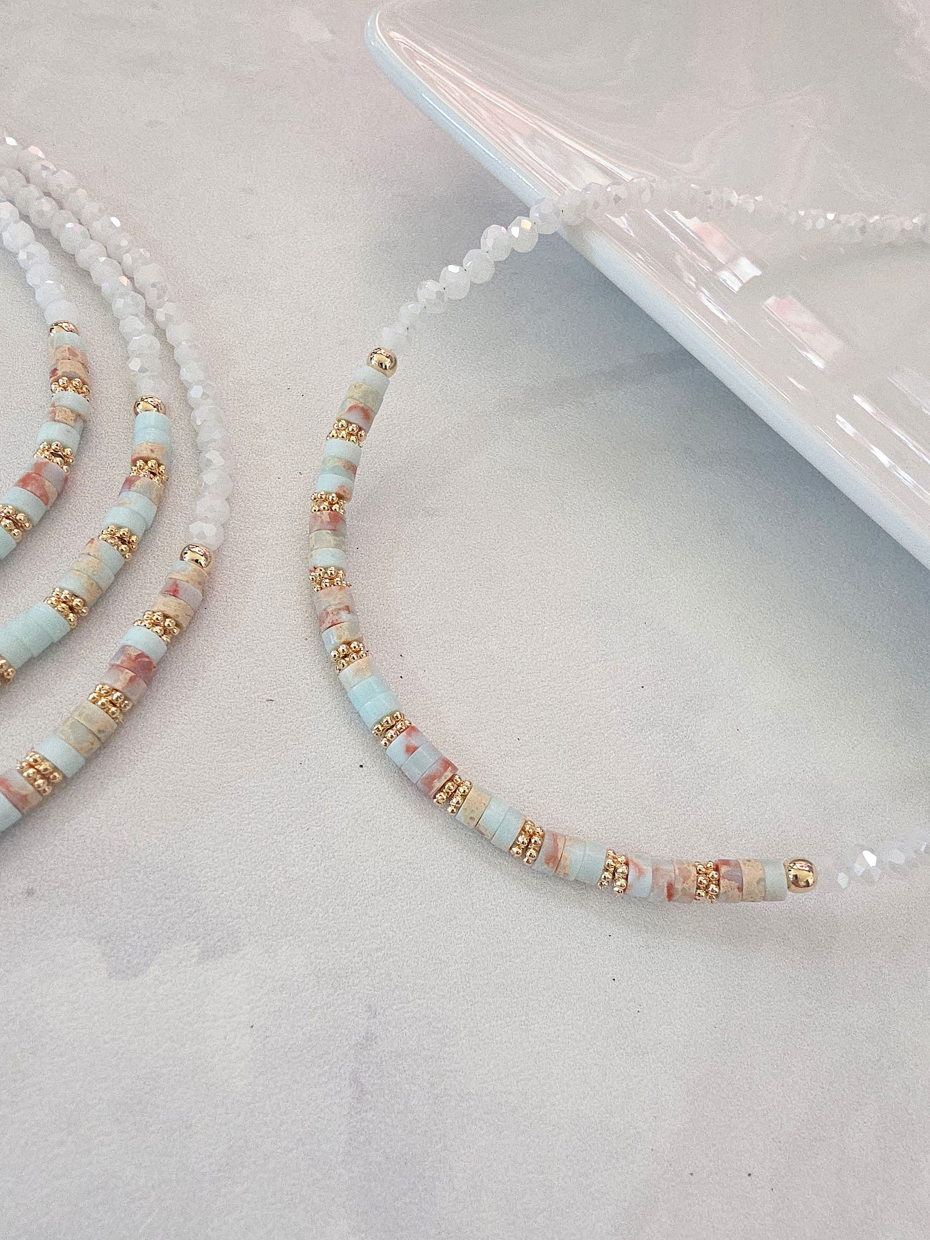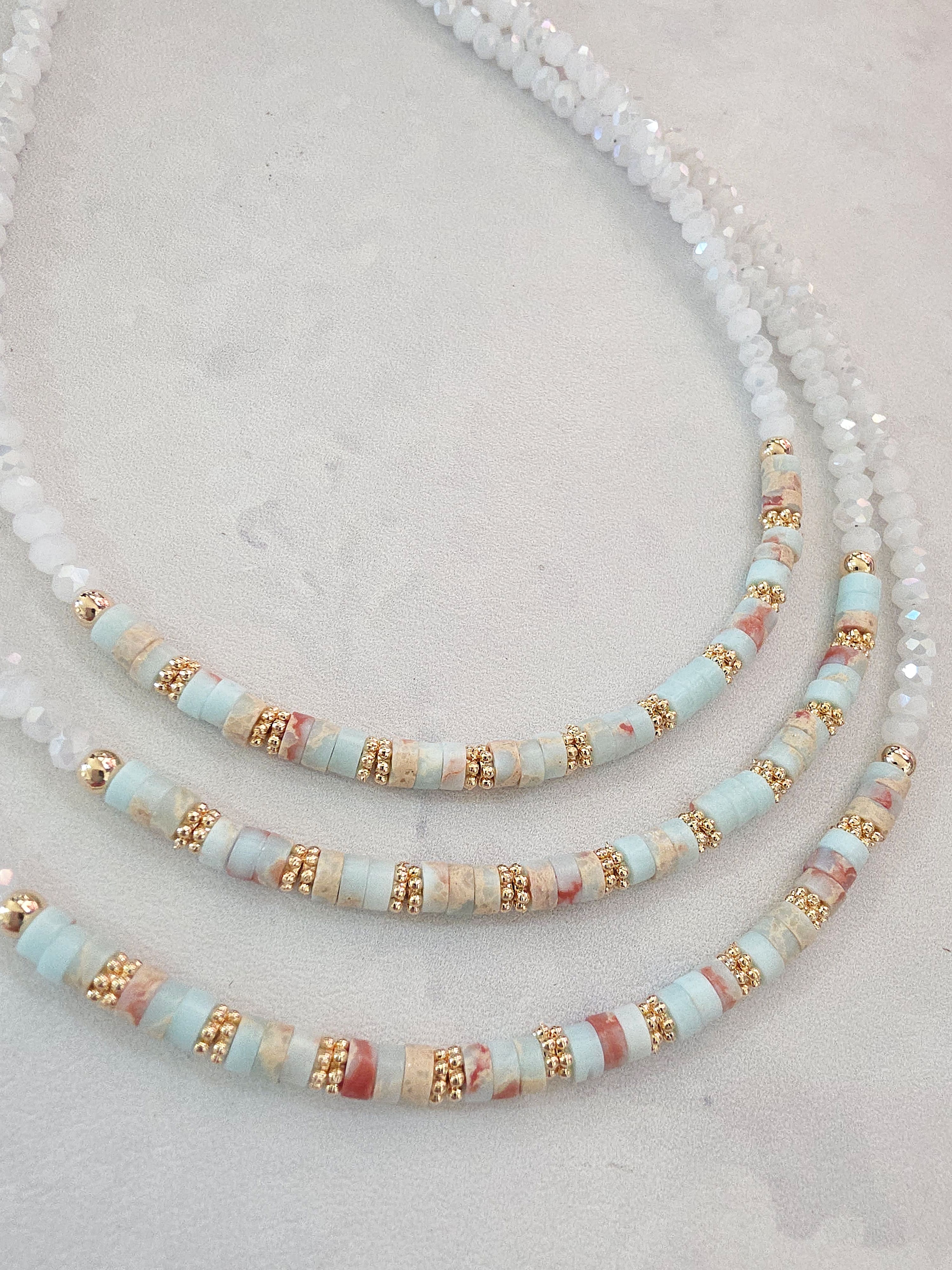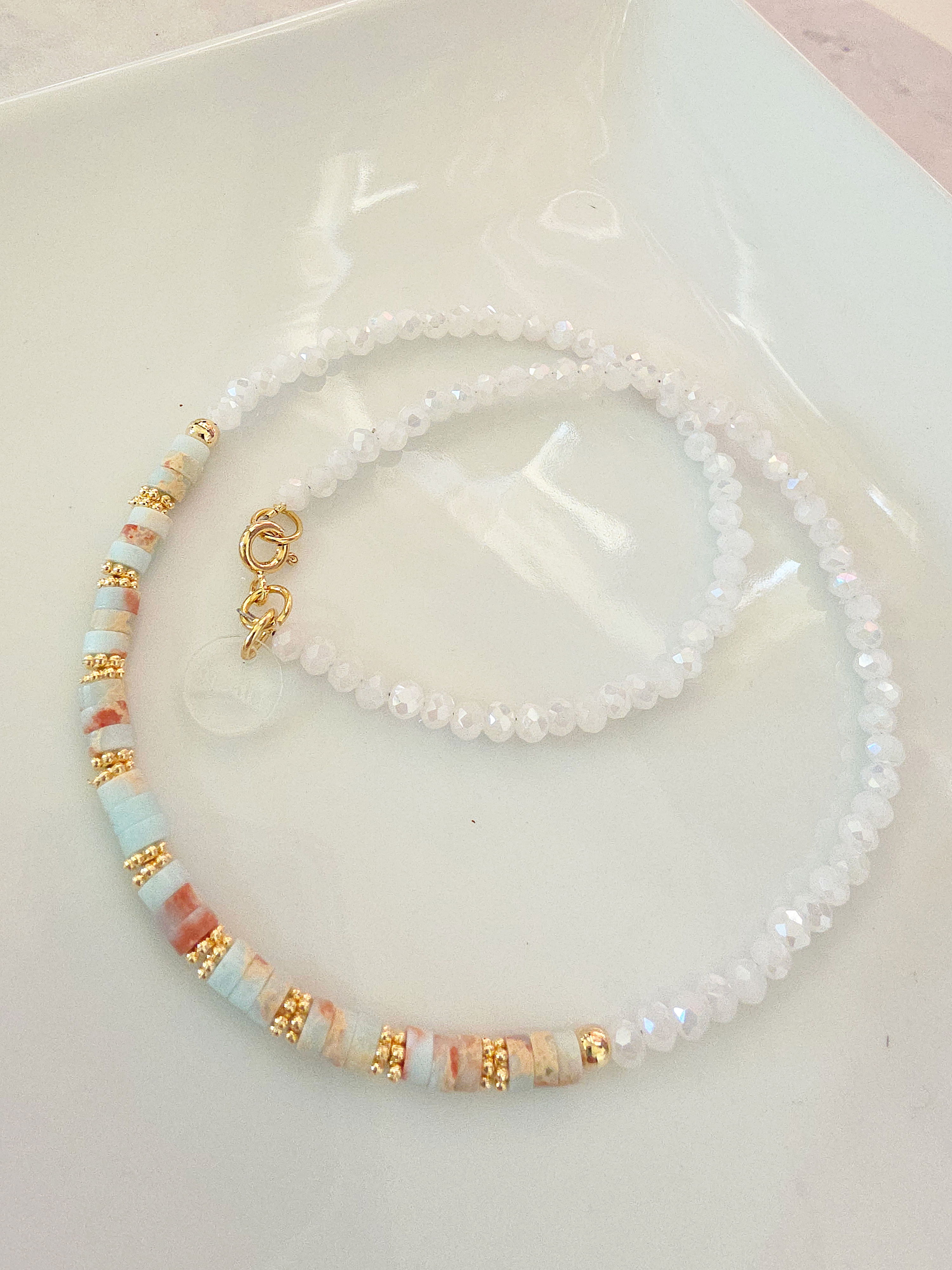 Collar de aproximadamente 40 cm. Compuesto por cristales, bolitas, separadores y cierre de Oro Laminado 18k y arandelas de Piedra Natural Calcita.