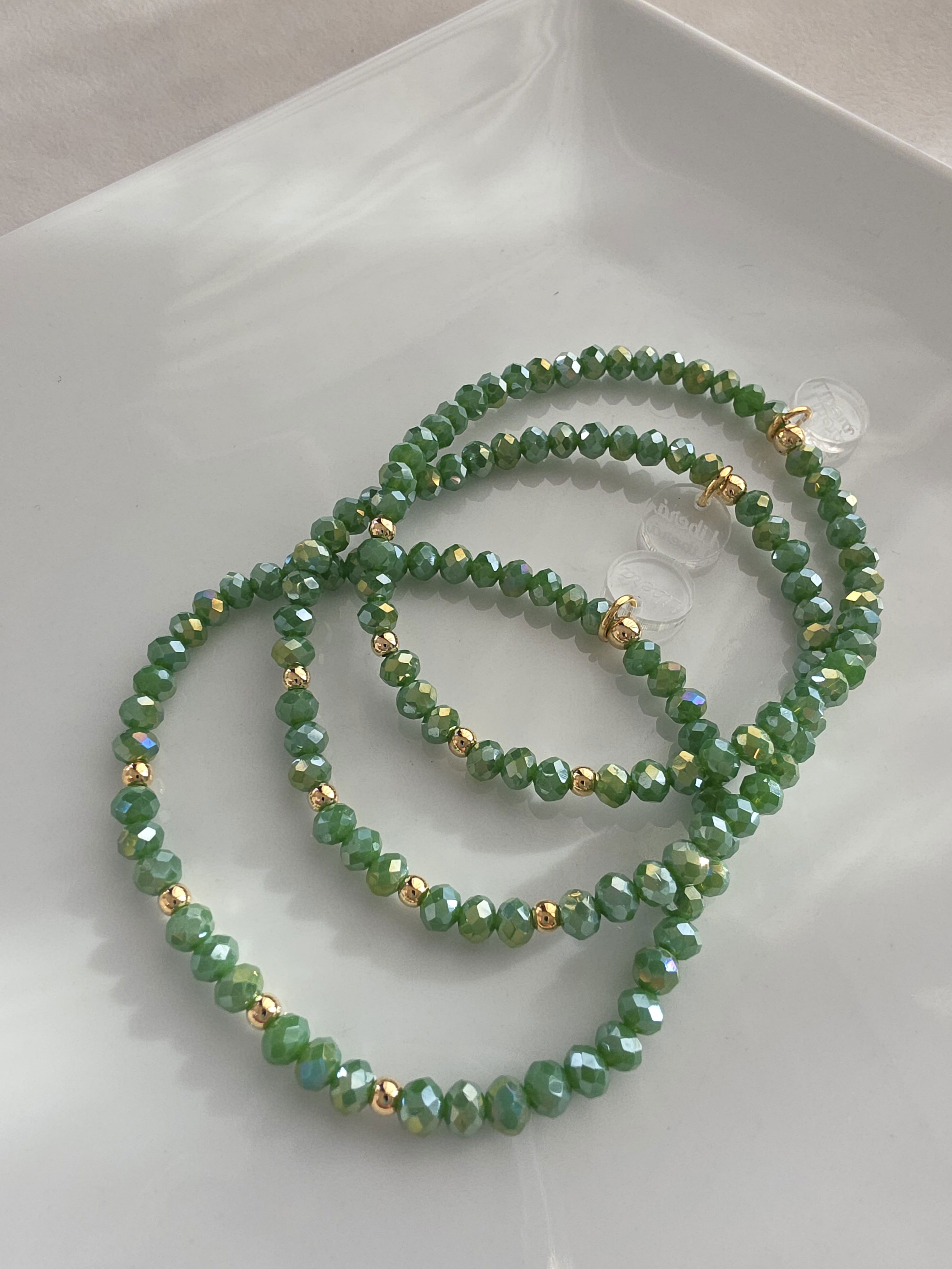 Pulsera elástica compuesta por cristales, bolitas y detalles de Oro Laminado 18k.