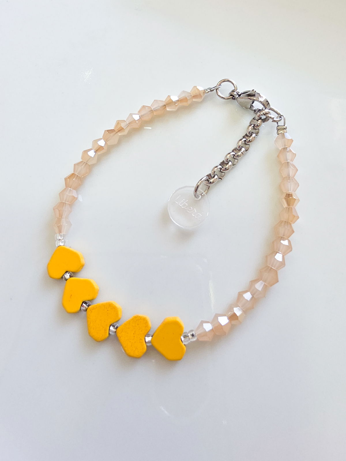 Pulsera compuesta por cristales cónicos, mostacillas Checas calibradas marca Preciosa y corazones de Hematite engomados al tono. Detalles, cierre y cadena de Acero Quirúrgico 316l.