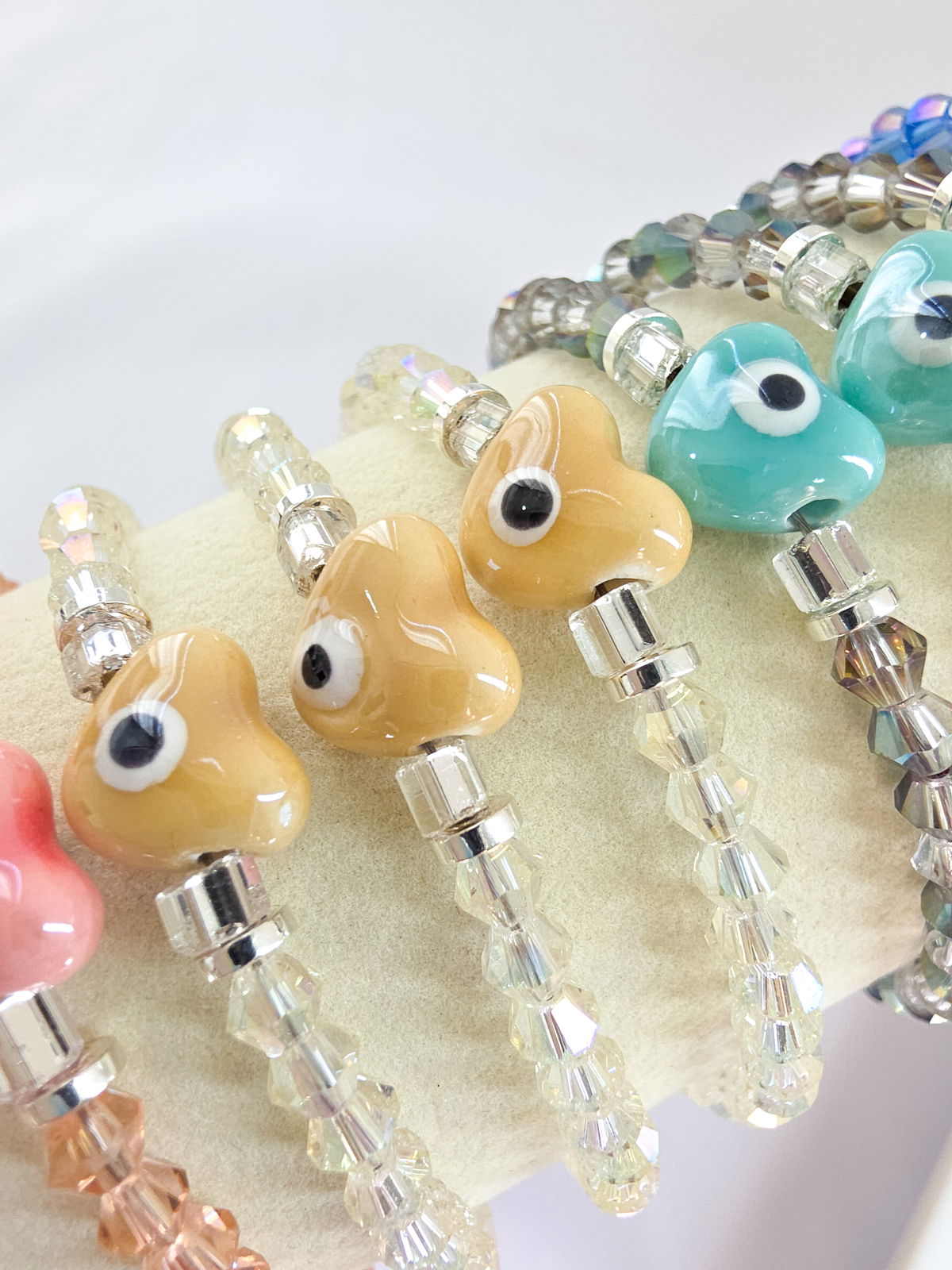 Pulsera compuesta por cristales cónicos, detalles en Hematite y corazón de cerámica esmaltado. Detalles, cierre y cadena de Acero Quirúrgico 316l.