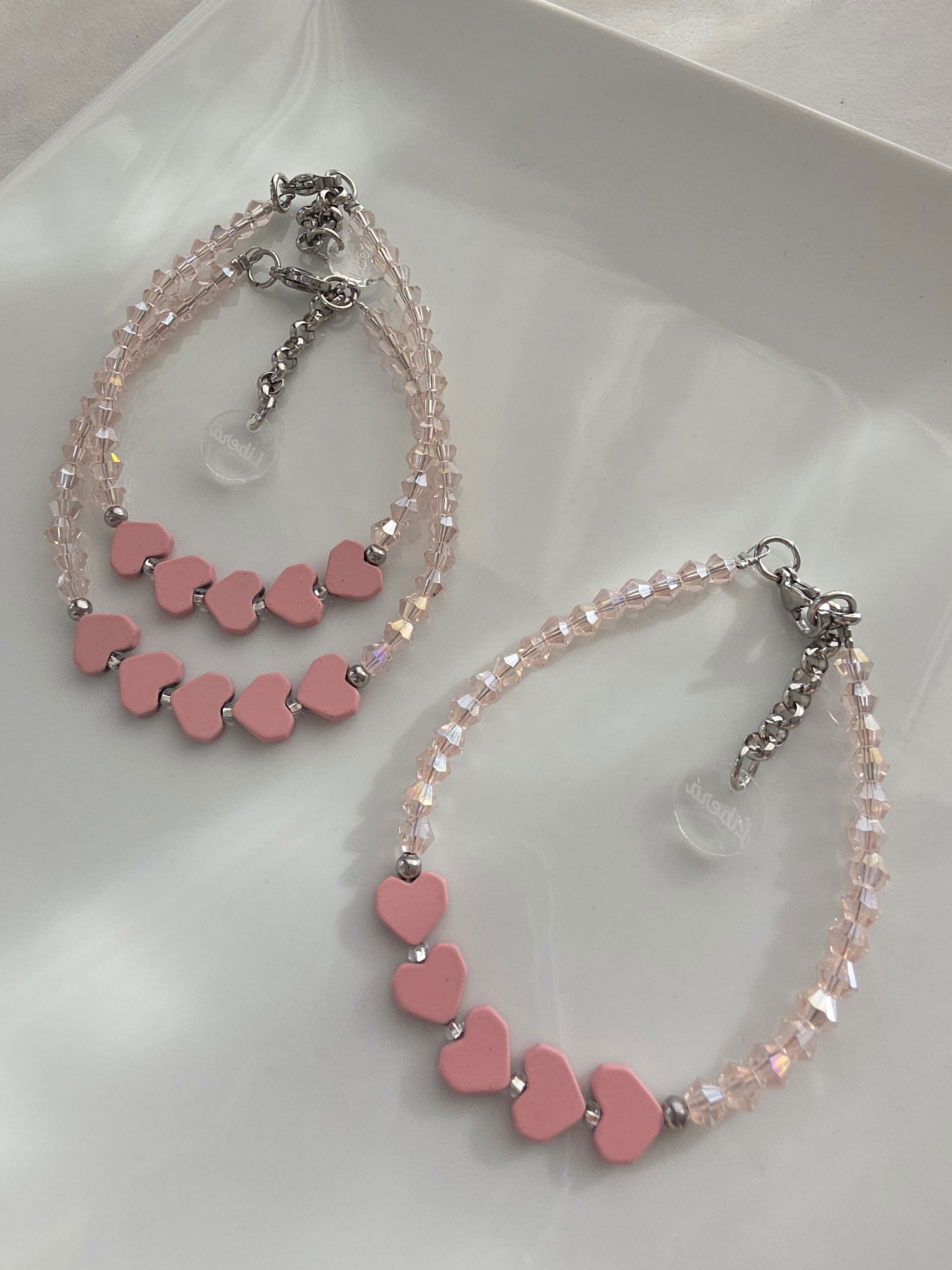 Pulsera compuesta por cristales cónicos, mostacillas Checas calibradas marca Preciosa y corazones de Hematite engomados al tono. Detalles, cierre y cadena de Acero Quirúrgico 316l.