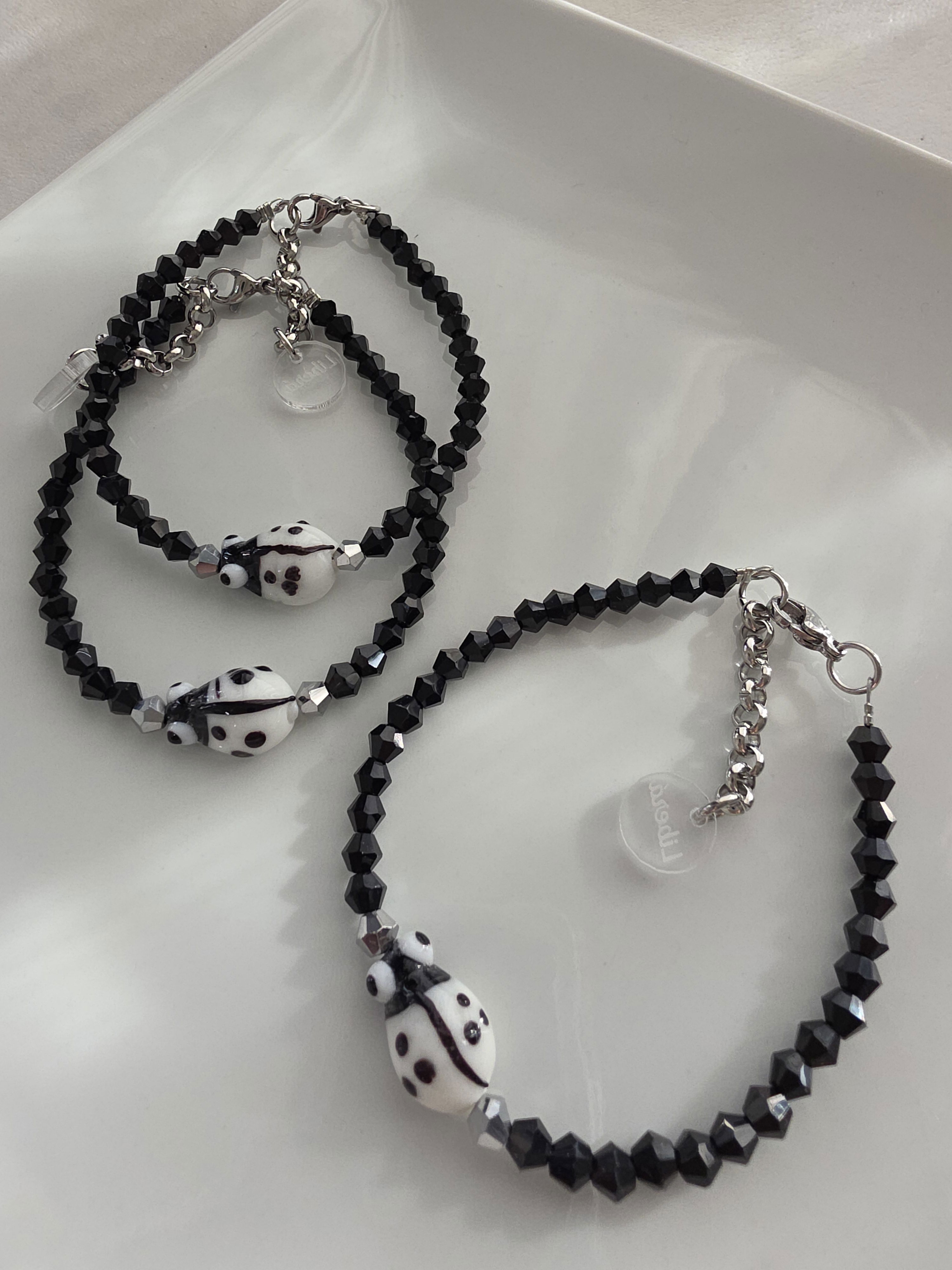 Pulsera compuesta por cristales cónicos y vaquita de san Antonio de Murano.