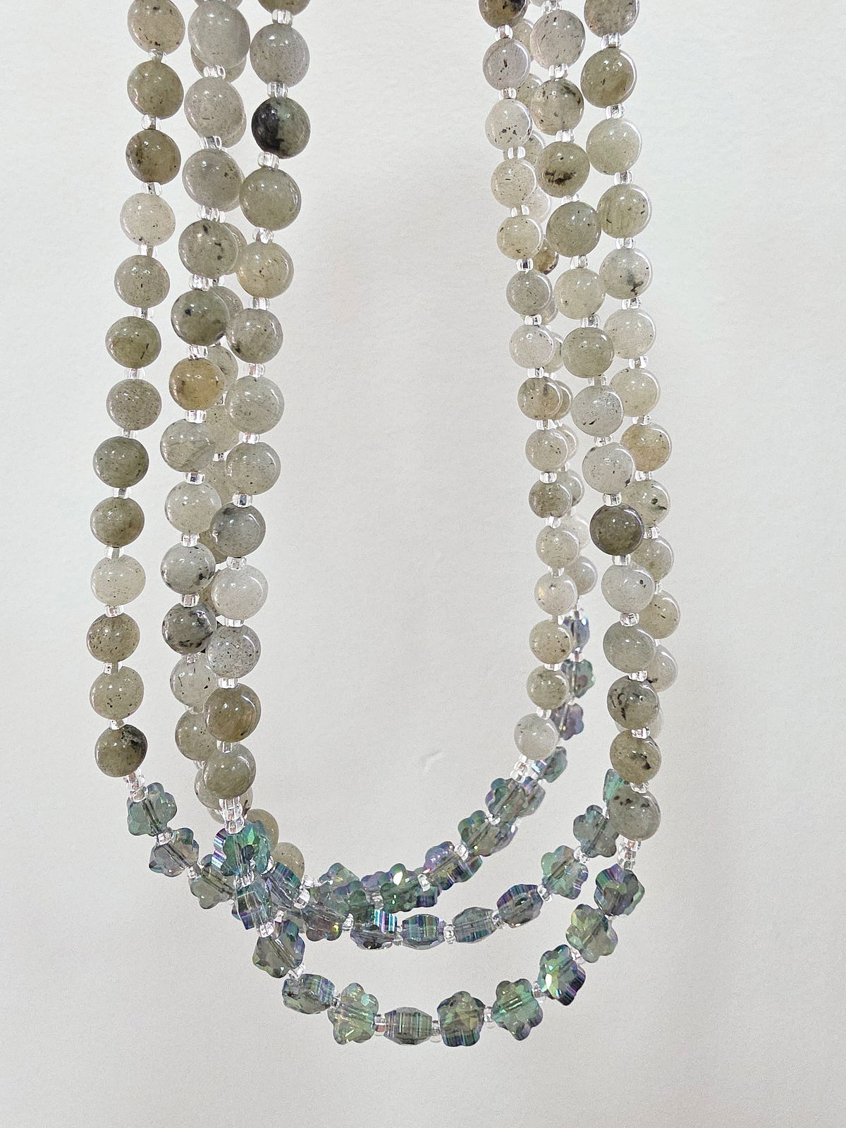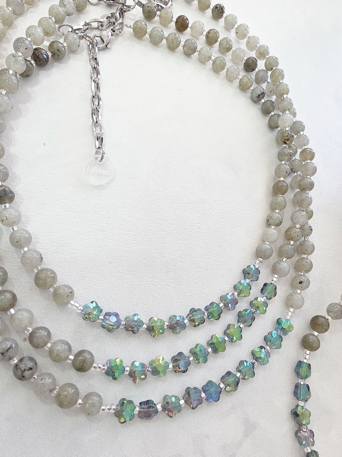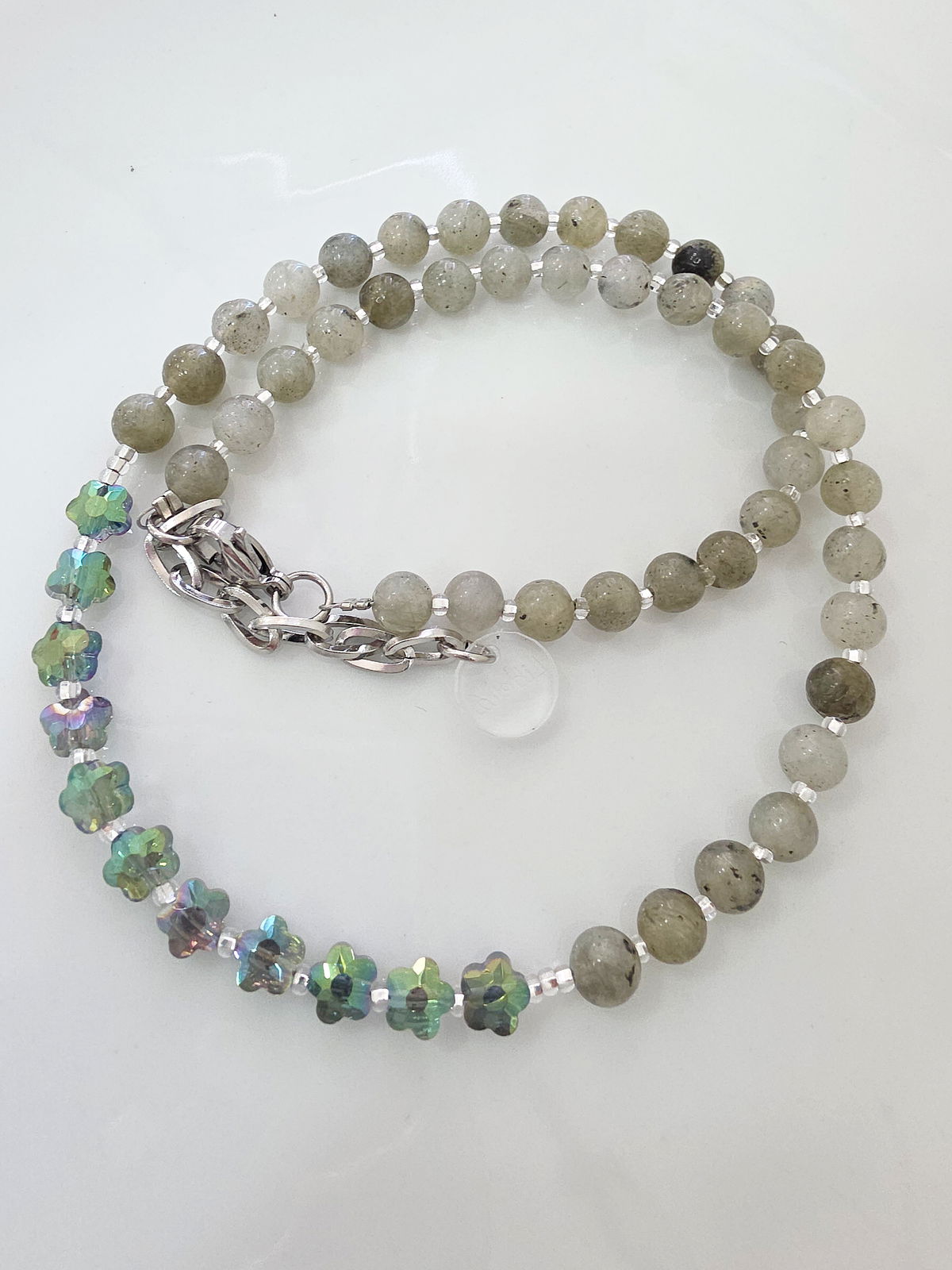 Collar de aproximadamente 40 cm (más cadena de alargue) compuesto en su totalidad por Piedras Naturales de Labradorita, en el centro Florcitas de Cristal. Detalles, cierre y cadena de Alargue de Acero Quirúrgico 316l. Apto agua e hipoalergénico.