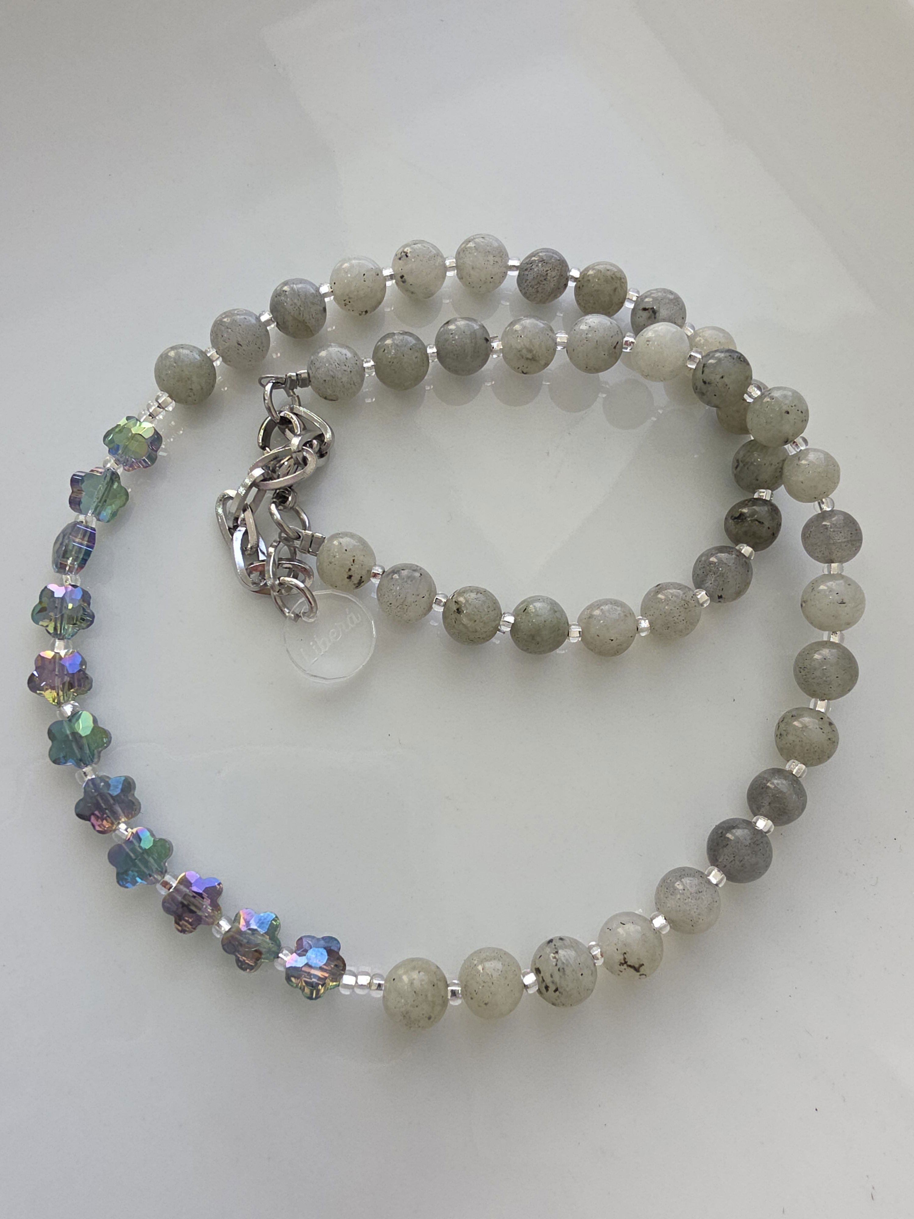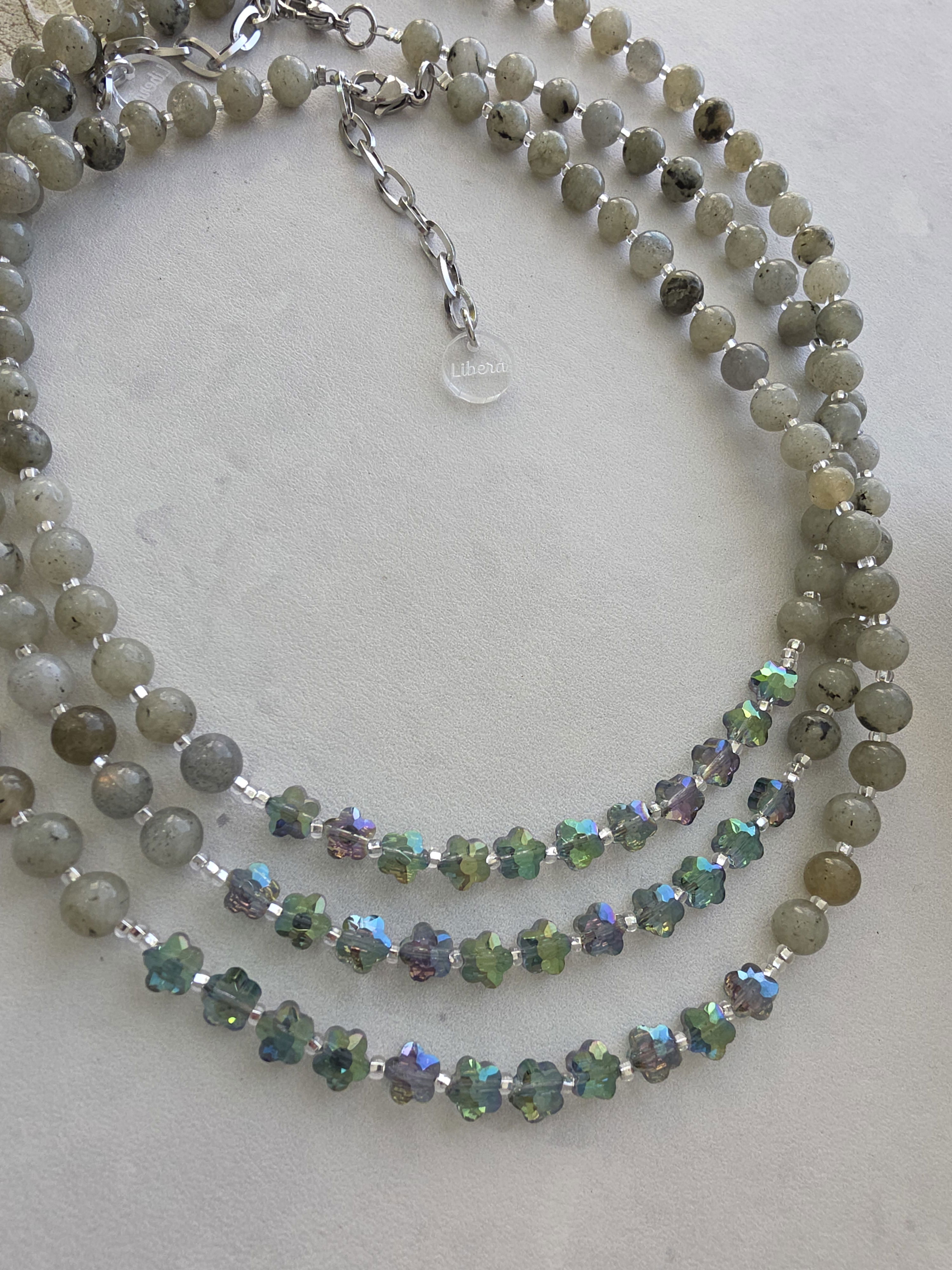 Collar de aproximadamente 40 cm (más cadena de alargue) compuesto en su totalidad por Piedras Naturales de Labradorita, en el centro Florcitas de Cristal. Detalles, cierre y cadena de Alargue de Acero Quirúrgico 316l. Apto agua e hipoalergénico.