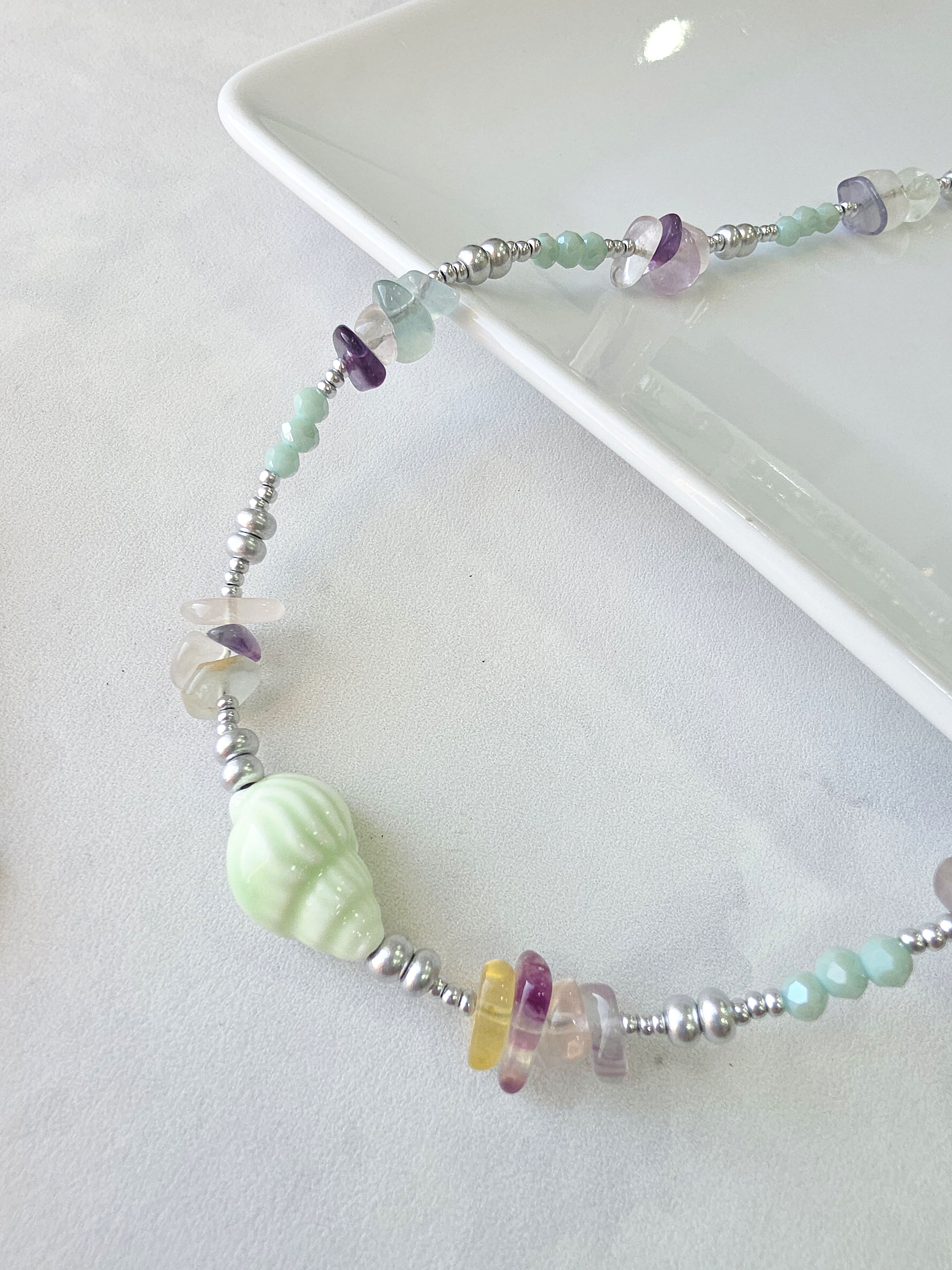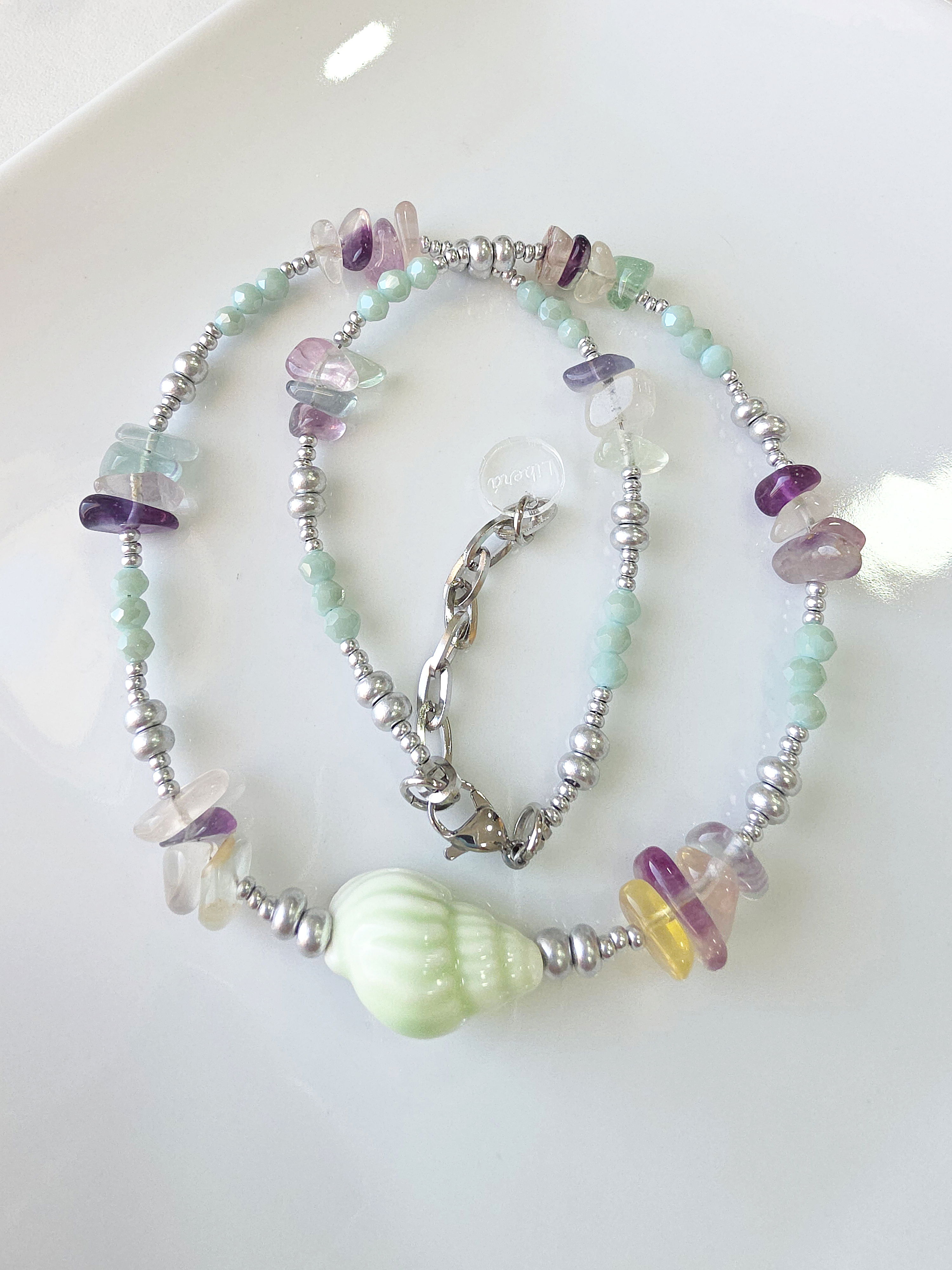 Collar de aproximadamente 40 cm (más cadena de alargue) compuesto por mostacillas y mostacillones Checos marca Preciosa, escallas de Piedra Natural Fluorita, donitas de Cristal y Caracol de Cerámica. Detalles, terminación y cadena de Acero Quirúrgico.