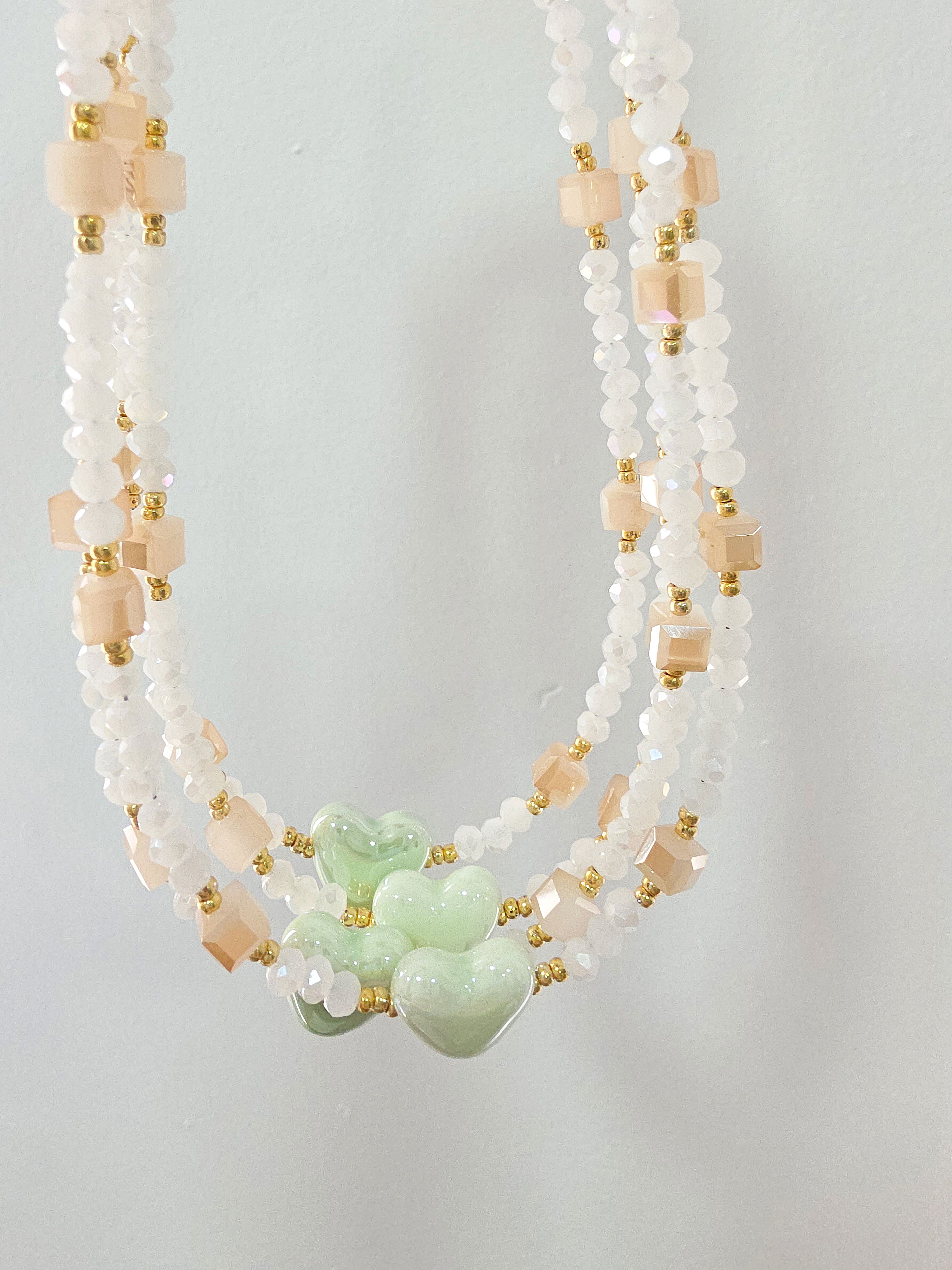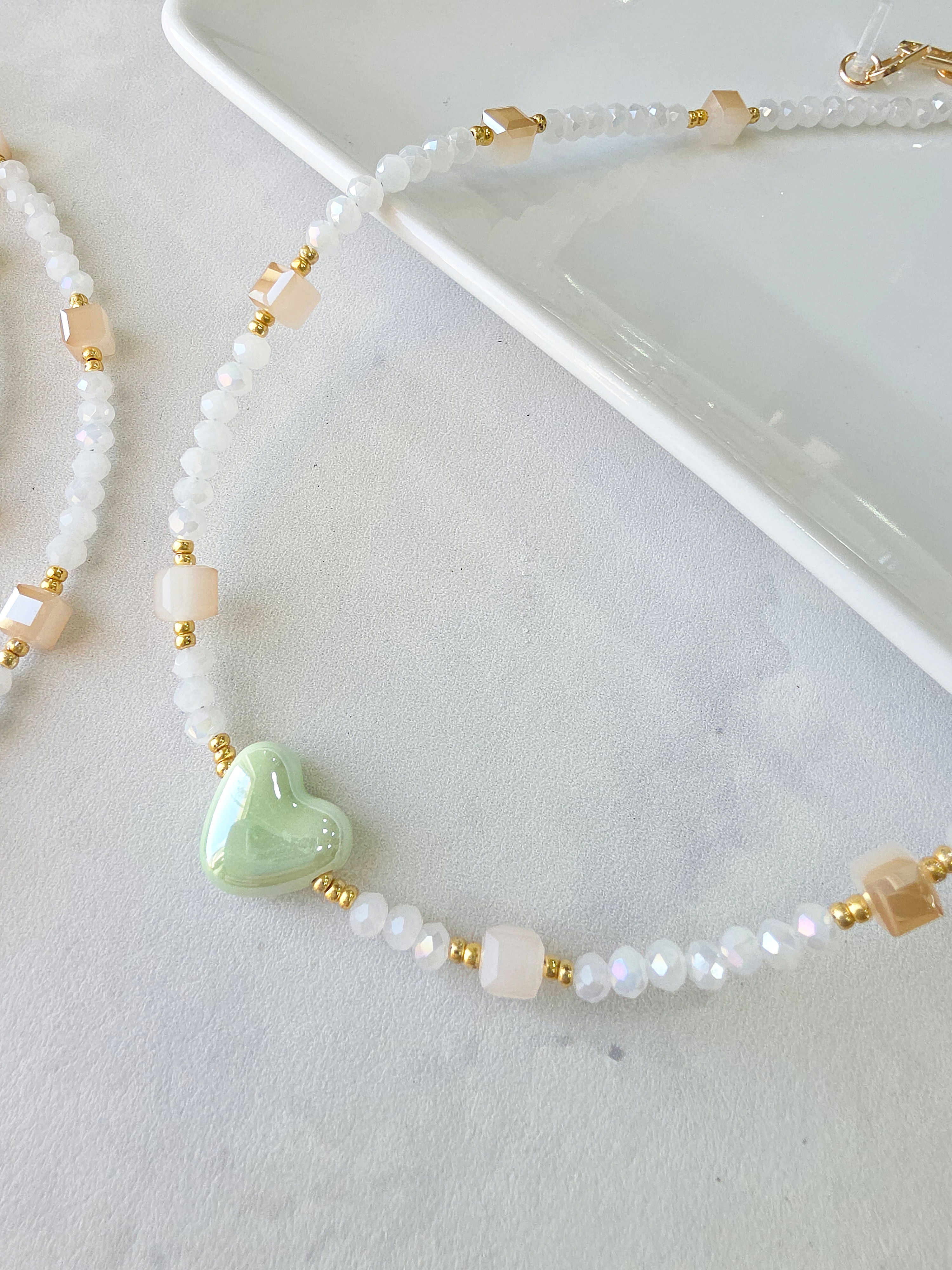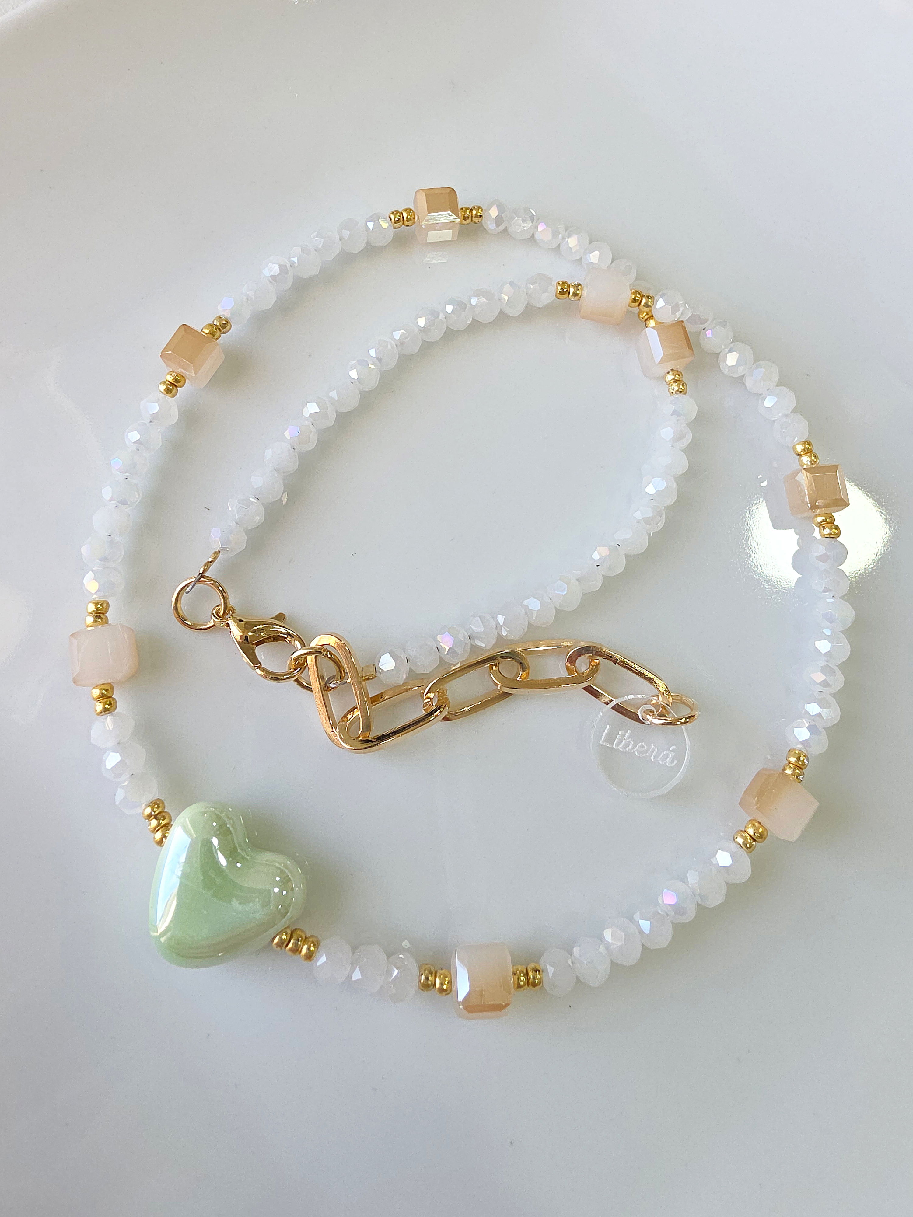 Collar de aproximadamente 40 cm (más cadena de alargue) compuesto por donitas de cristal, mostacillas Checas calibradas marca Preciosa, cubos de cristal y corazón de cerámica.