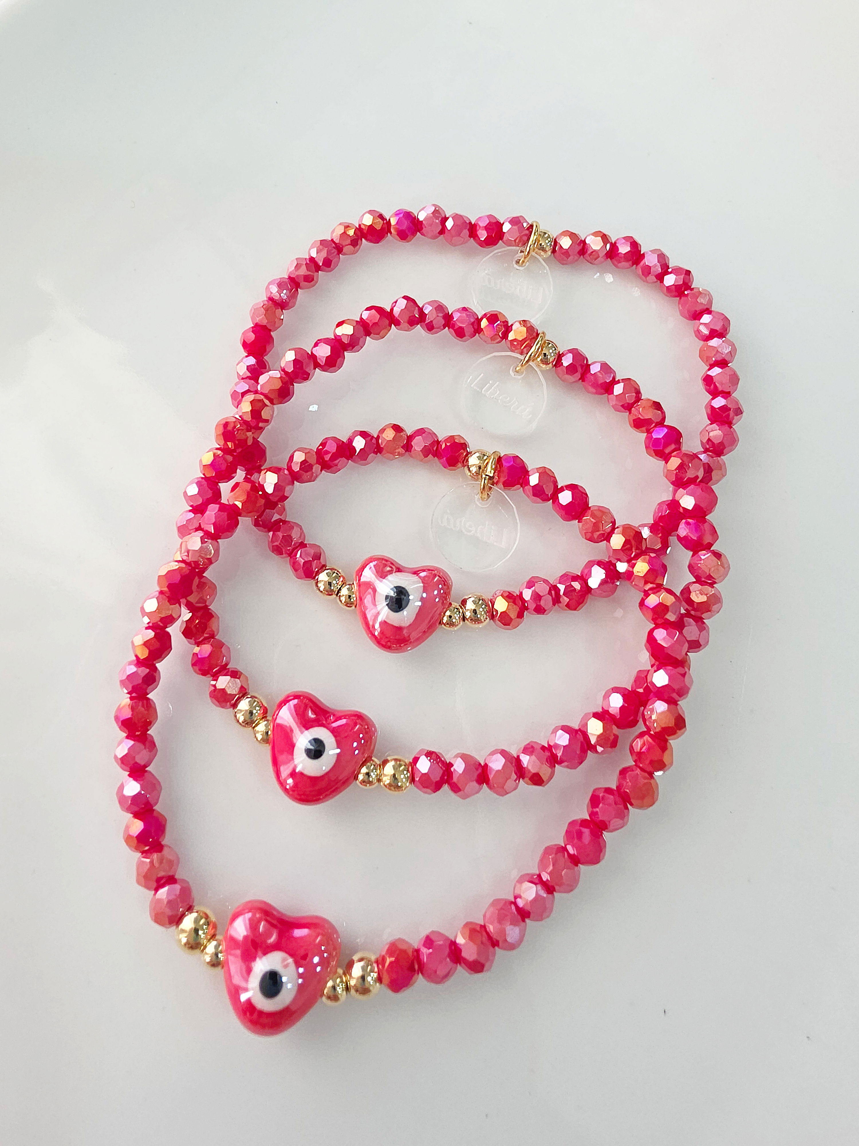 Pulsera elástica compuesta por cristales y corazón de cerámica esmaltado. bolitas y detalles de Oro Laminado 18k
