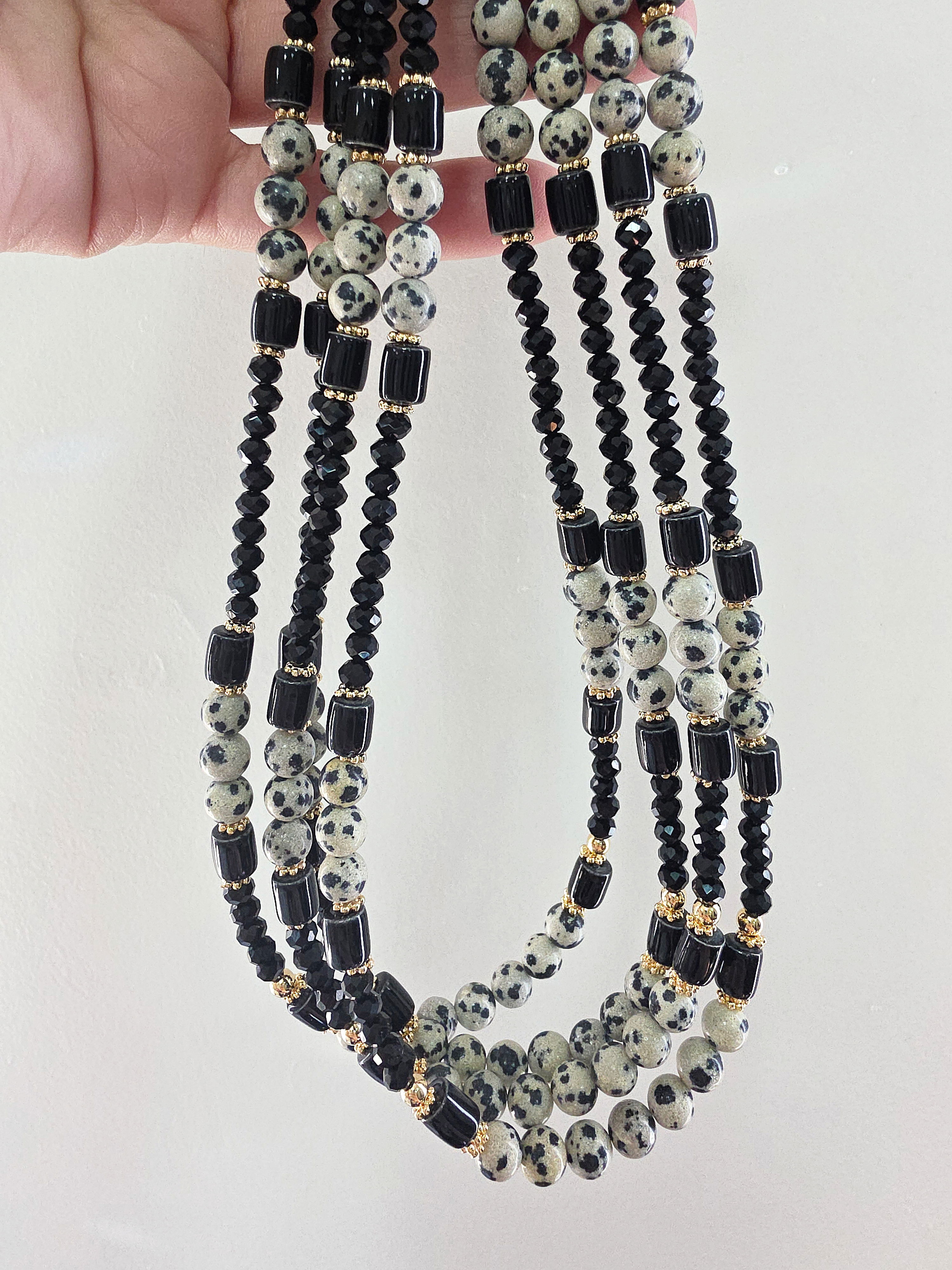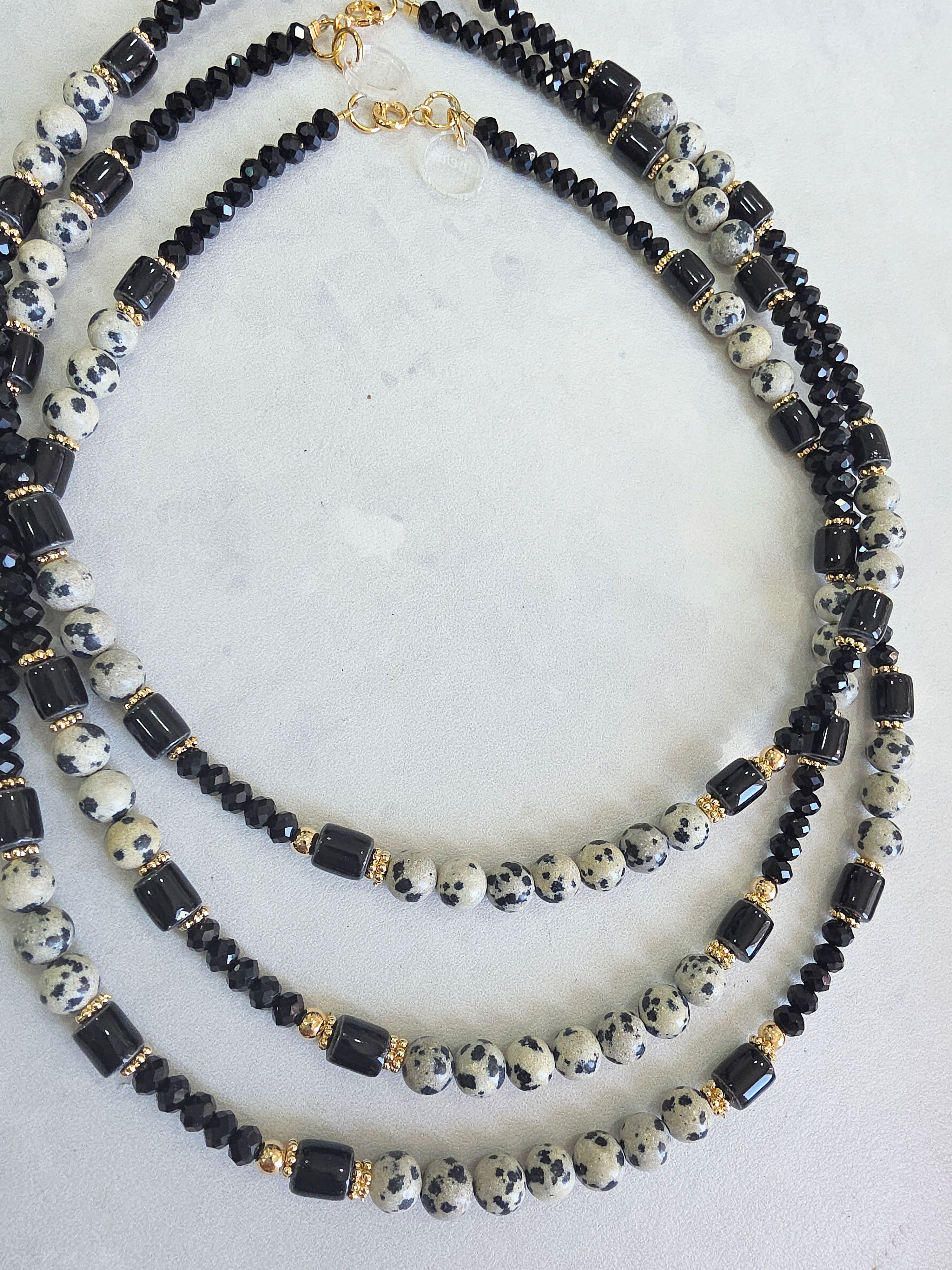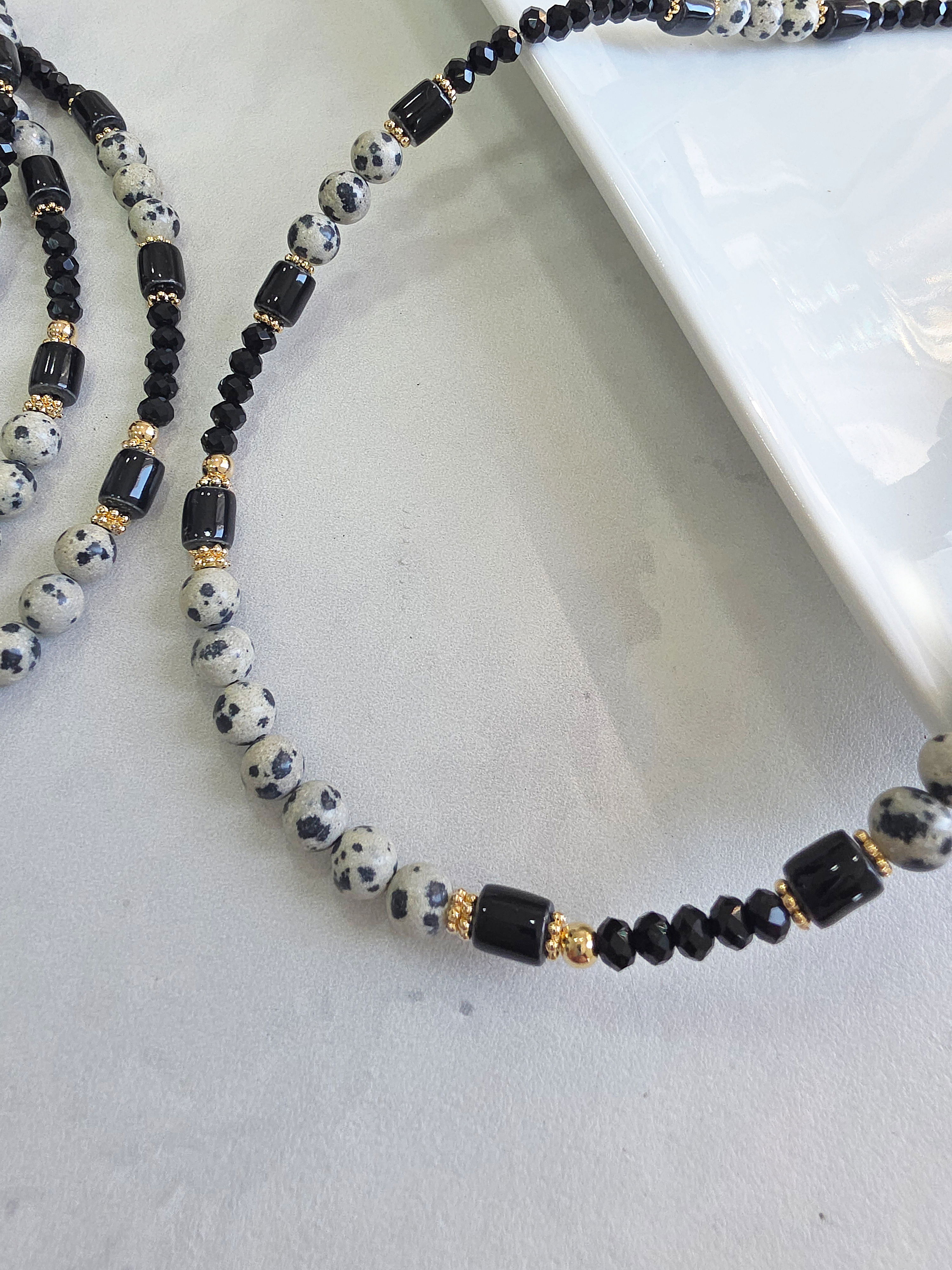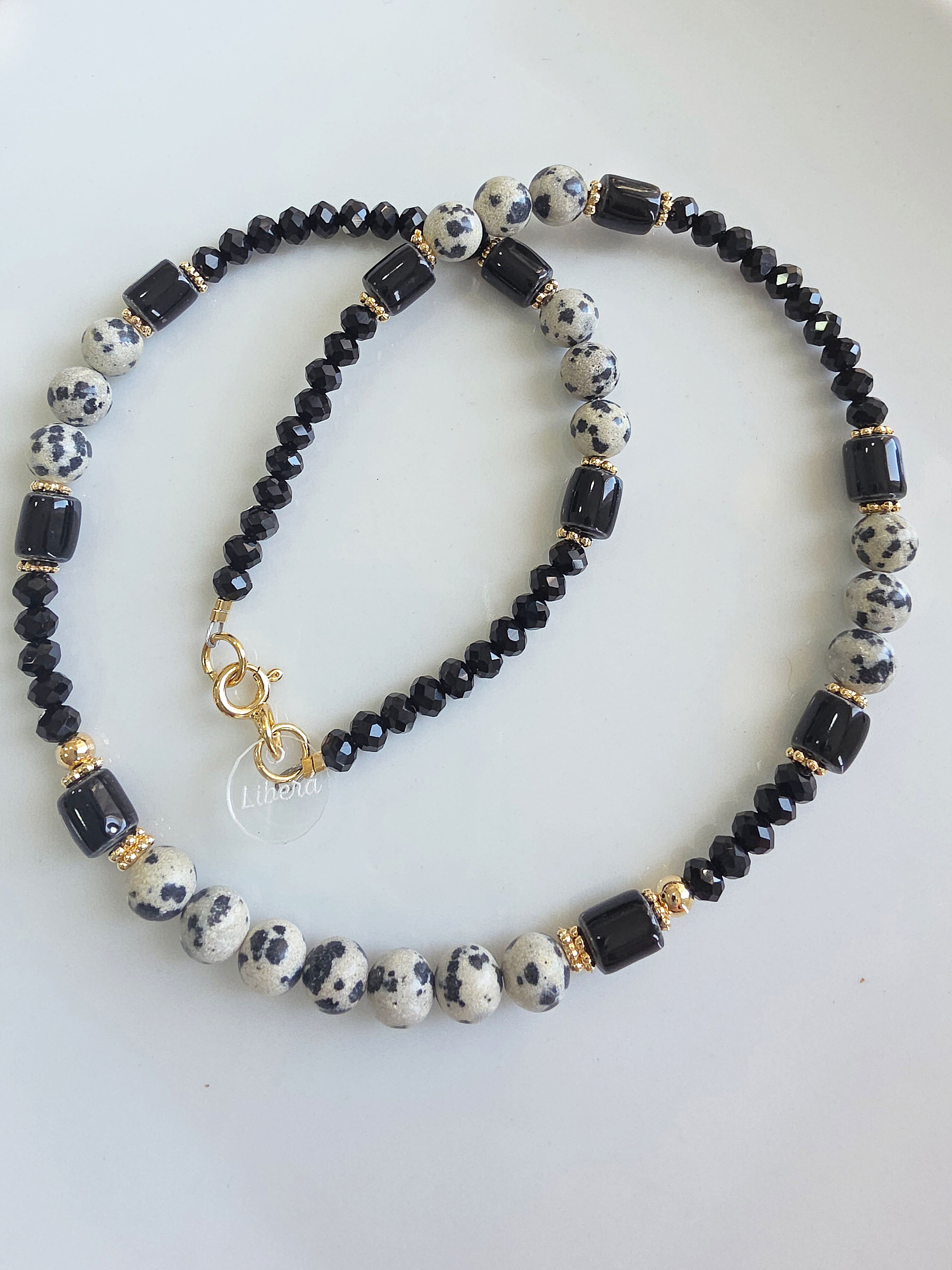 Collar de aproximadamente 40 cm, compuesto por cristales, tubos de cerámica y Piedras Naturales Jaspe Dálmata. Detalles y terminación de Oro Laminado 18k.