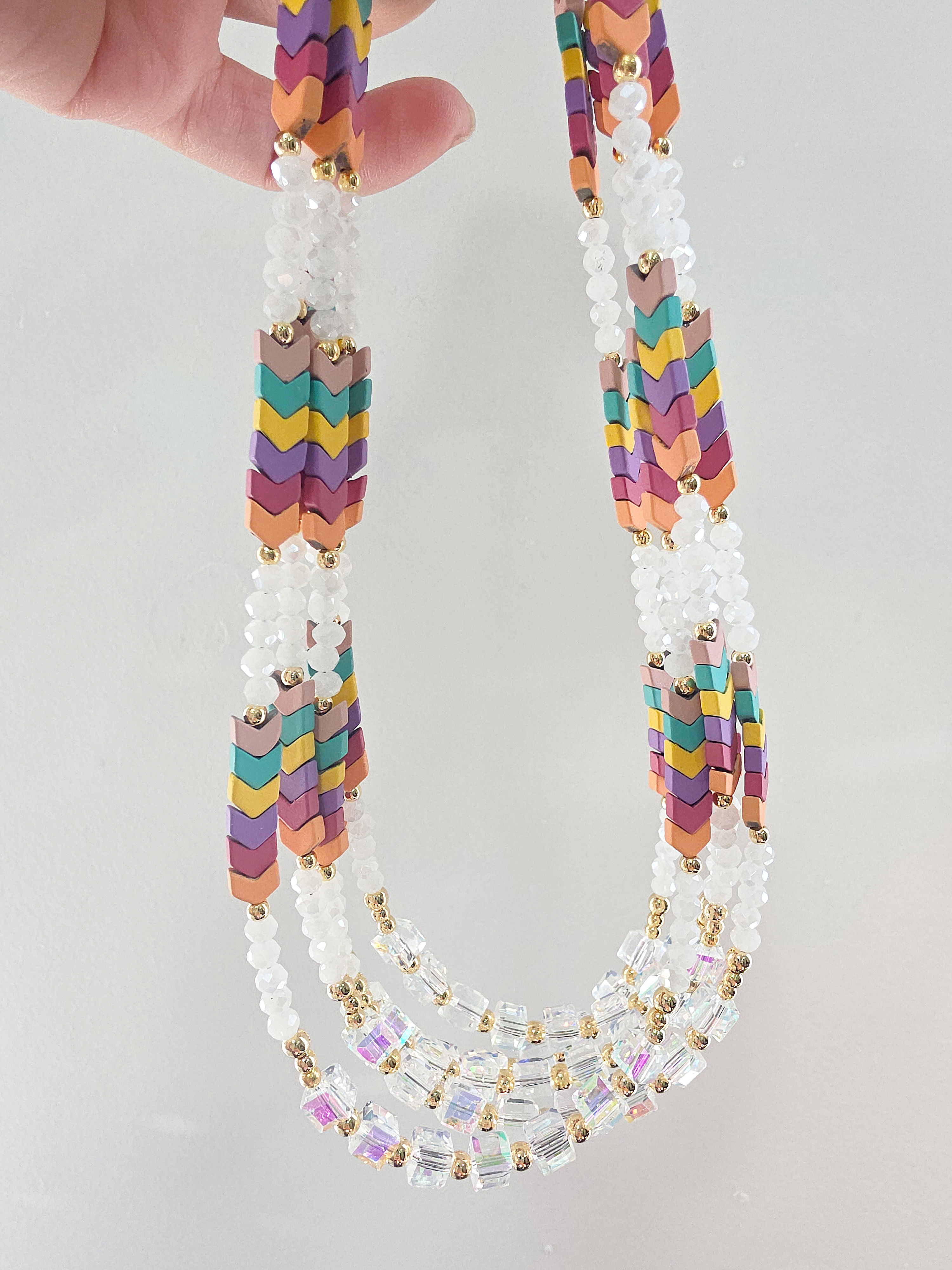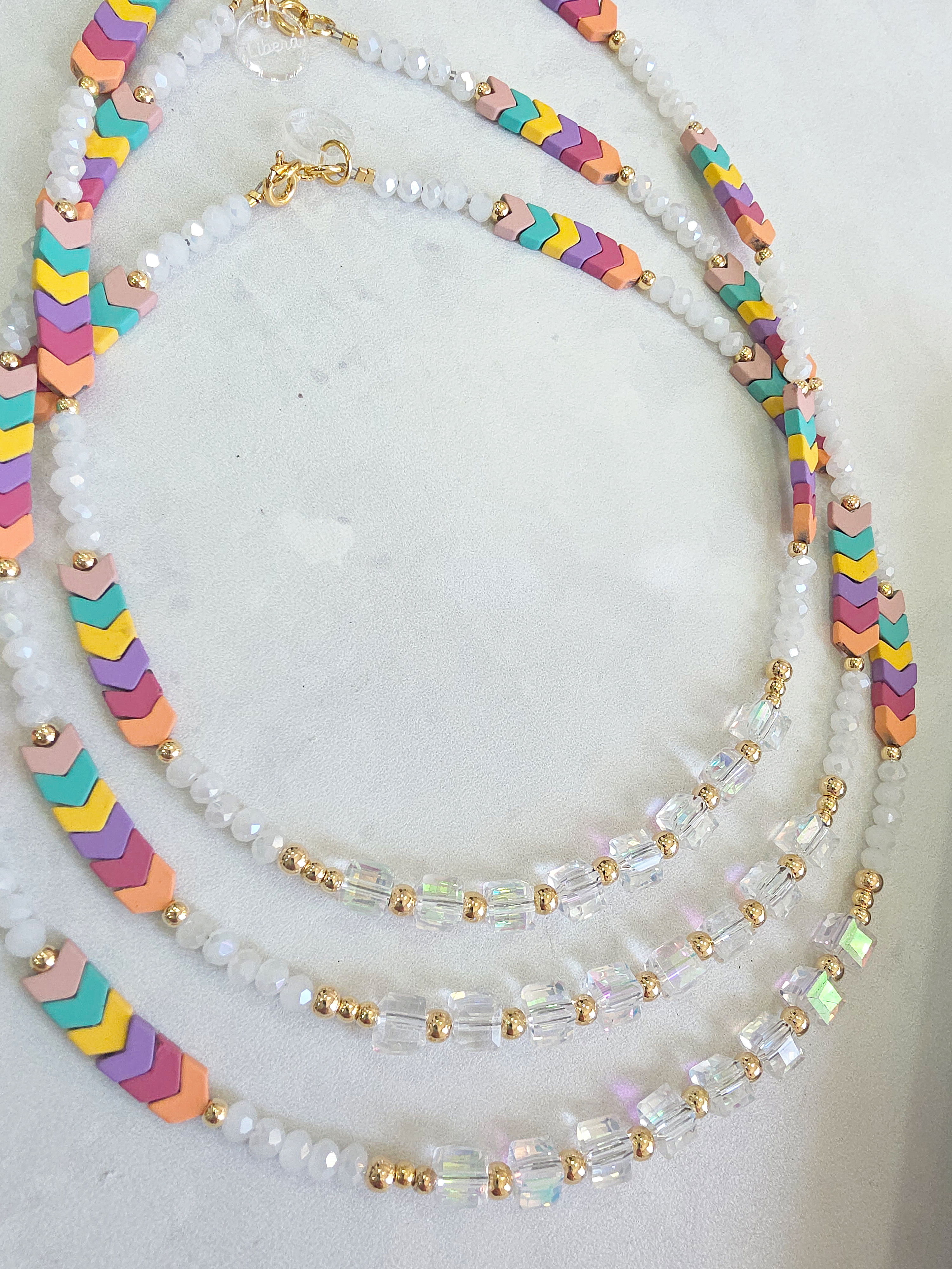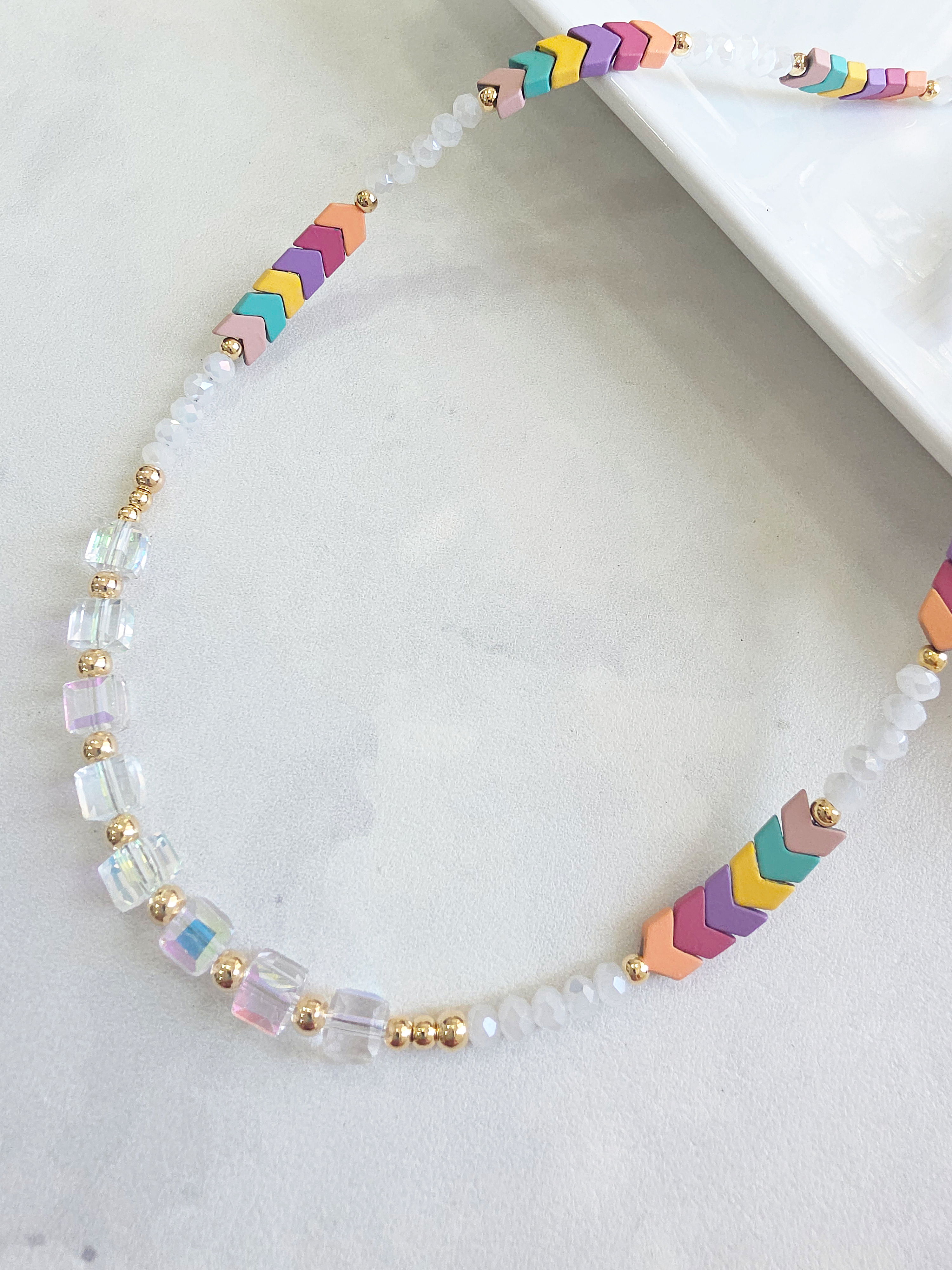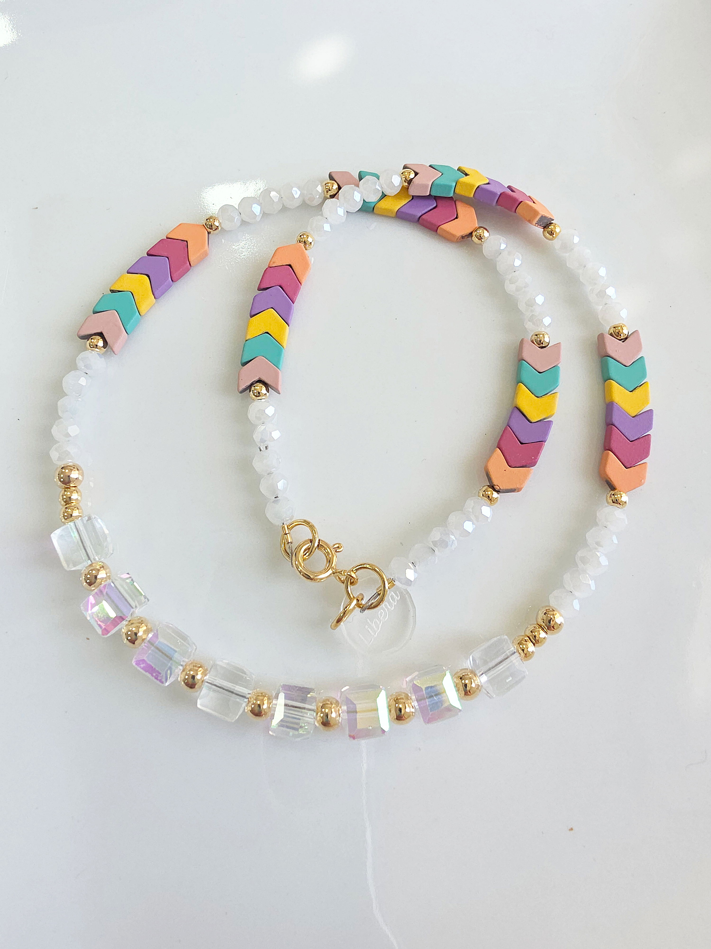 Collar de aproximadamente 40 cm, compuesto por donitas de cristal, flechitas de Hematite de colores y Cubos de Cristal. Detalles y terminación de Oro Laminado 18k.