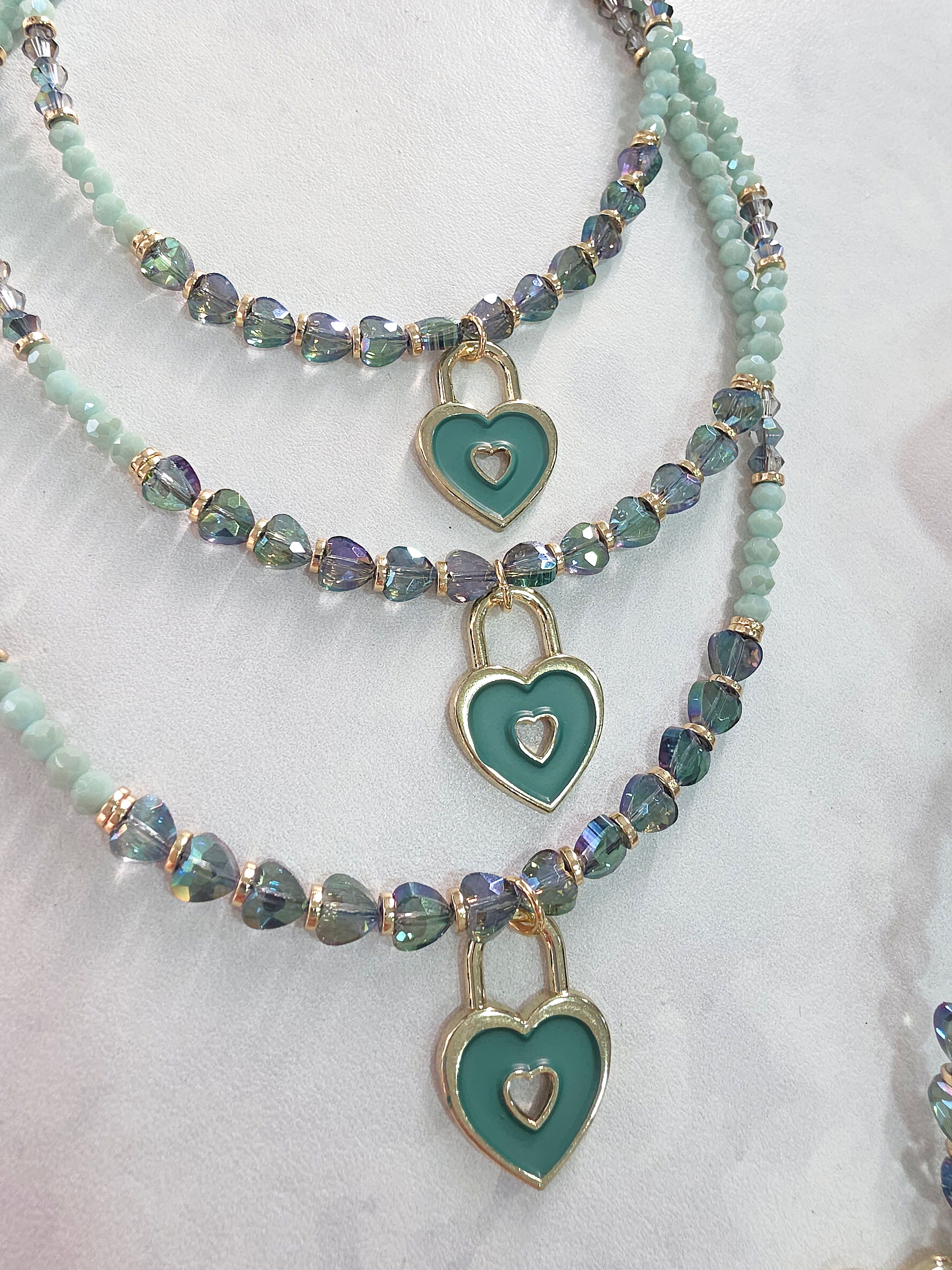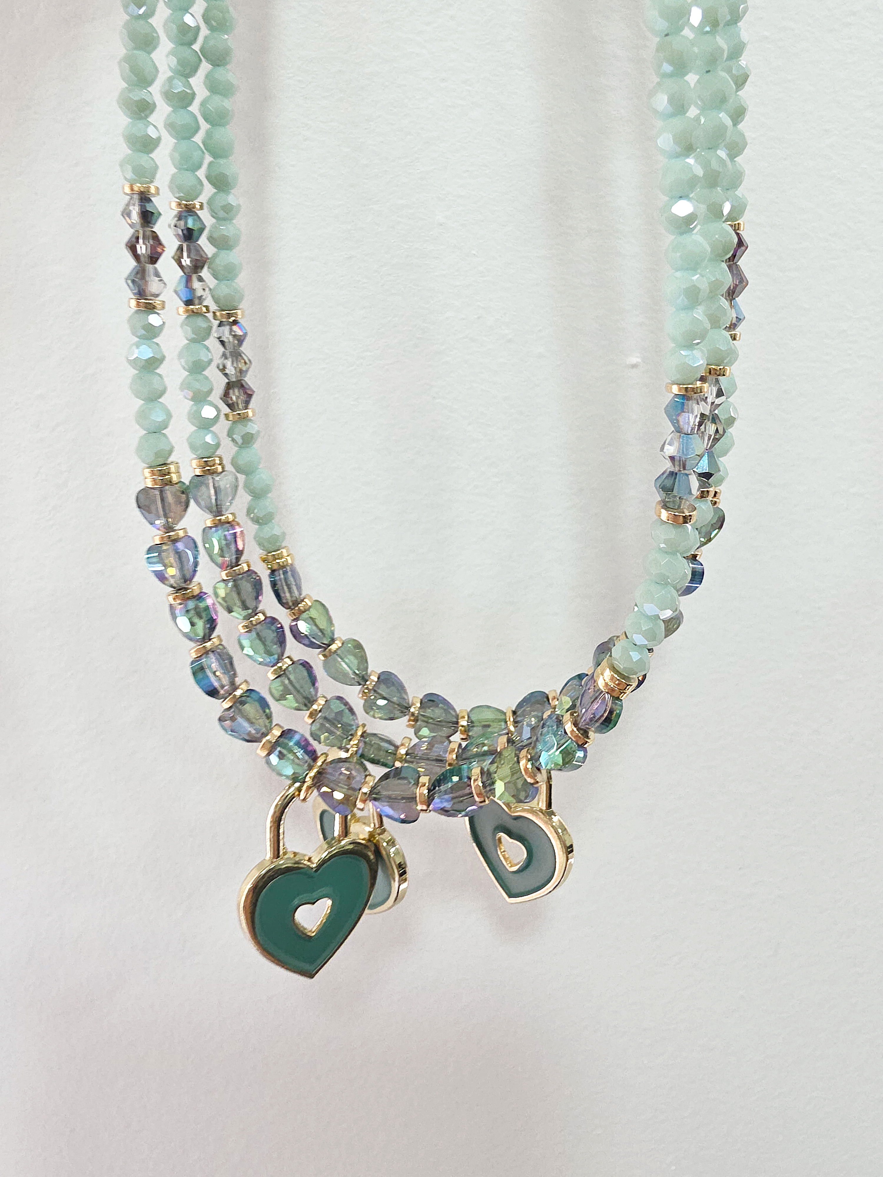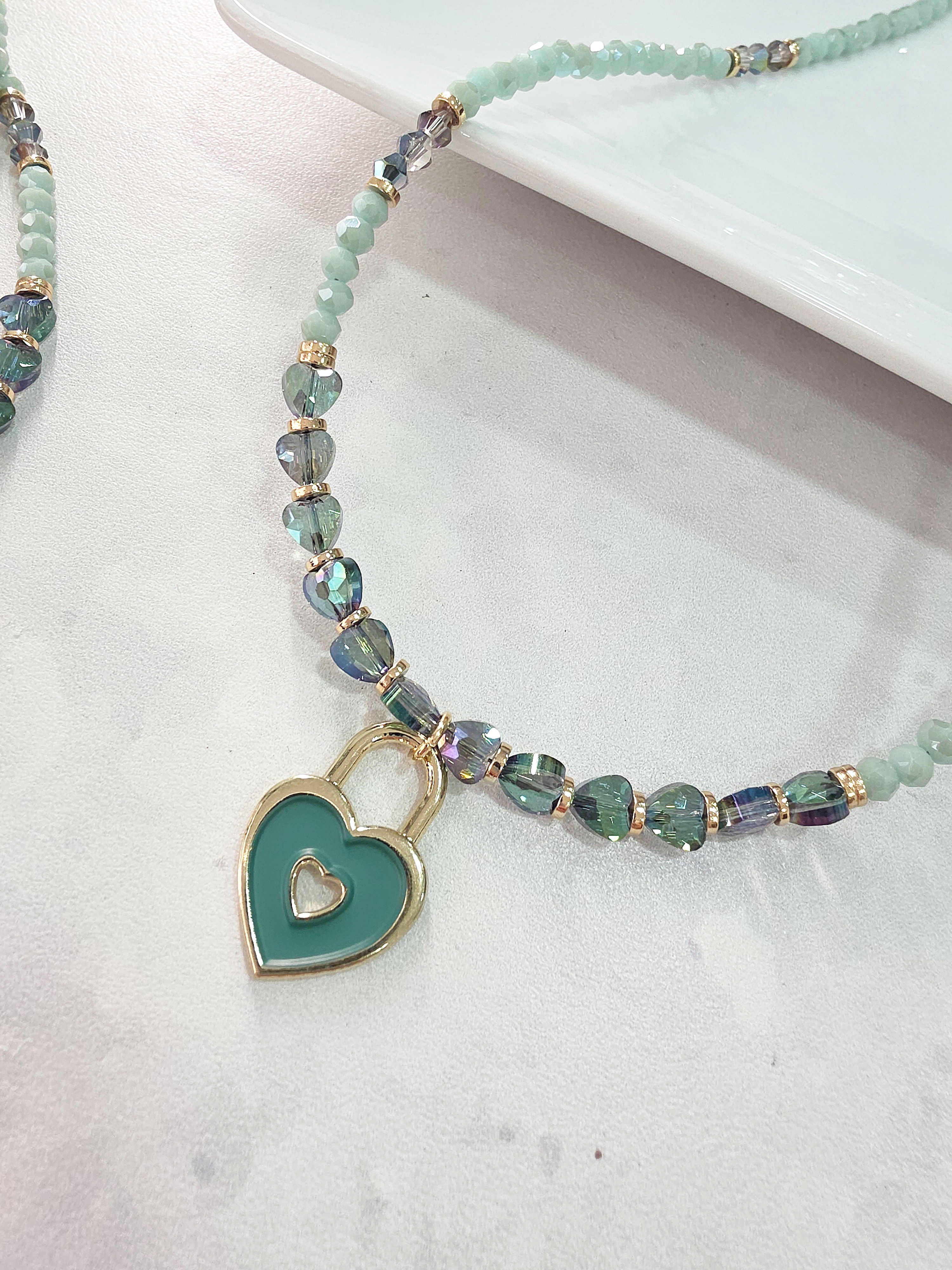 Collar de aproximadamente 40 cm (más cadena de alargue) compuesto por cristales, arandelas de Hematite con baño, corazoncitos de cristal y dije esmaltado.