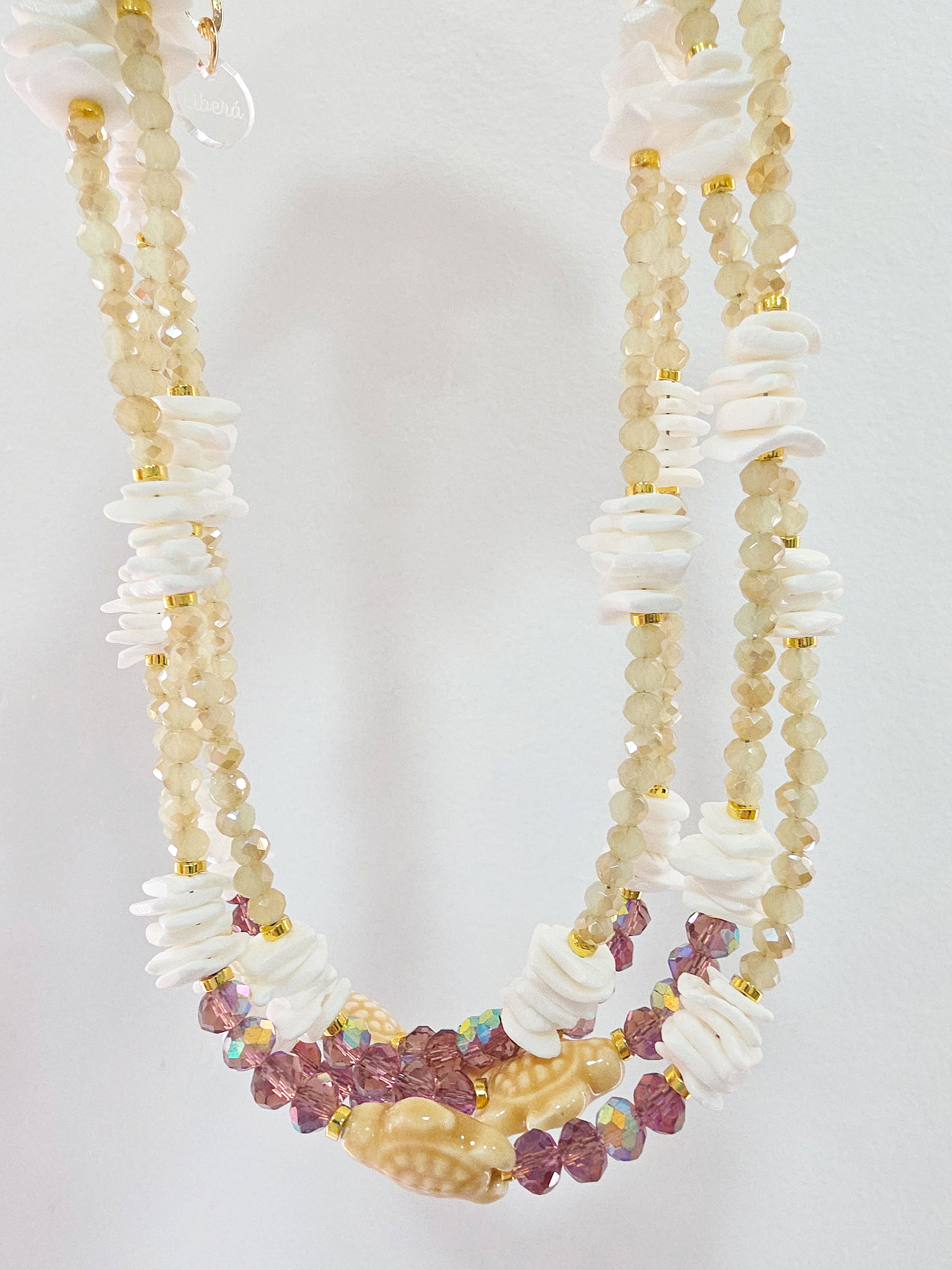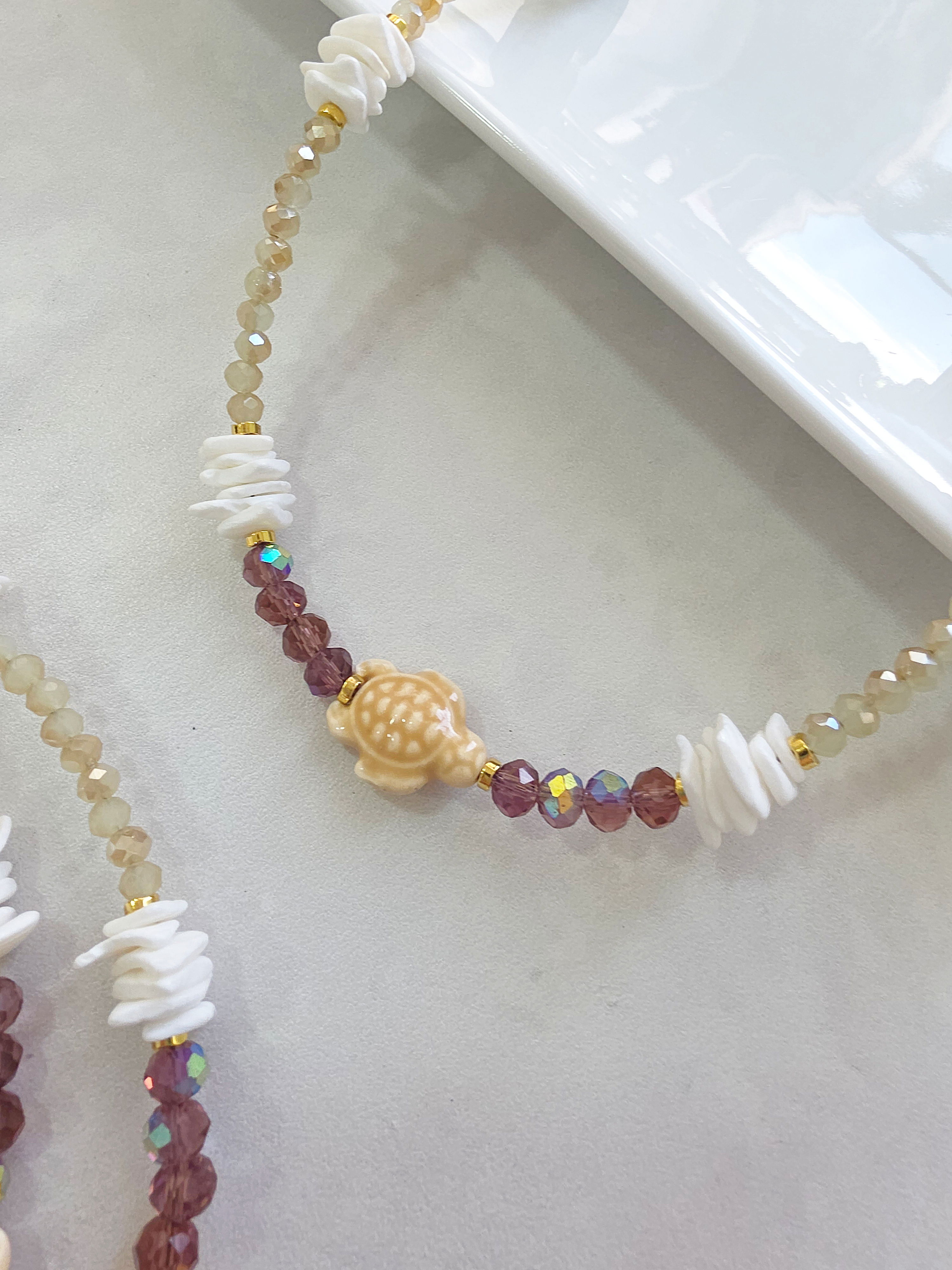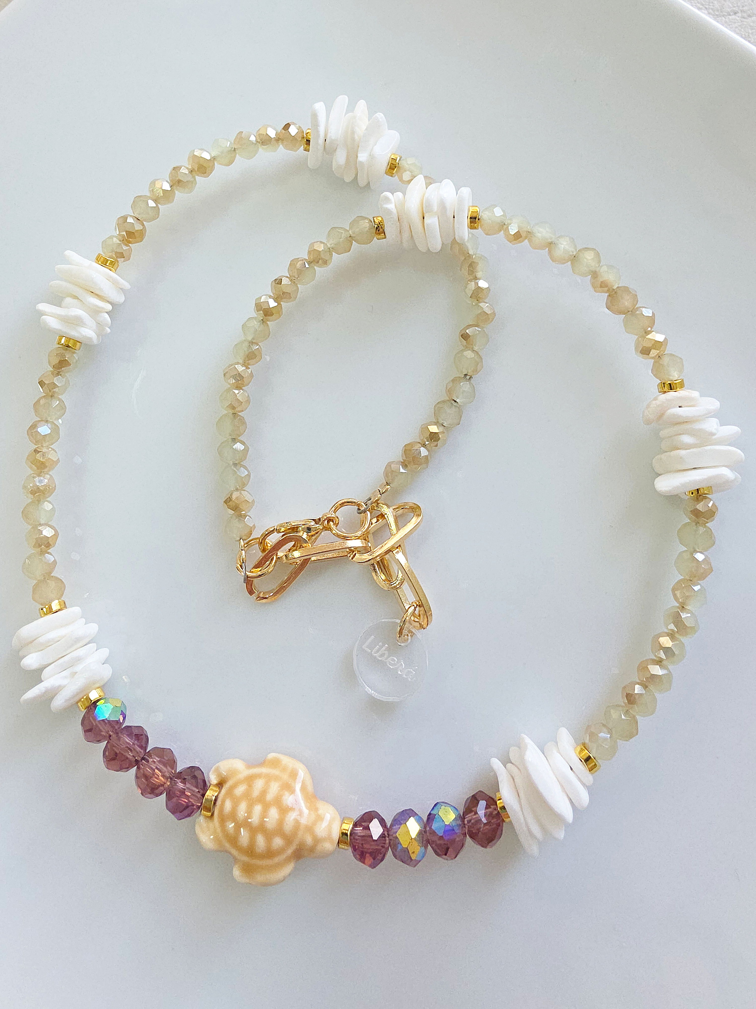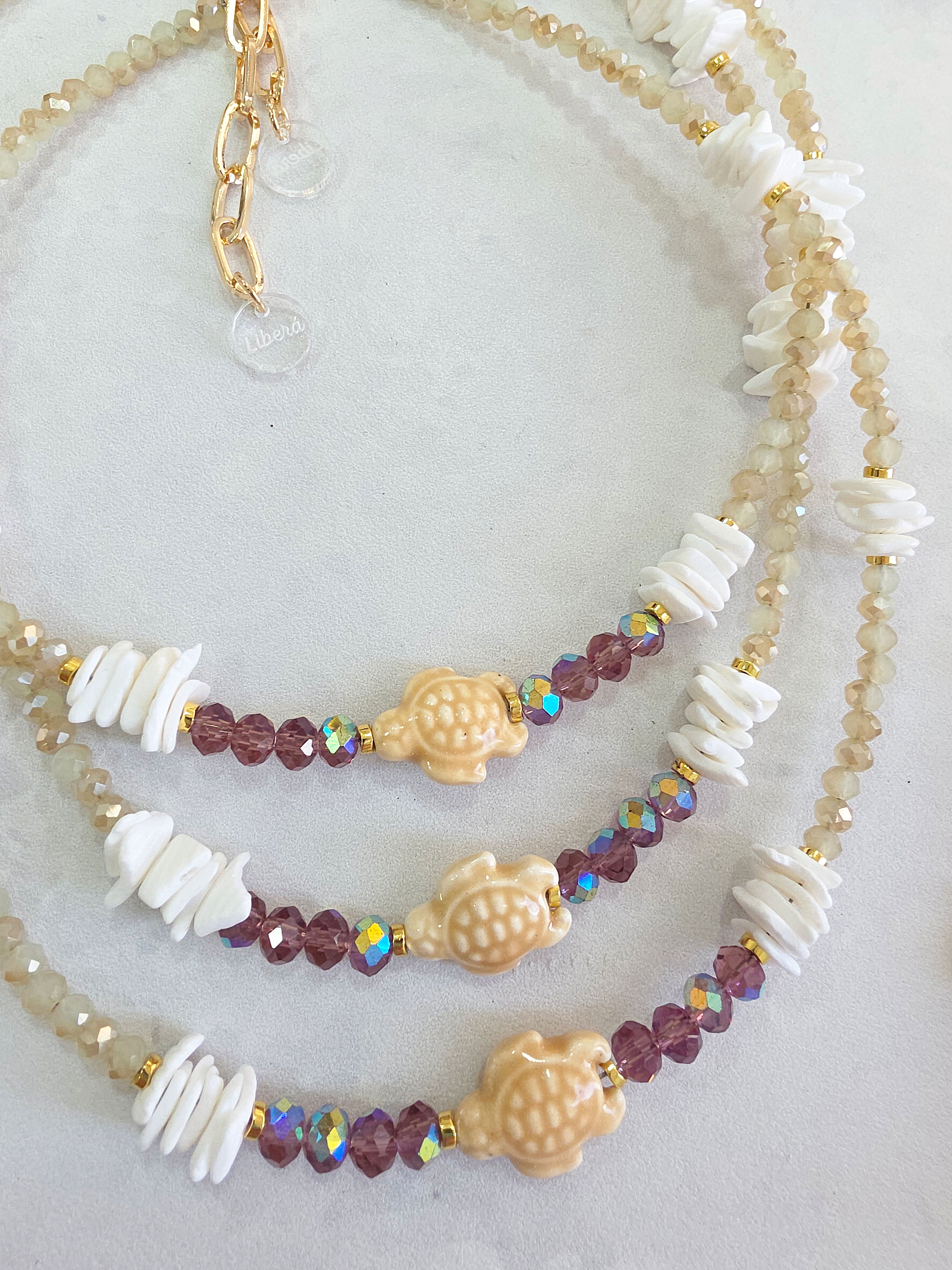 Collar de aproximadamente 40 cm (más cadena de alargue) compuesto por cristales, arandelas de Hematite con baño, escallas de Nácar y tortuguita de cerámica esmaltada.