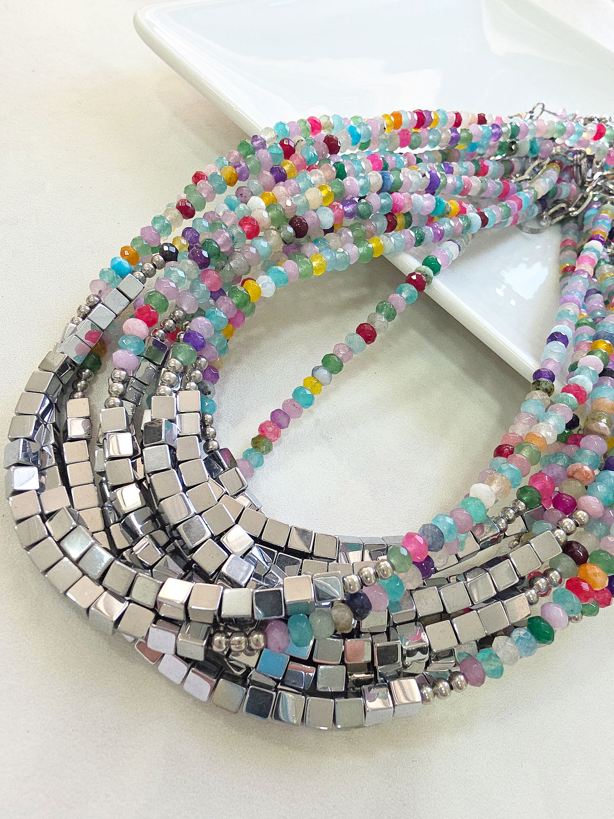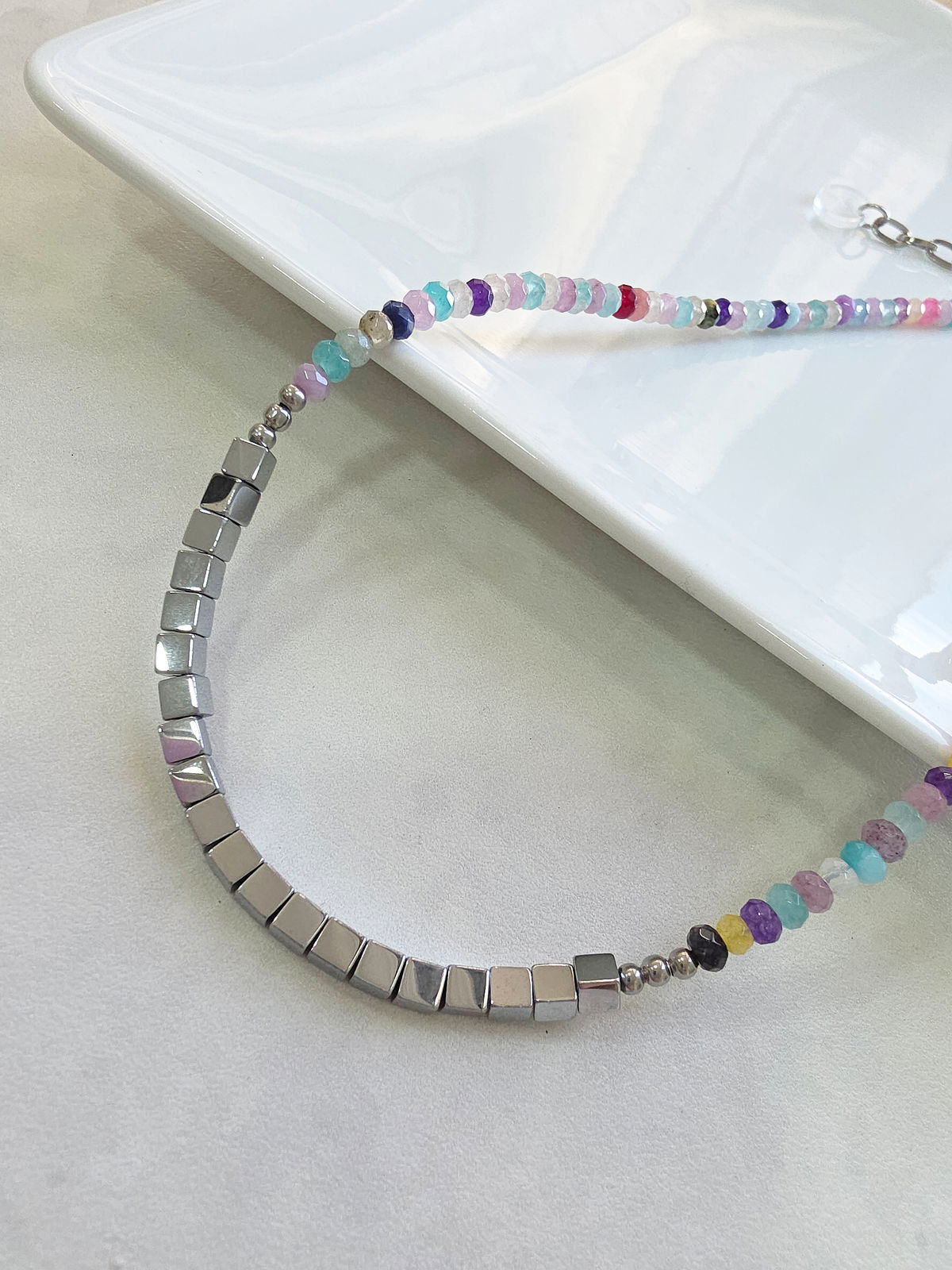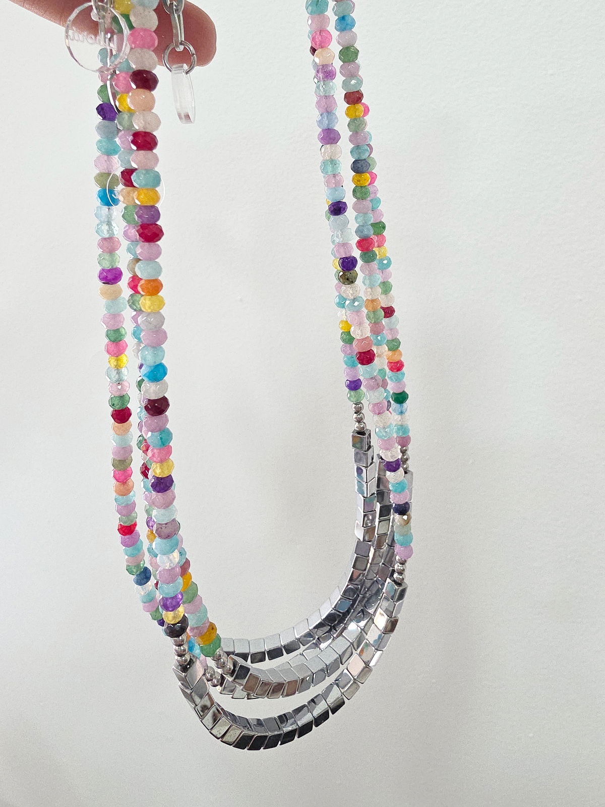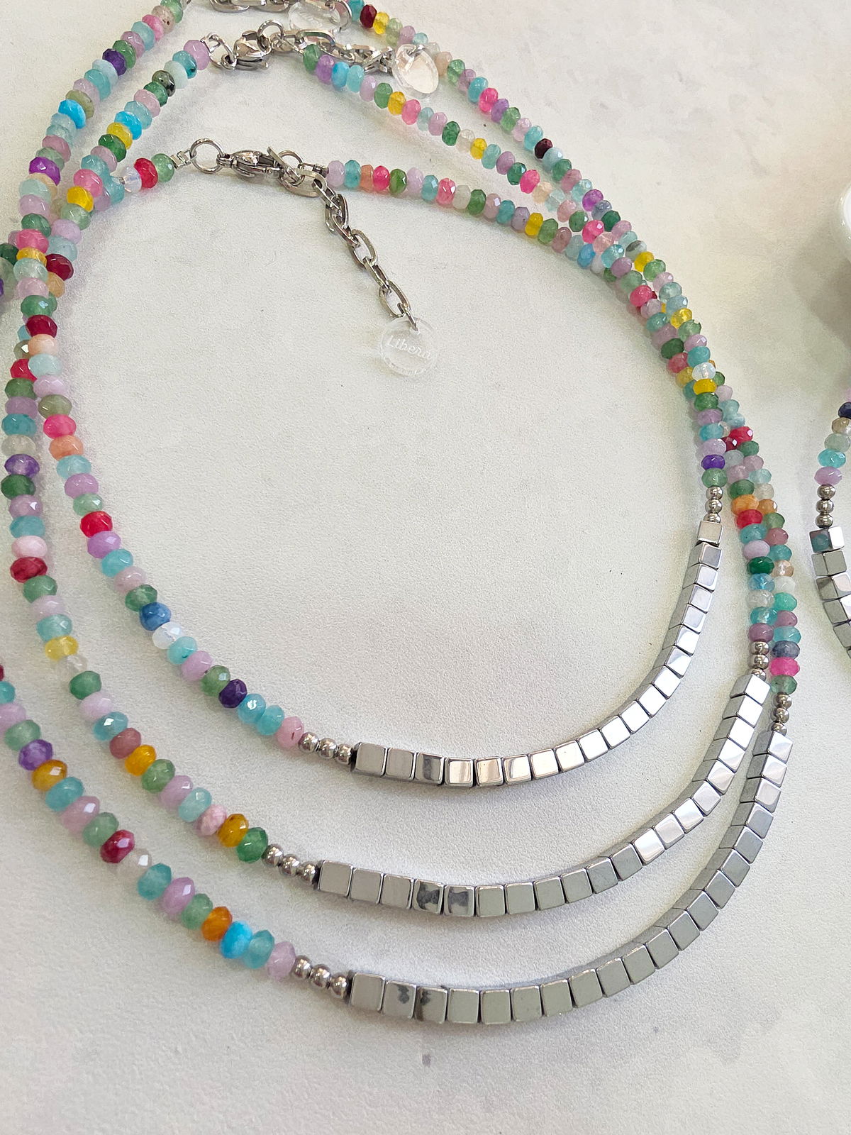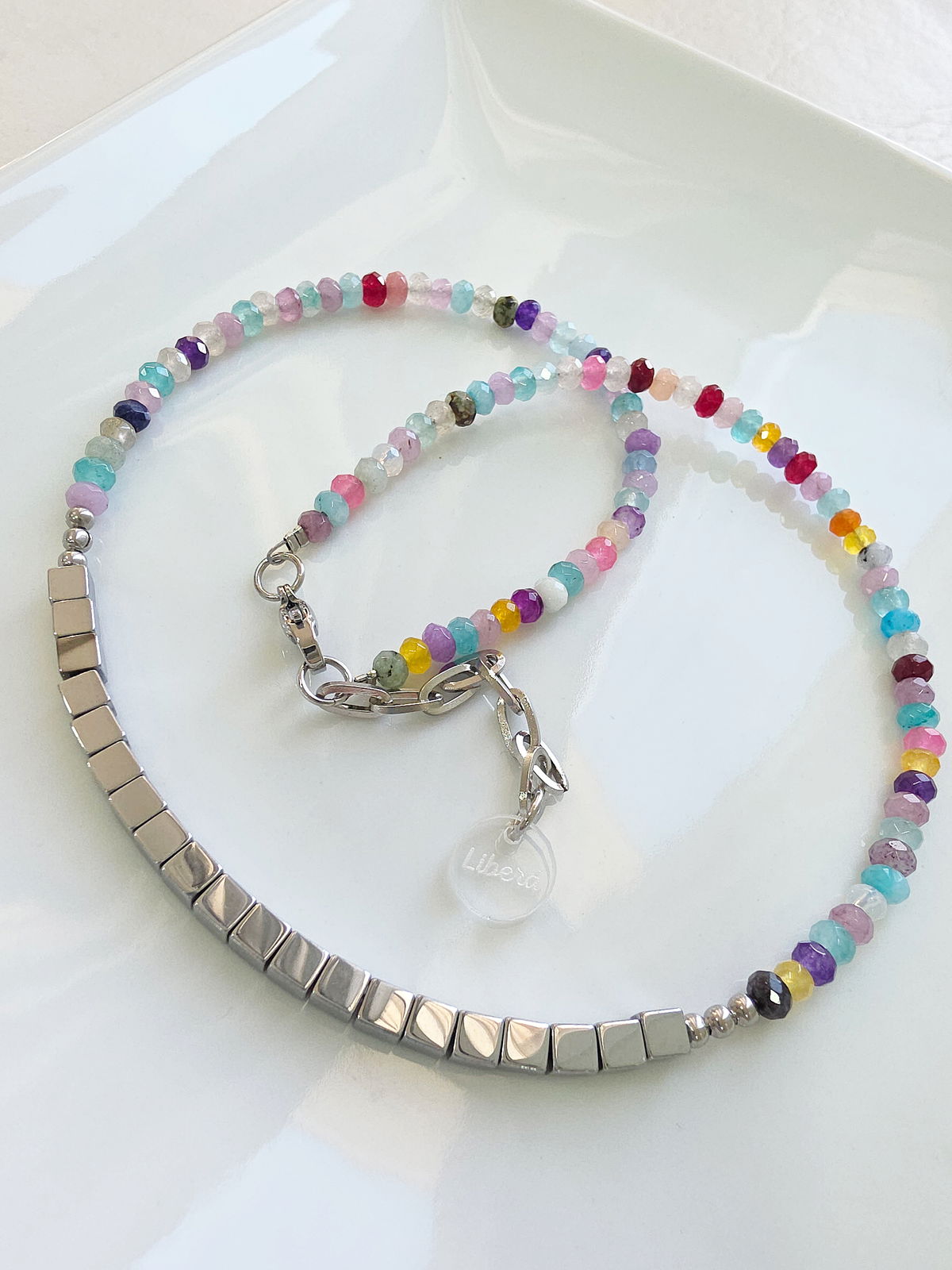 Collar de aproximadamente 40 cm (más cadena de alargue) compuesto en su totalidad por Piedras Naturales. Donitas de Agatas Facetadas en diferentes tonos y centro con cubos de Hematite.