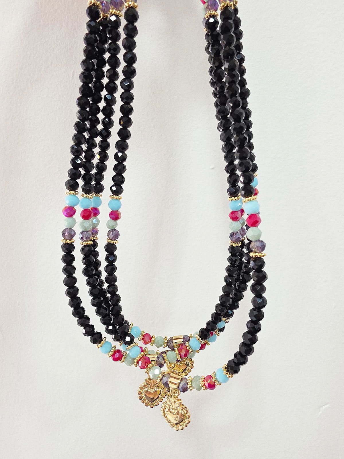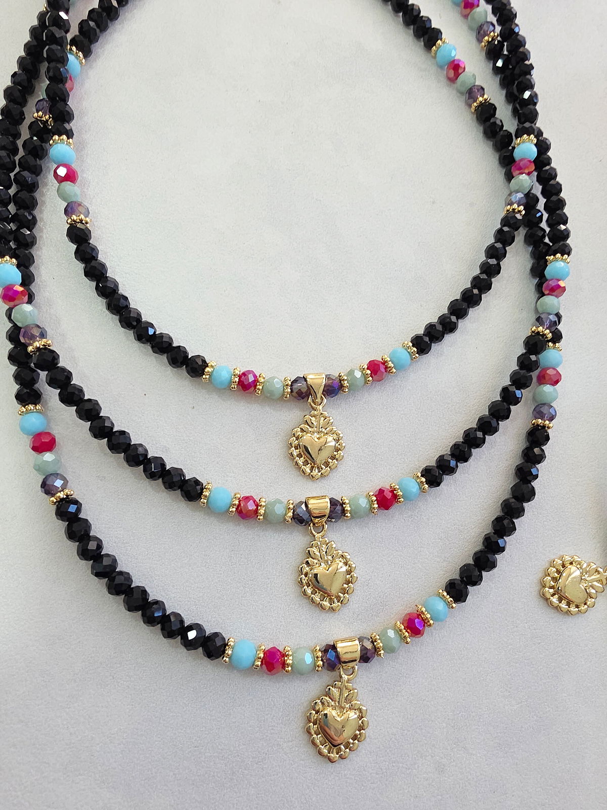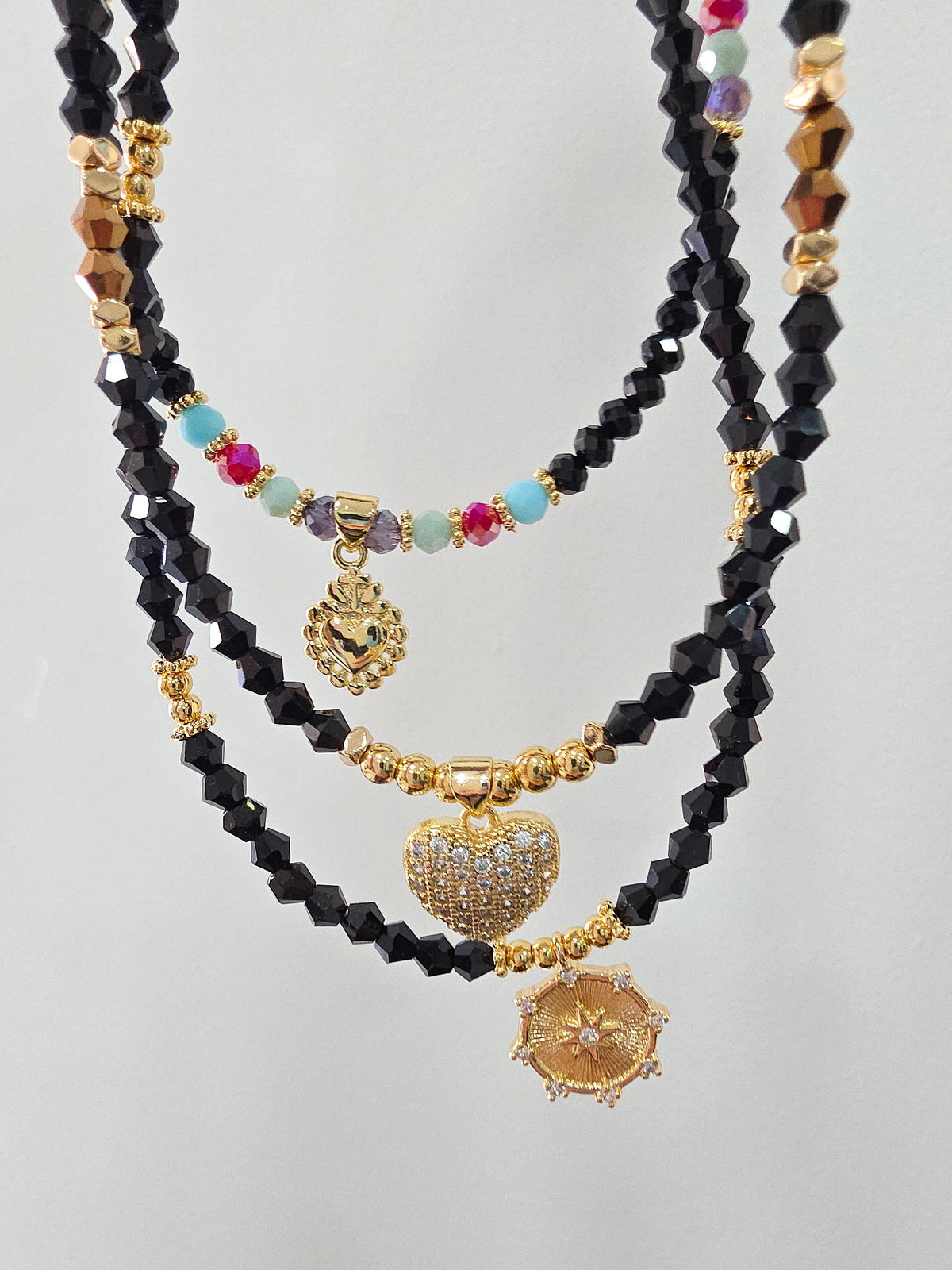 Collar de aproximadamente 40 cm. Compuesto por Cristales y dije Laminado en Oro 18k. Detalles, cierre y cadena de Oro Laminado 18k.