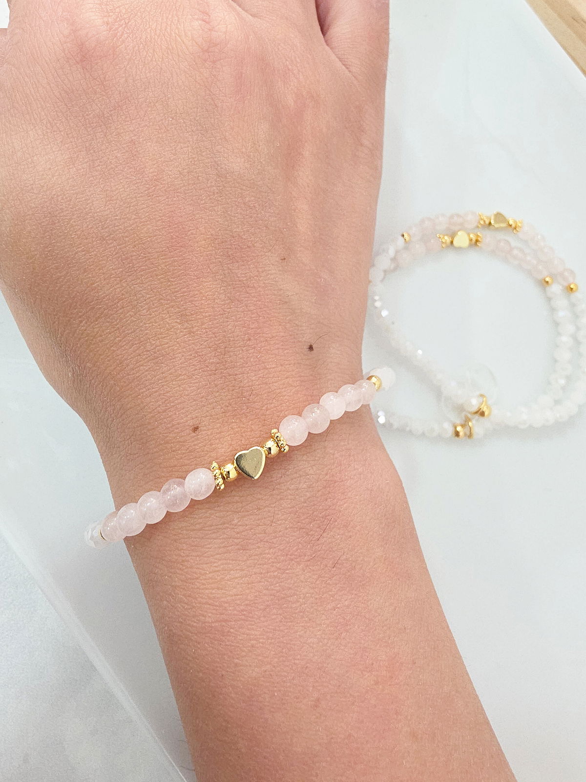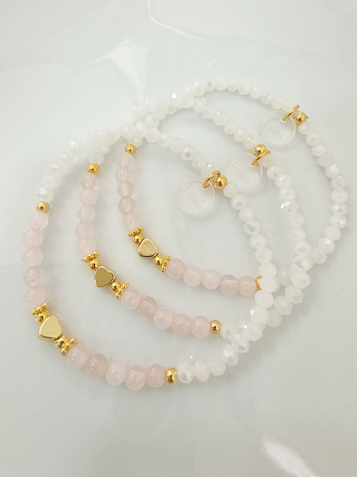 Pulsera elástica compuesta por cristales, corazón laminado en oro y esferitas de Piedra Natural Cuarzo Rosa. bolitas y detalles de Oro Laminado 18k
