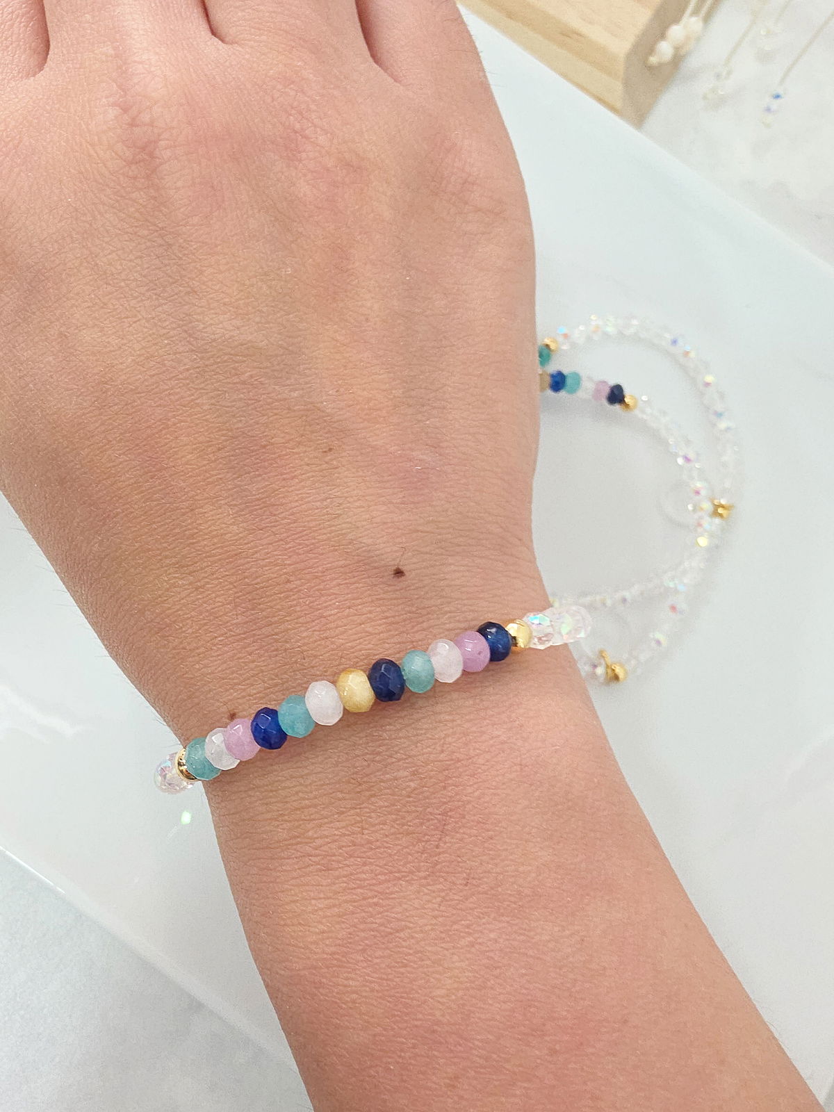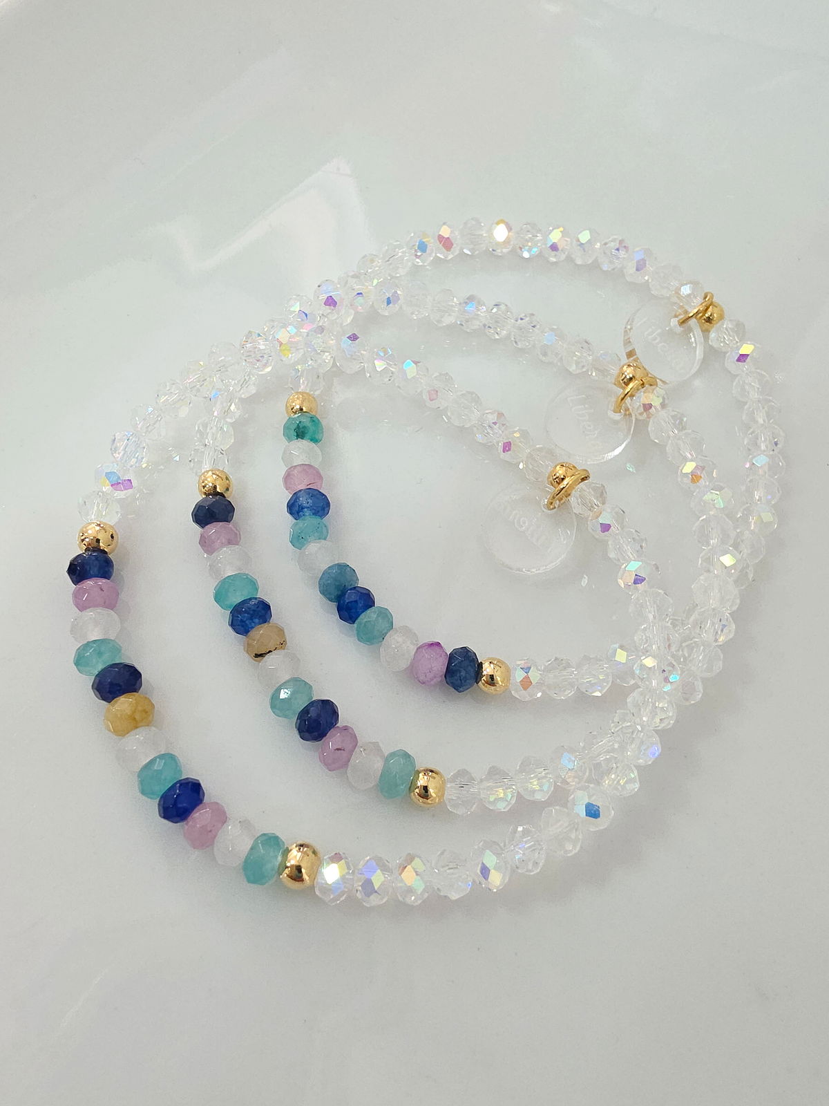 Pulsera elástica compuesta por cristales y donitas facetadas de Piedra Natural Ágata. bolitas y detalles de Oro Laminado 18k
