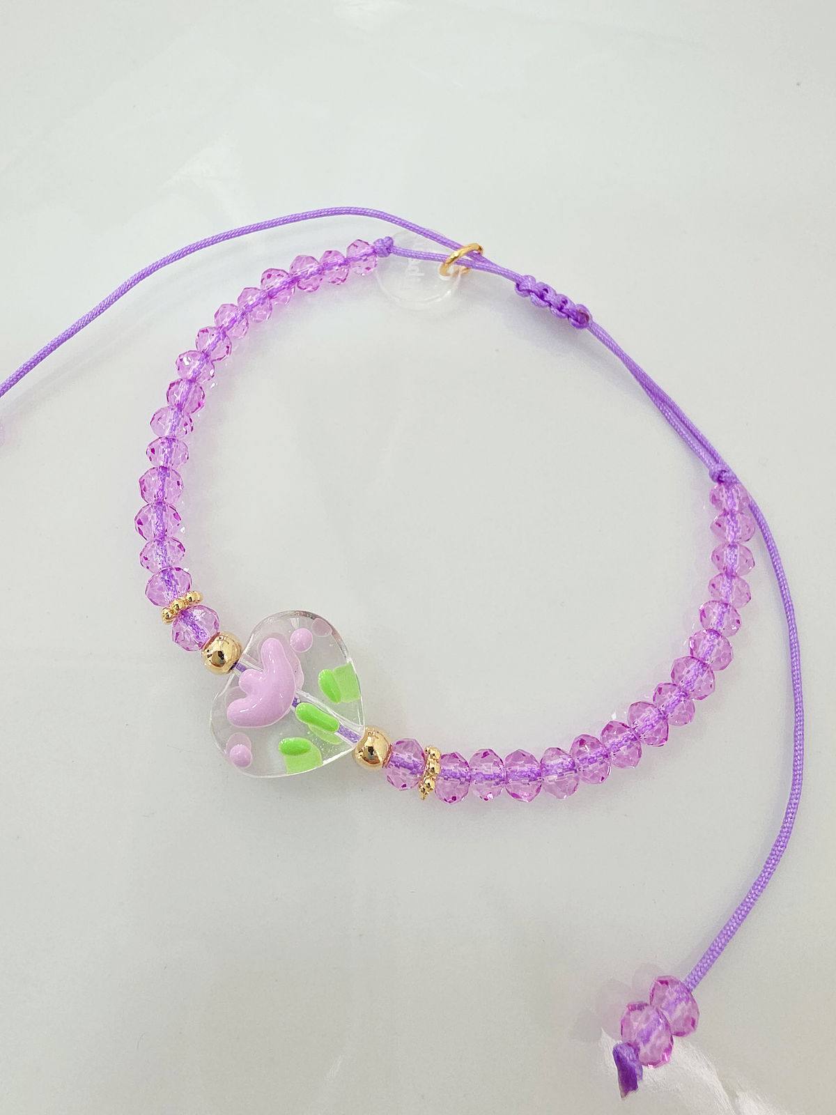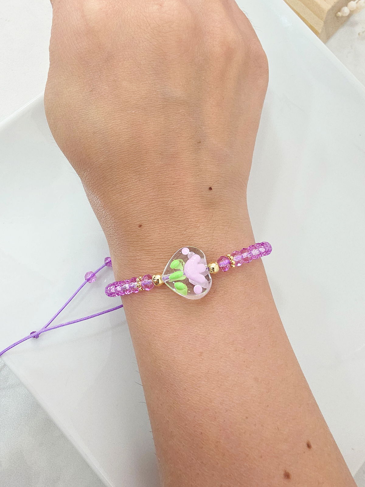 Pulsera regulable (se adapta a todas las medidas) compuesta por cristales y centro de Flor en Murano en forma de corazón. Bolitas y detalles de Oro Laminado 18k