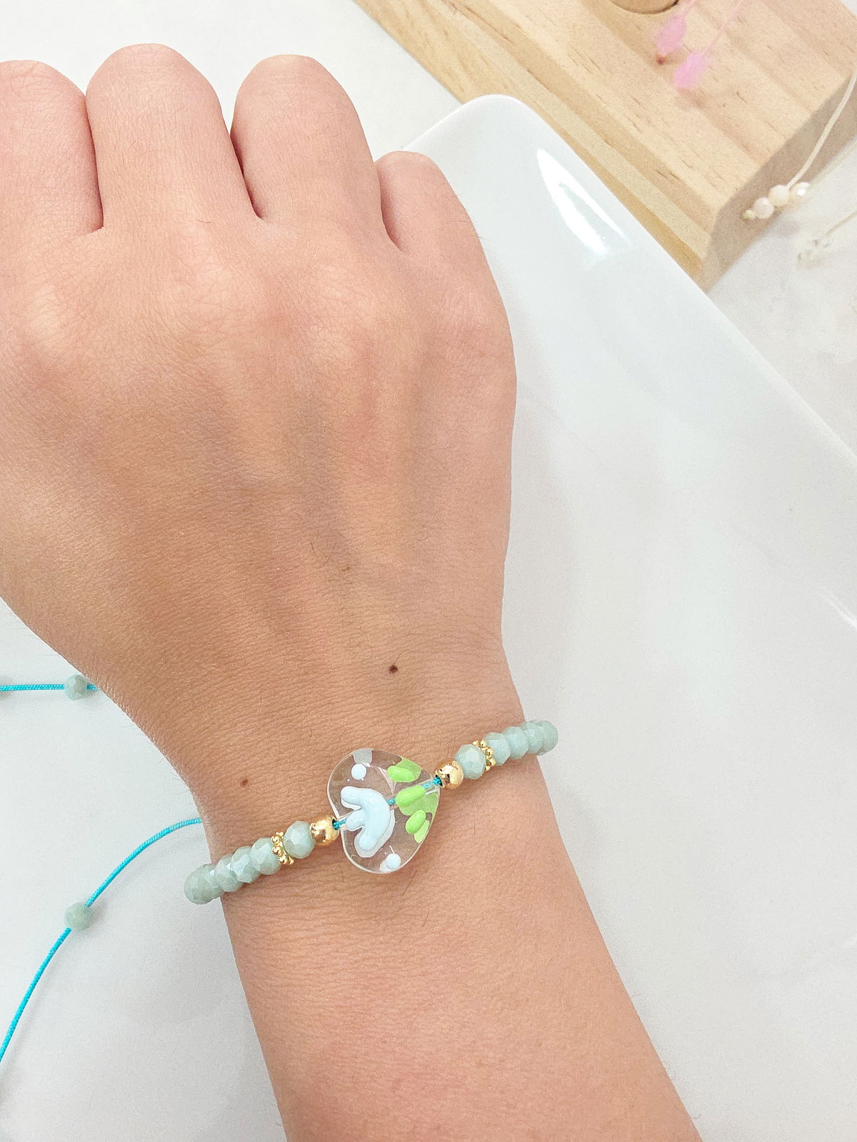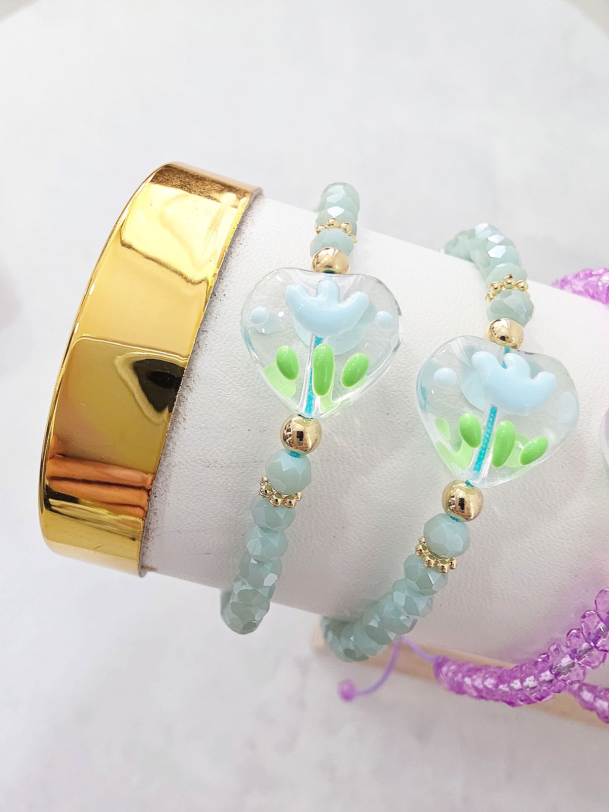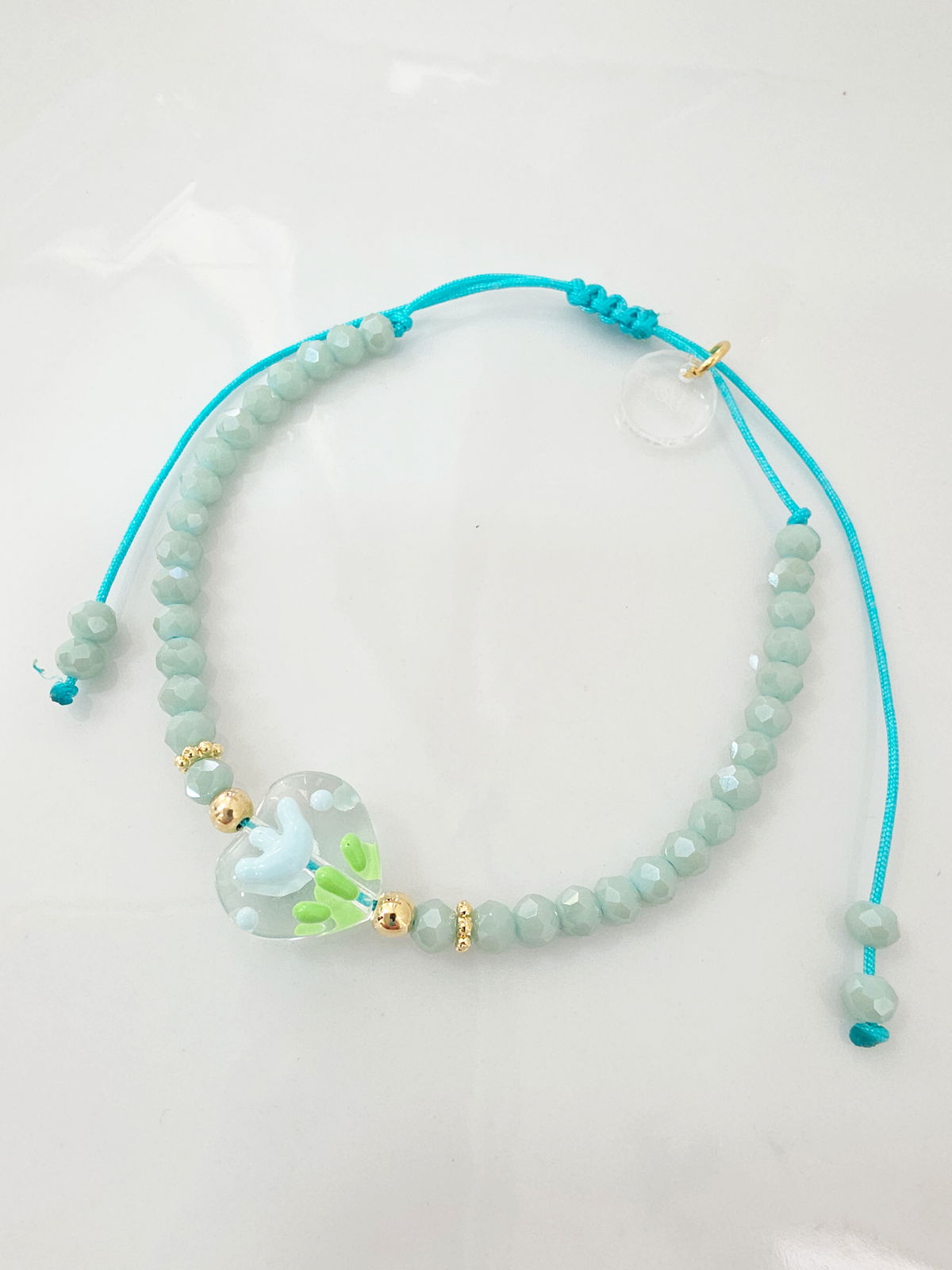 Pulsera regulable (se adapta a todas las medidas) compuesta por cristales y centro de Flor en Murano en forma de corazón. Bolitas y detalles de Oro Laminado 18k