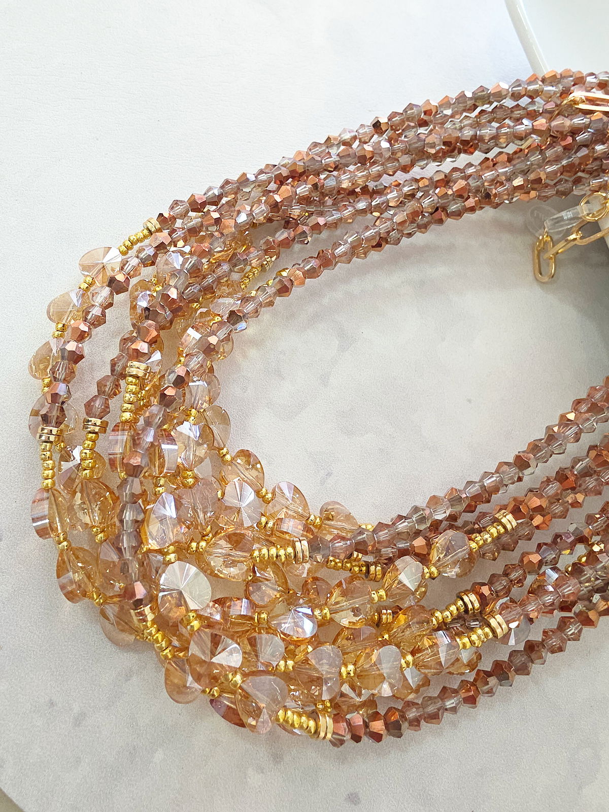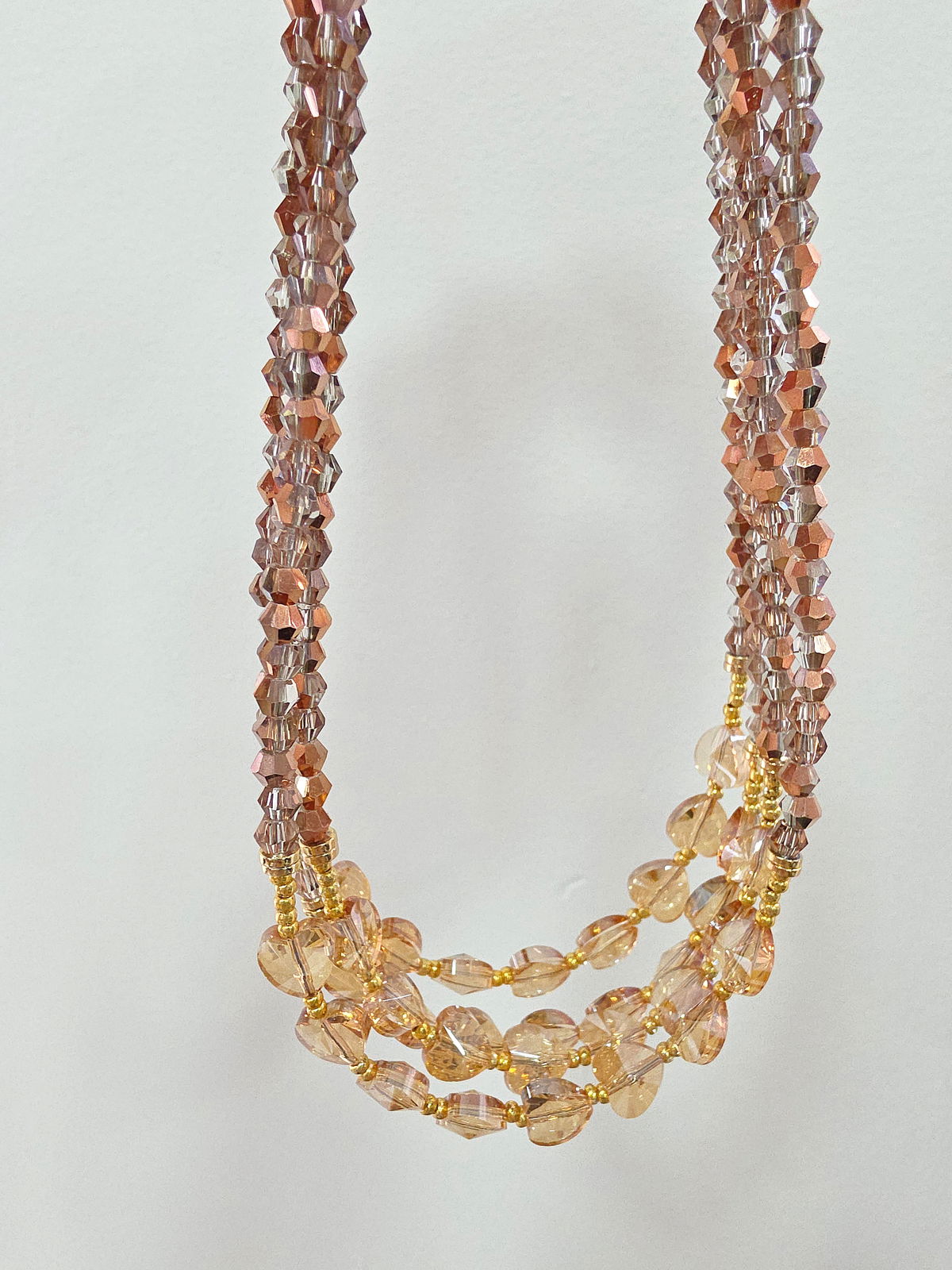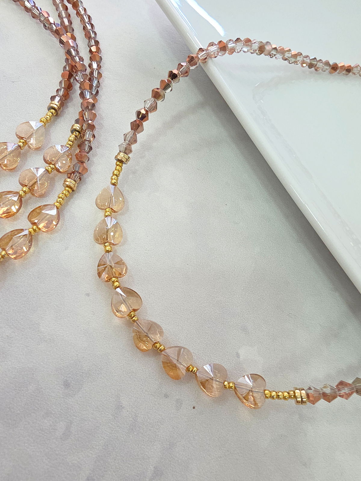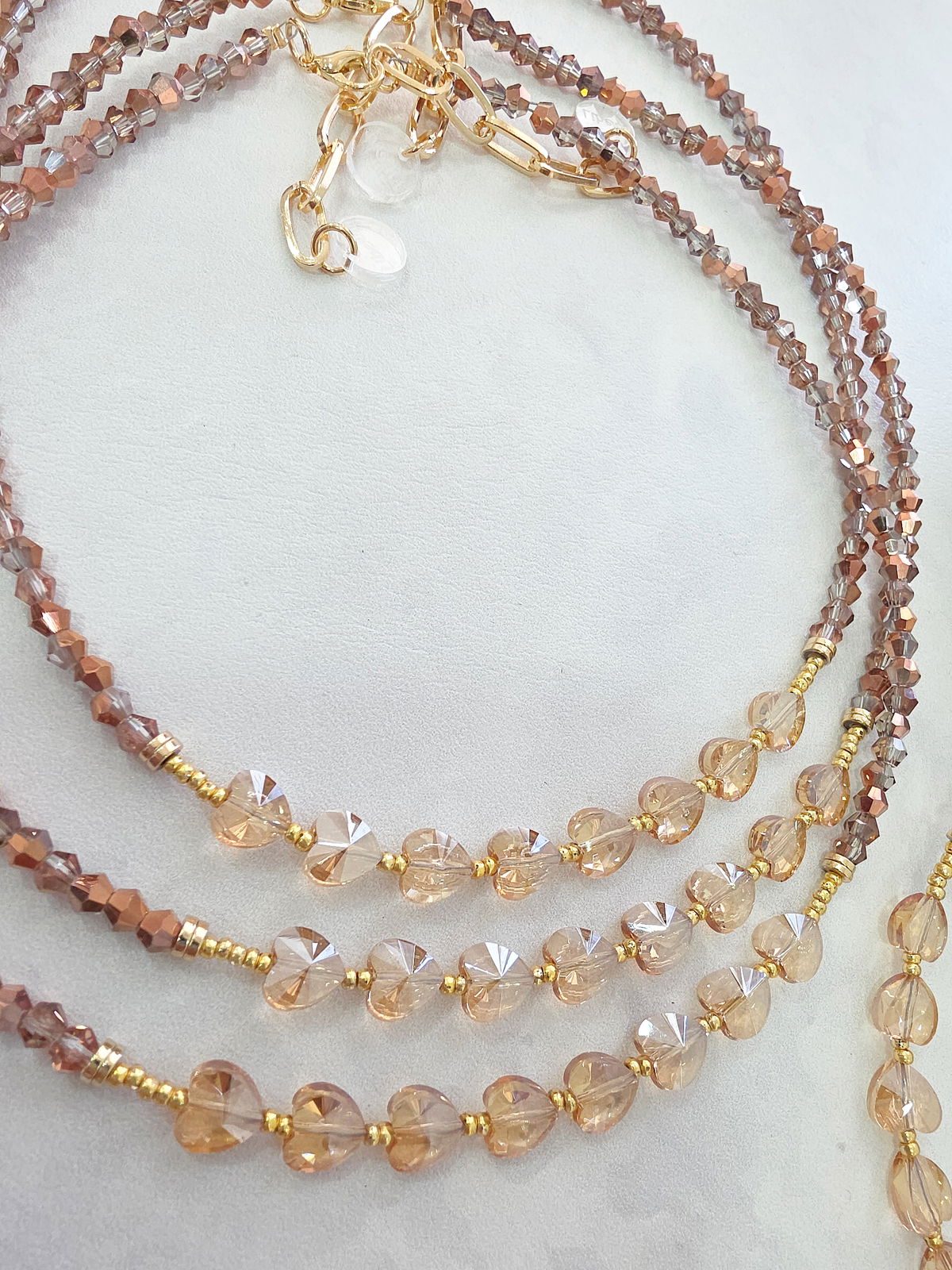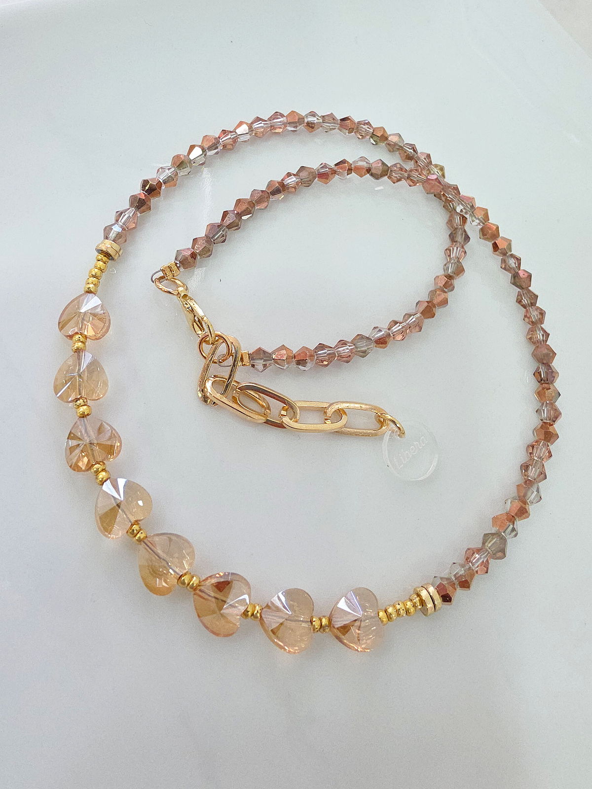 Collar de aproximadamente 40 cm (más cadena de alargue) compuesto por cristales, arandelas de Hematite con baño, mostacillas Checas calibradas marca Preciosa y corazones de cristal al tono.