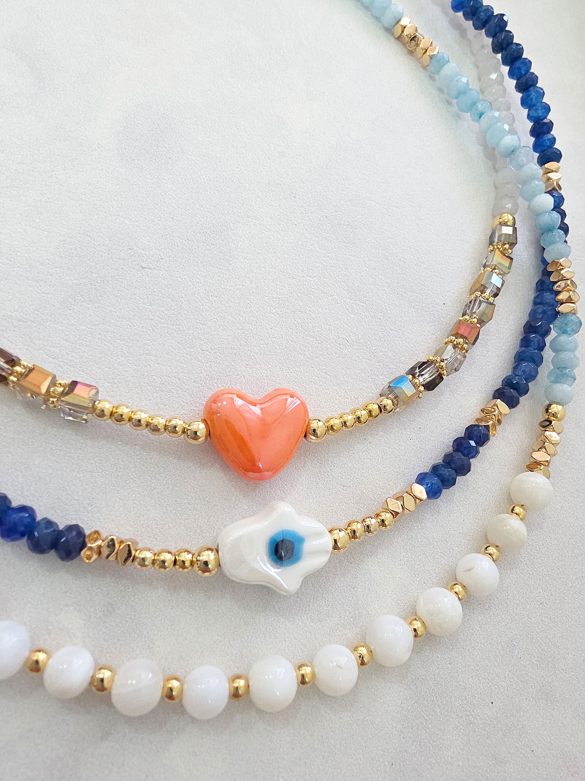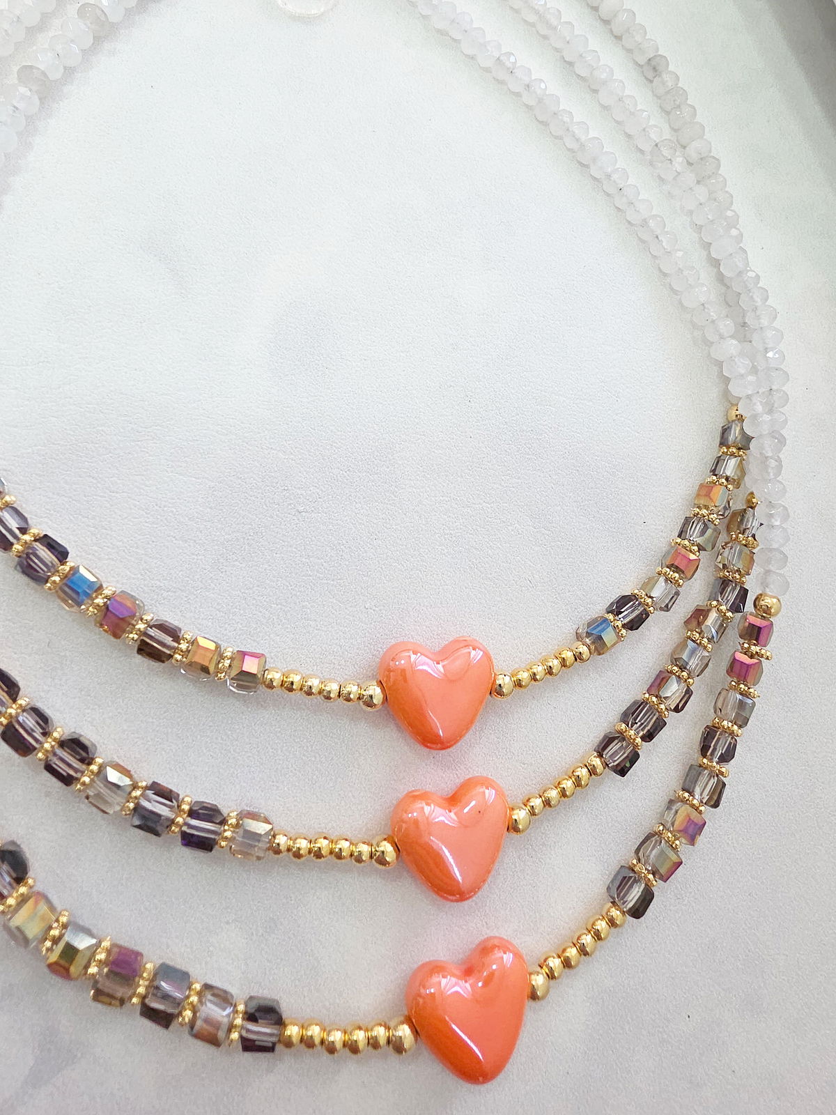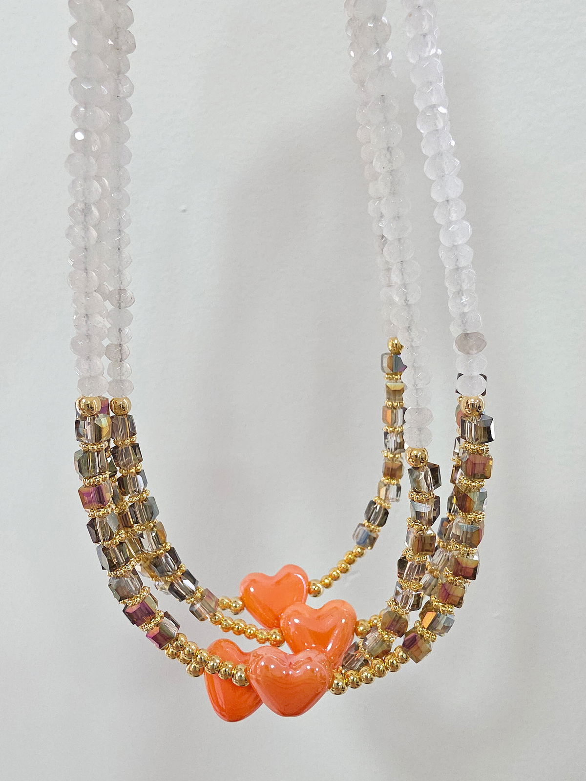 Collar de aproximadamente 40 cm. Compuesto por donitas Facetadas de Piedra Natural Ágata, cubos de Cristal y corazón de Cerámica Esmaltada. Detalles, terminaciones y cierre Laminados en Oro 18k.