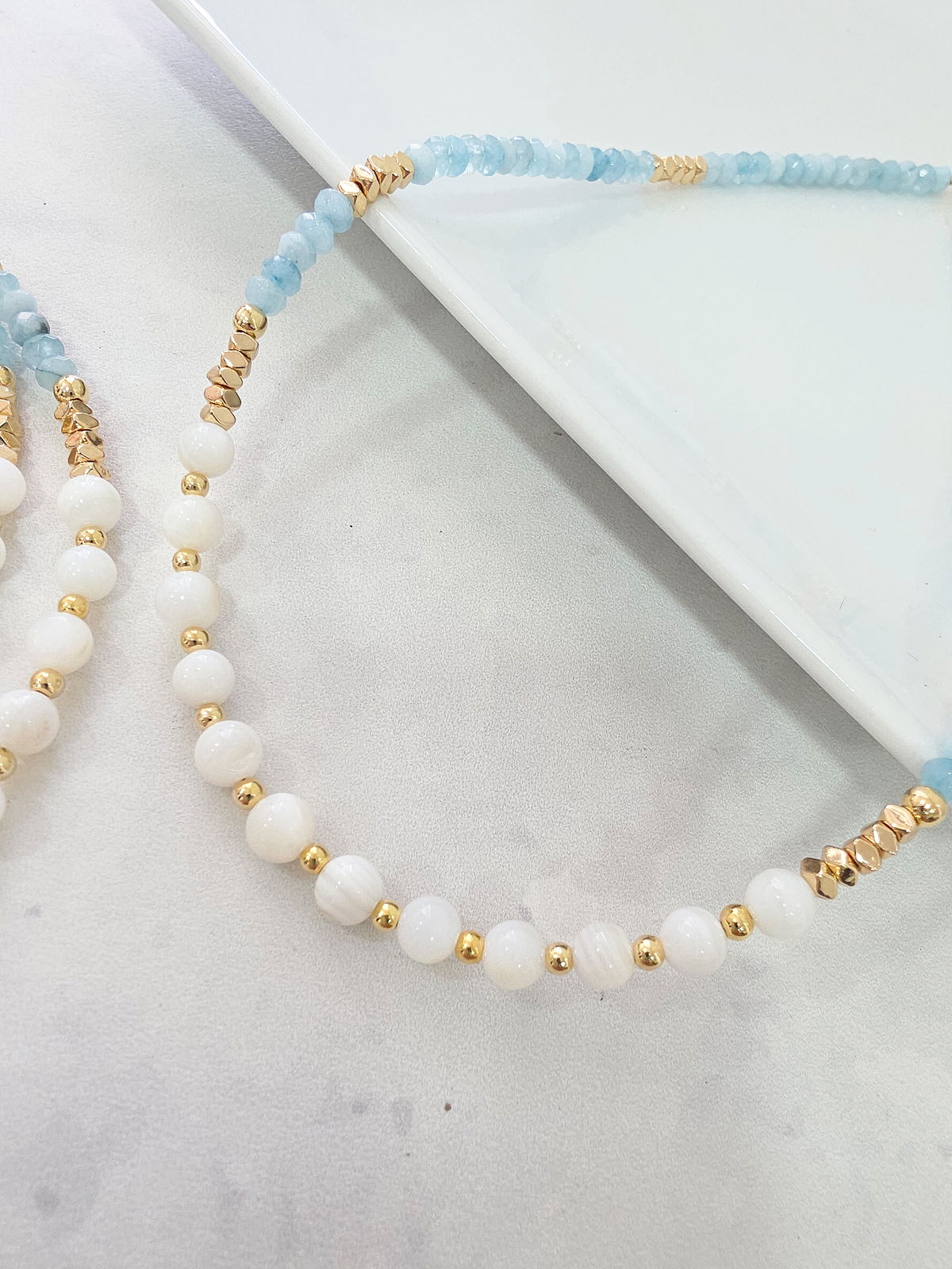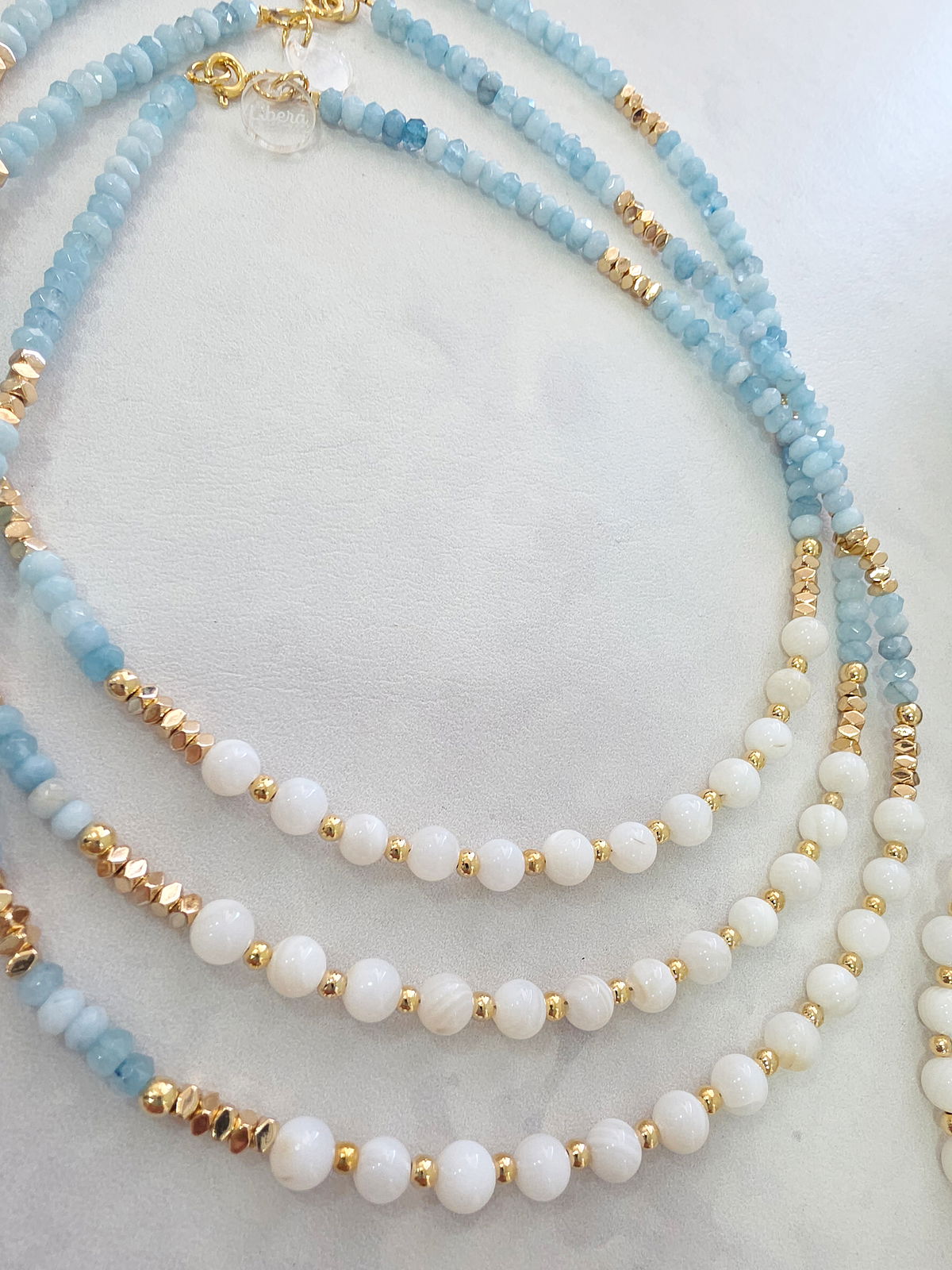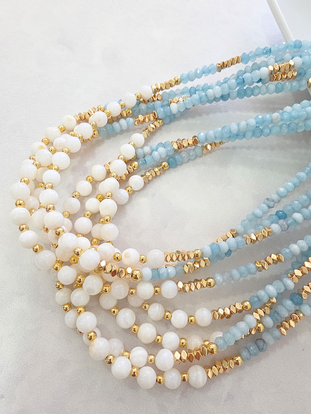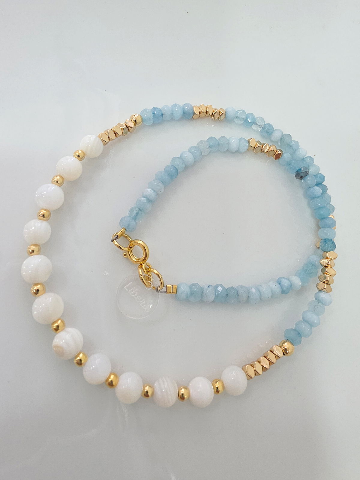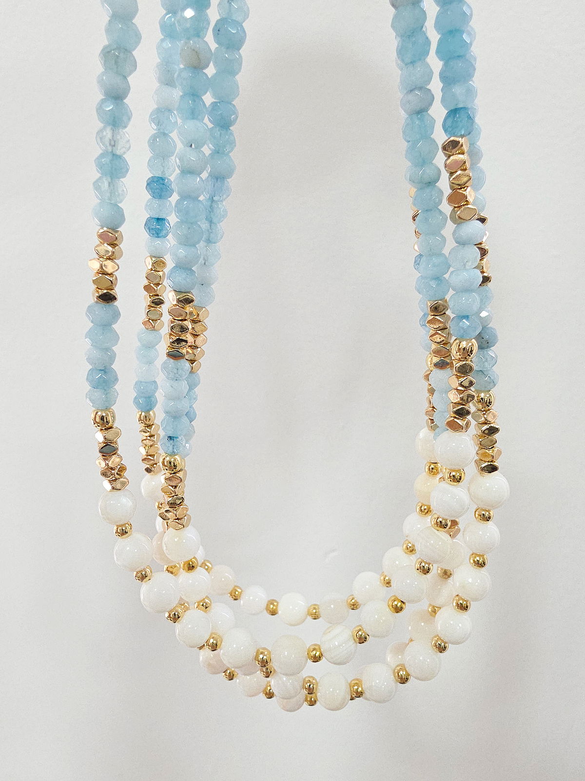 Collar de aproximadamente 40 cm. Compuesto por donitas Facetadas de Piedra Natural Ágata, arandelas bisceladas de Hematite con baño y esferas de Nácar Natural. Detalles, terminaciones y cierre Laminados en Oro 18k.