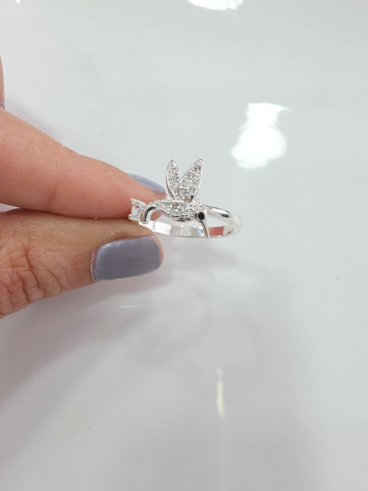 Anillo regulable de Acero Blanco con Colibrí con Micropave y Cubic. Se adapta a todas las medidas.