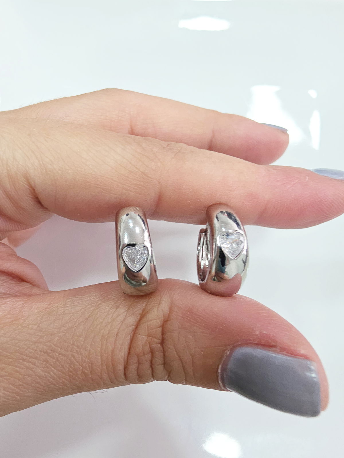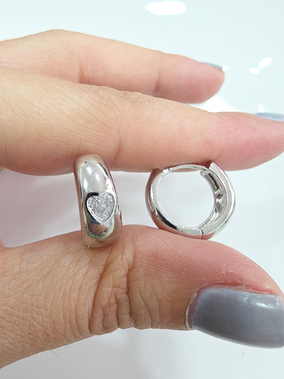Aros tipo HUGGIES de Acero Blanco con corazon CUBIC.
