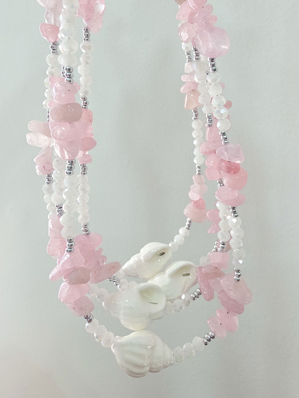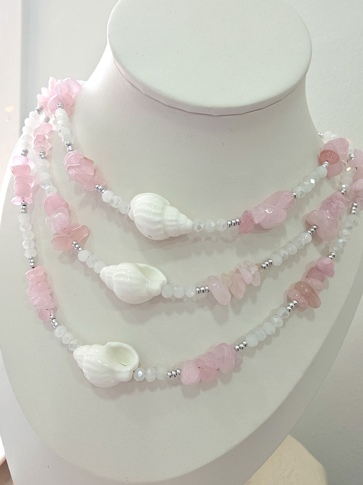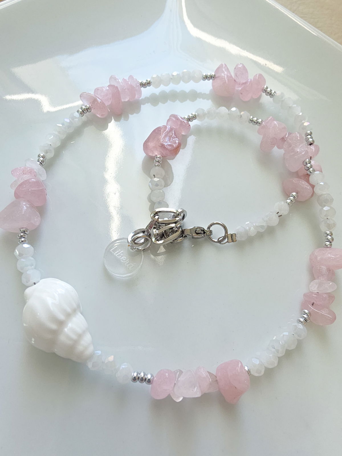 Collar de aproximadamente 40 cm (más cadena de alargue) compuesto por mostacillas Checas marca Preciosa, escallas de Piedra Natural Cuarzo Rosa, donitas de Cristal y Caracol de Cerámica.