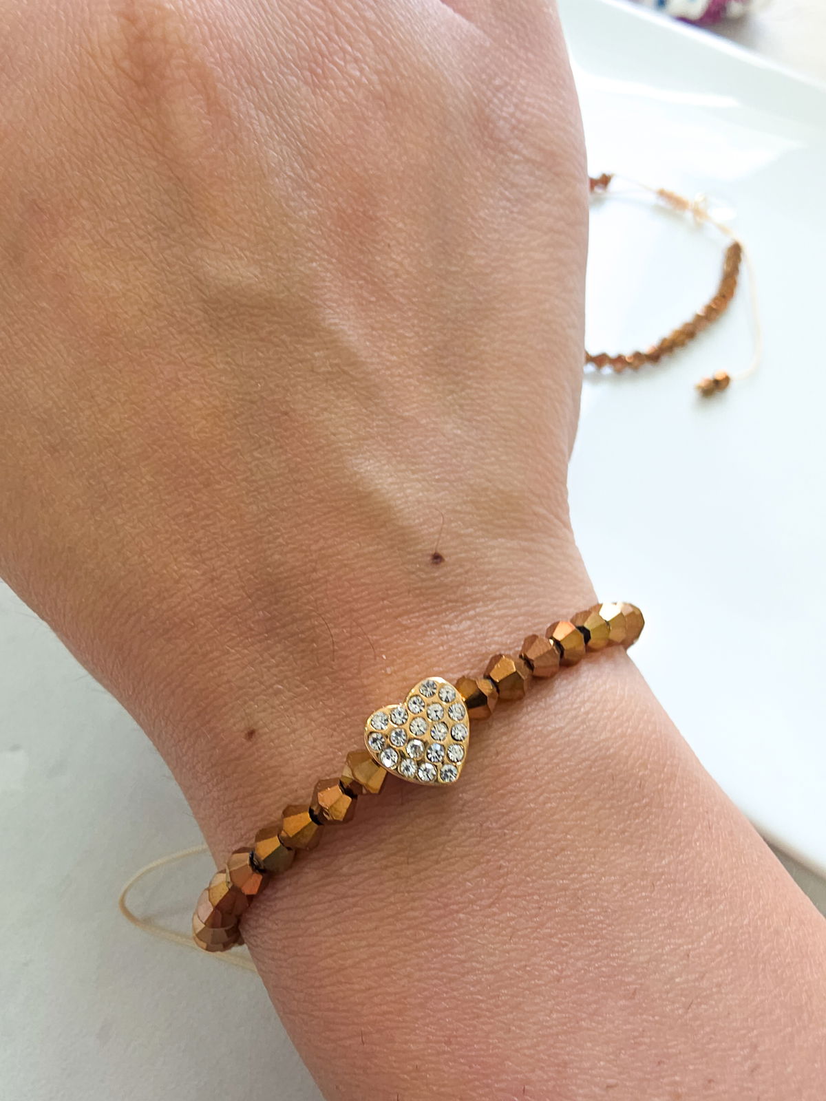 Pulsera con cierre regulable macramé (se adapta a todas las medidas). Compuesta por Cristales cónicos y corazón con Strass.