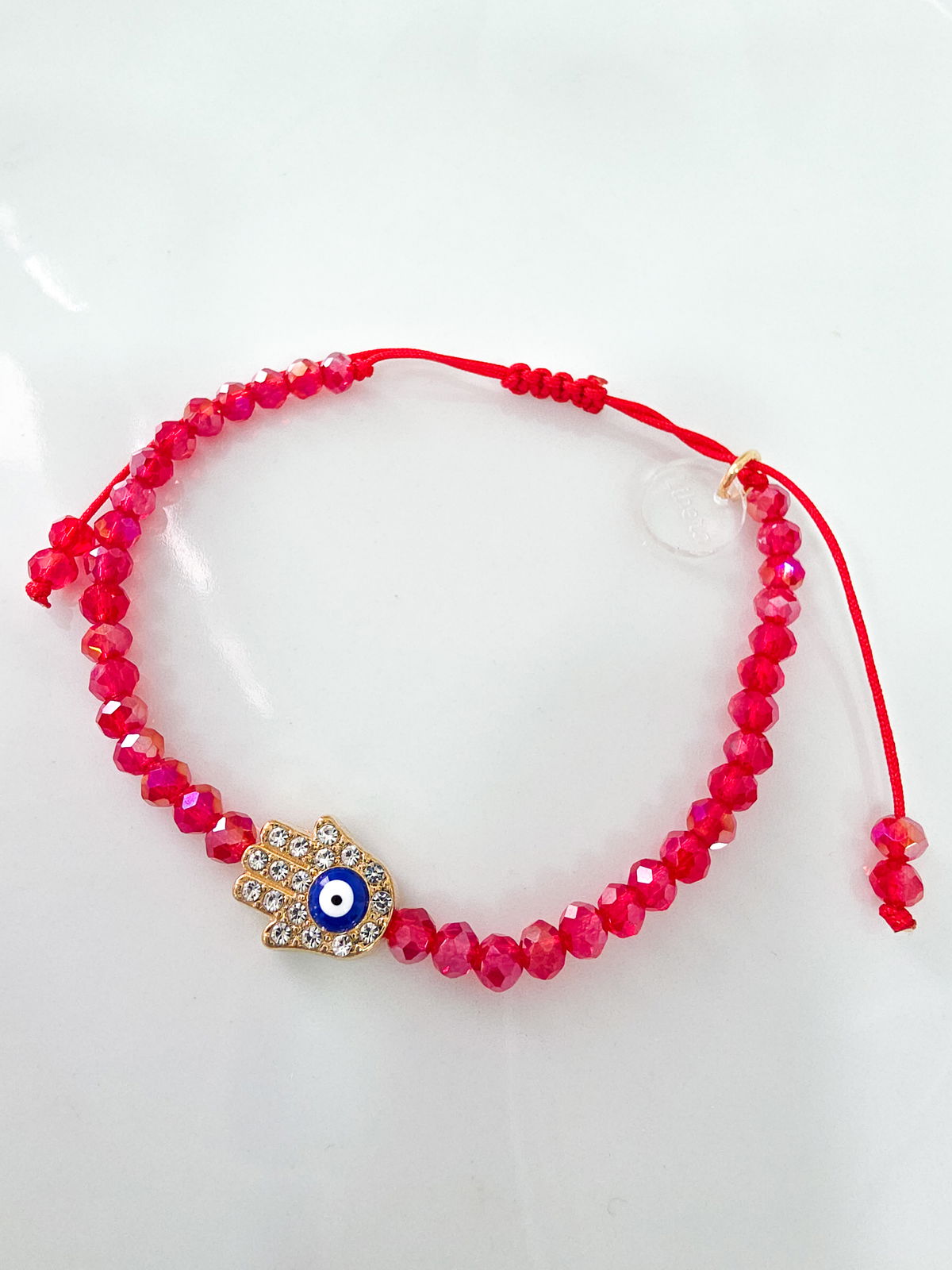 Pulsera con cierre regulable (se adapta a todas las medidas) compuesta por donitas de cristal y dije con Strass.