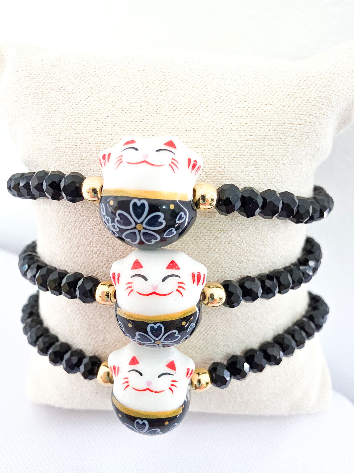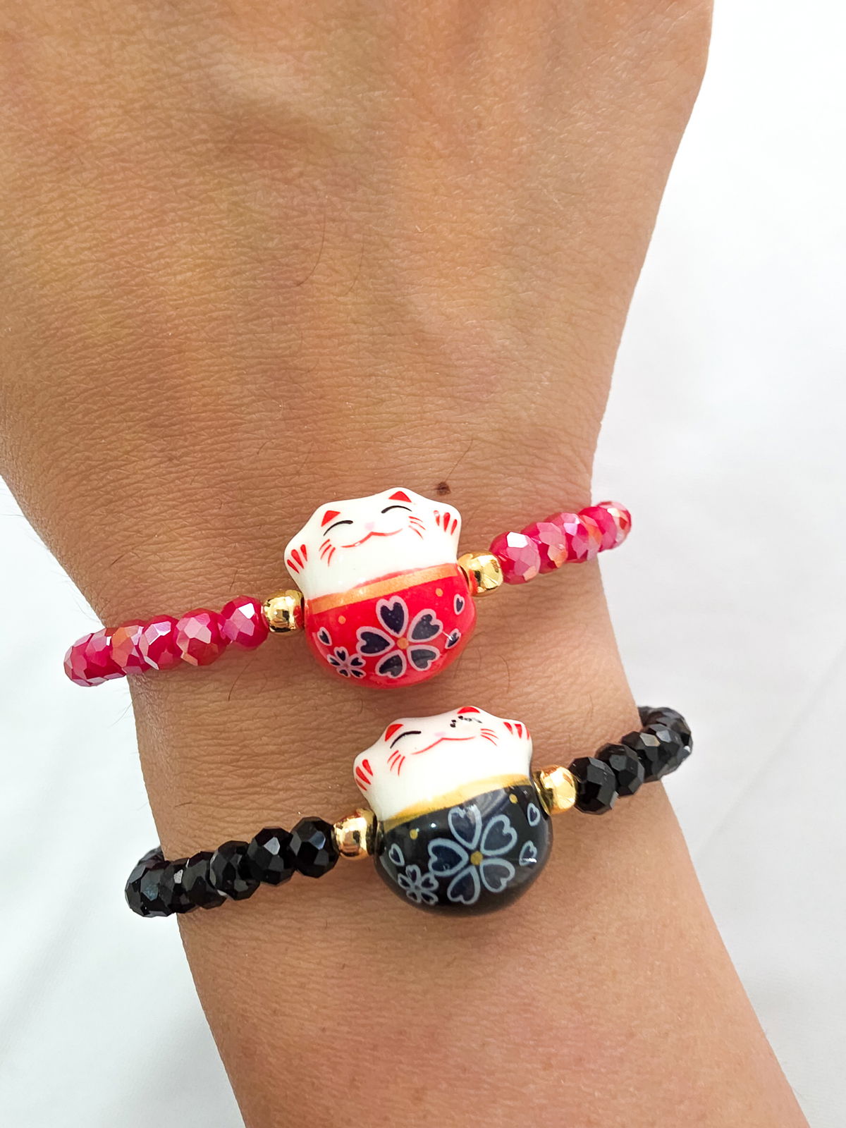 Pulsera elástica compuesta por cristales y Maneki Neko de Cerámica. Bolitas y detalles de Oro Laminado 18k