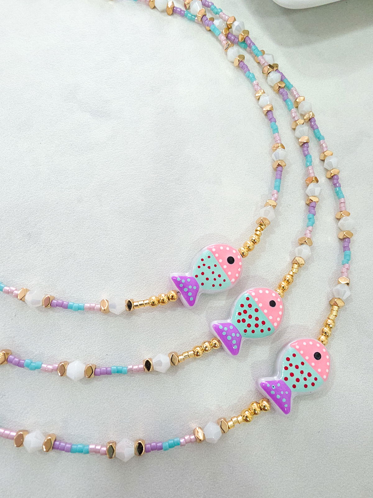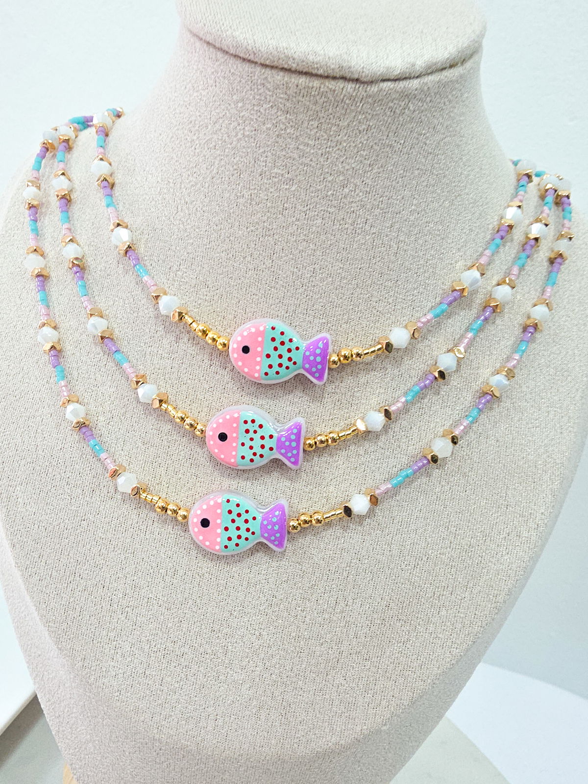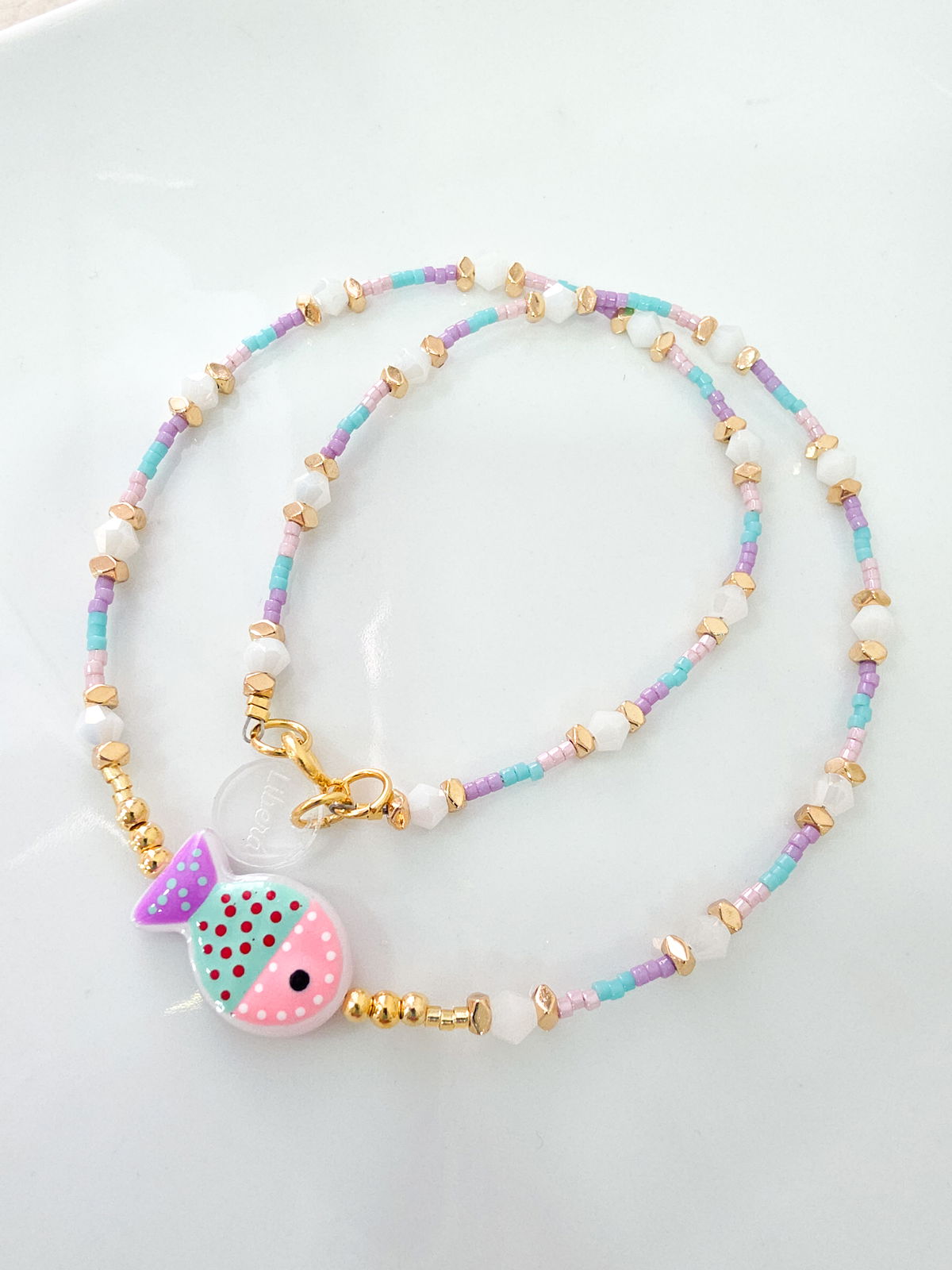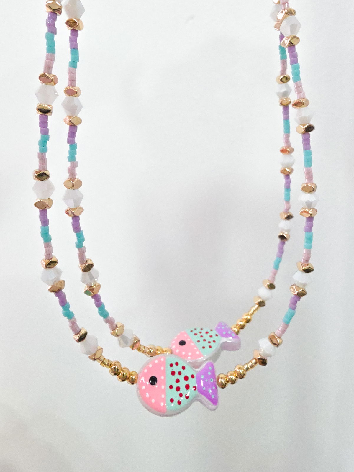 Collar de aproximadamente 40 cm, compuesto por delicas marca Miyuki (origen Japón) arandelas bisceladas de Hematite con baño, conitos de cristal y pececito de Murano.