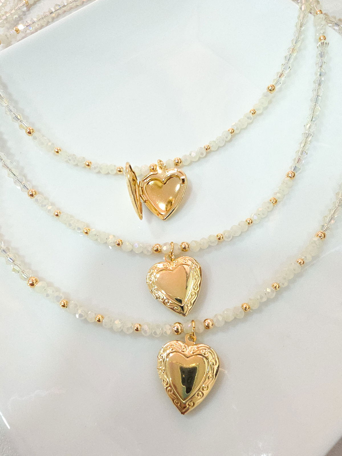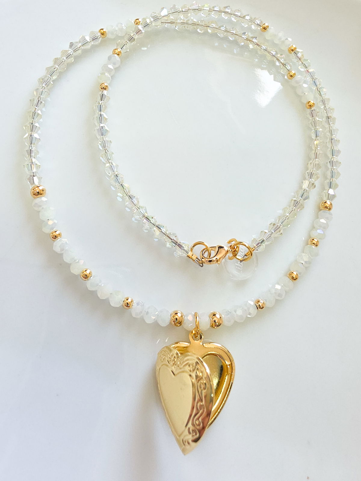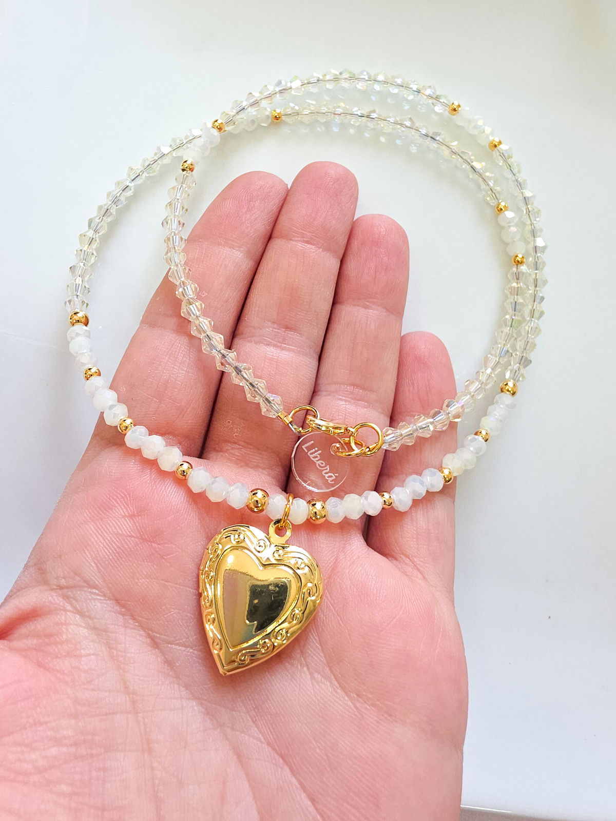Collar de aproximadamente 50 cm, compuesto por conitos y donitas de cristal y dije de Corazon Relicario. Posee una bisagra, en su interior se le puede agregar lo que más te guste!