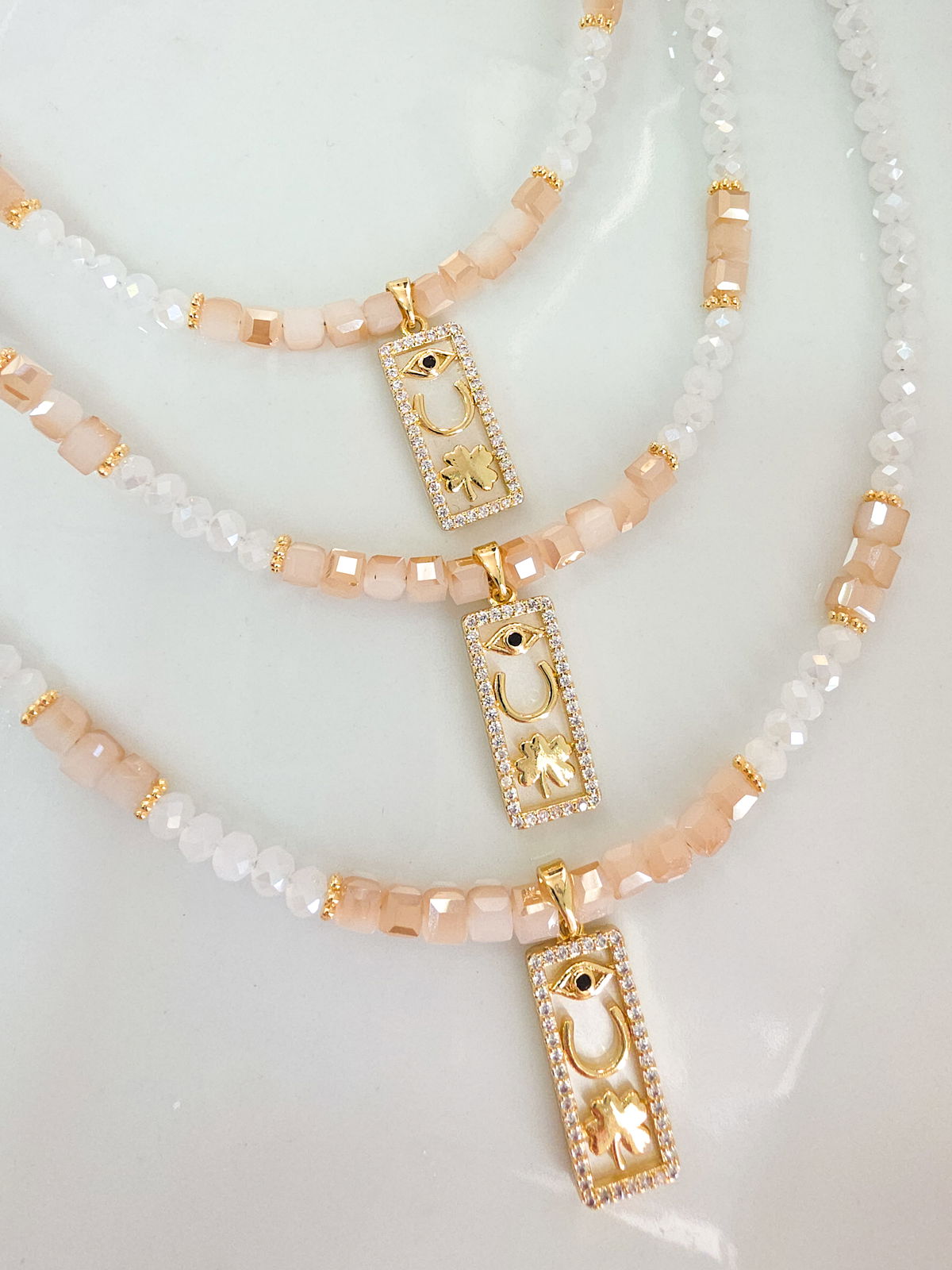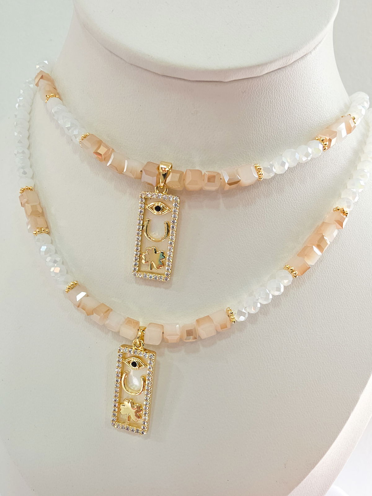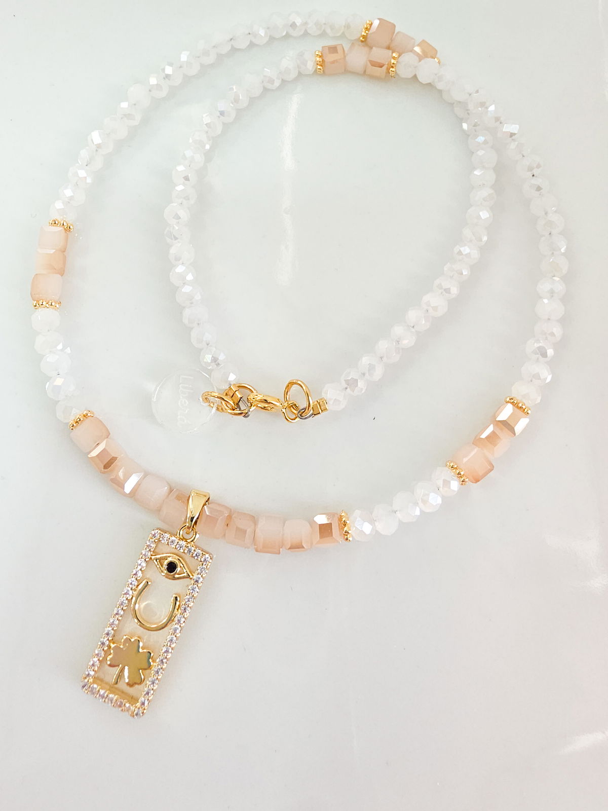 Collar de aproximadamente 45 cm, compuesto por cristales y dije laminado en oro esmaltado con microzirconias.