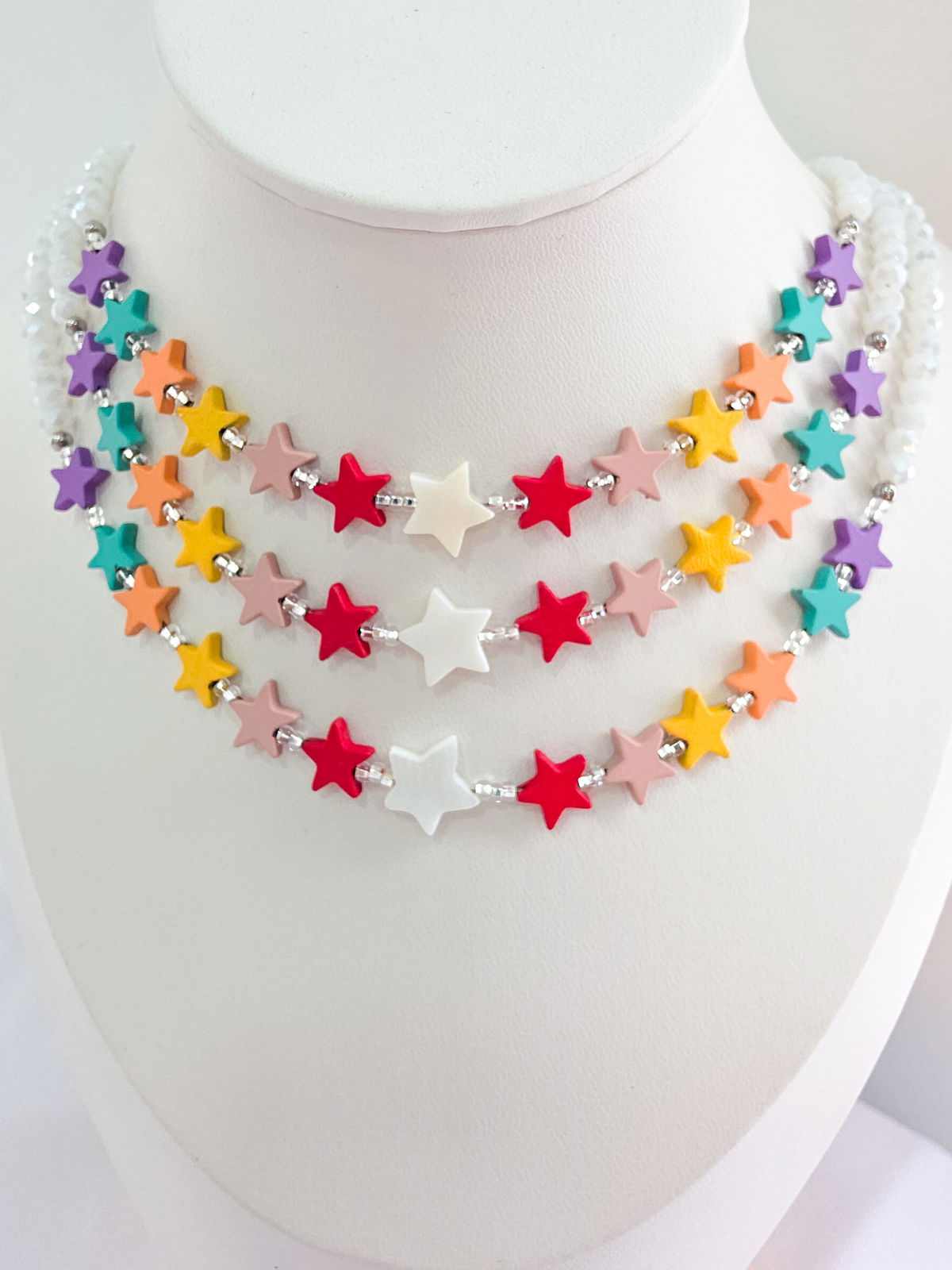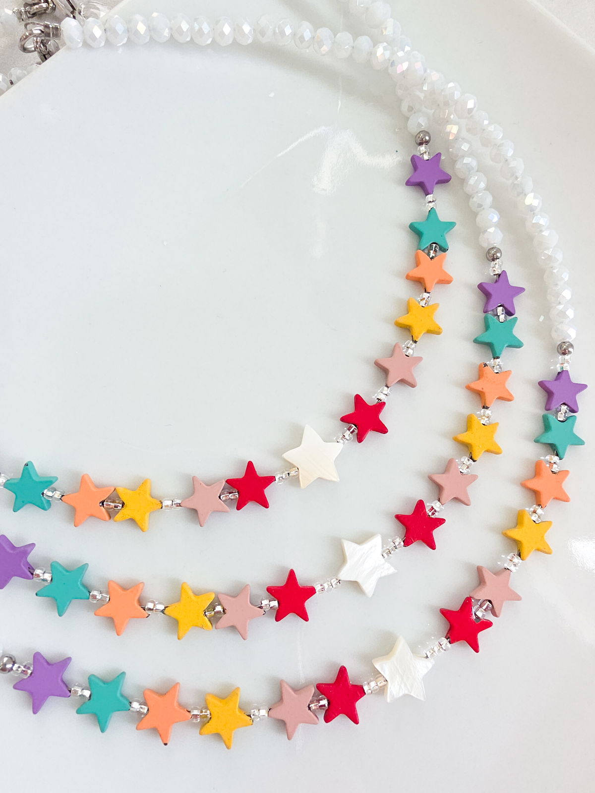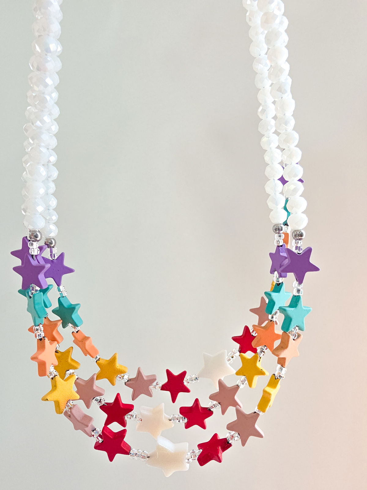 Collar de aproximadamente 40 cm (más cadena de alargue) compuesto por cristales, estrellitas de Hematite engomadas de colores y Estrella central de Nácar Pulido.
