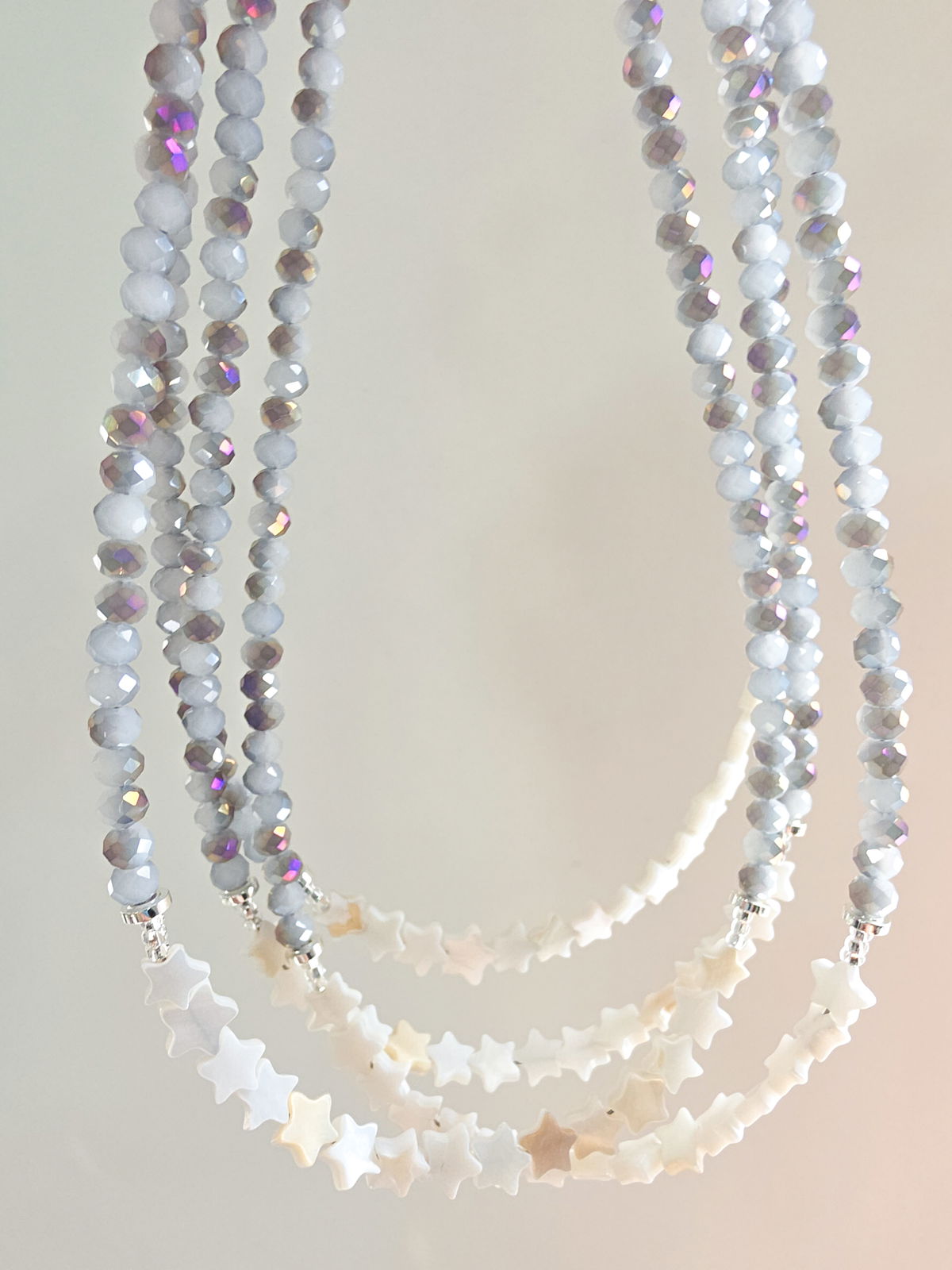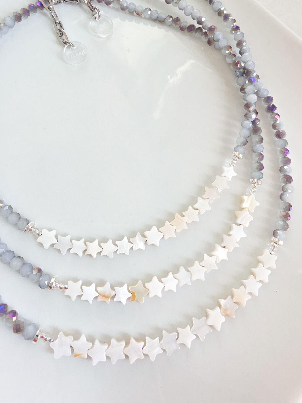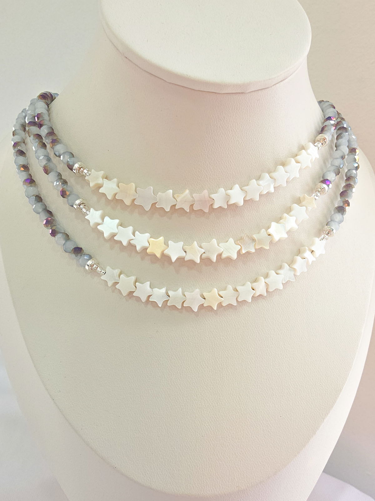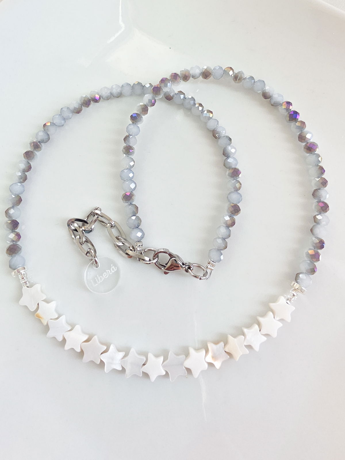 Collar de aproximadamente 40 cm (más cadena de alargue) compuesto por cristales y estrellitas de Nácar Pulido.