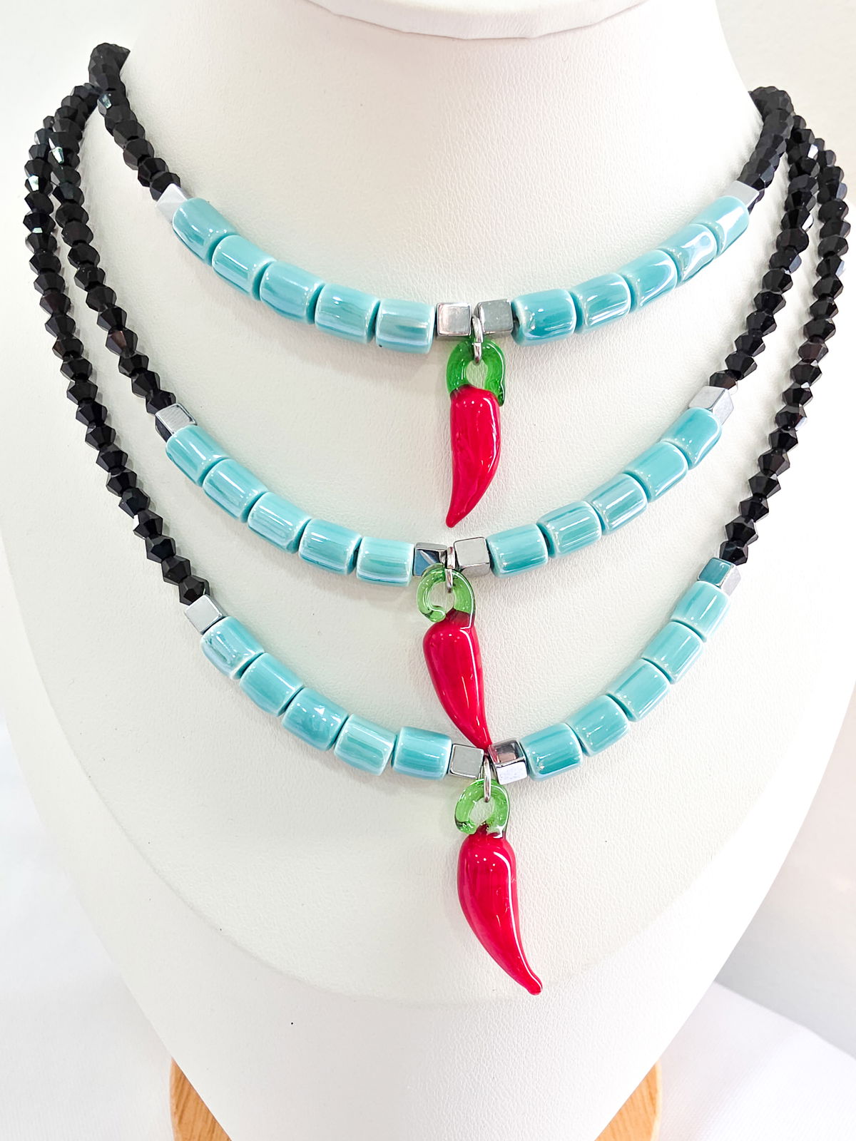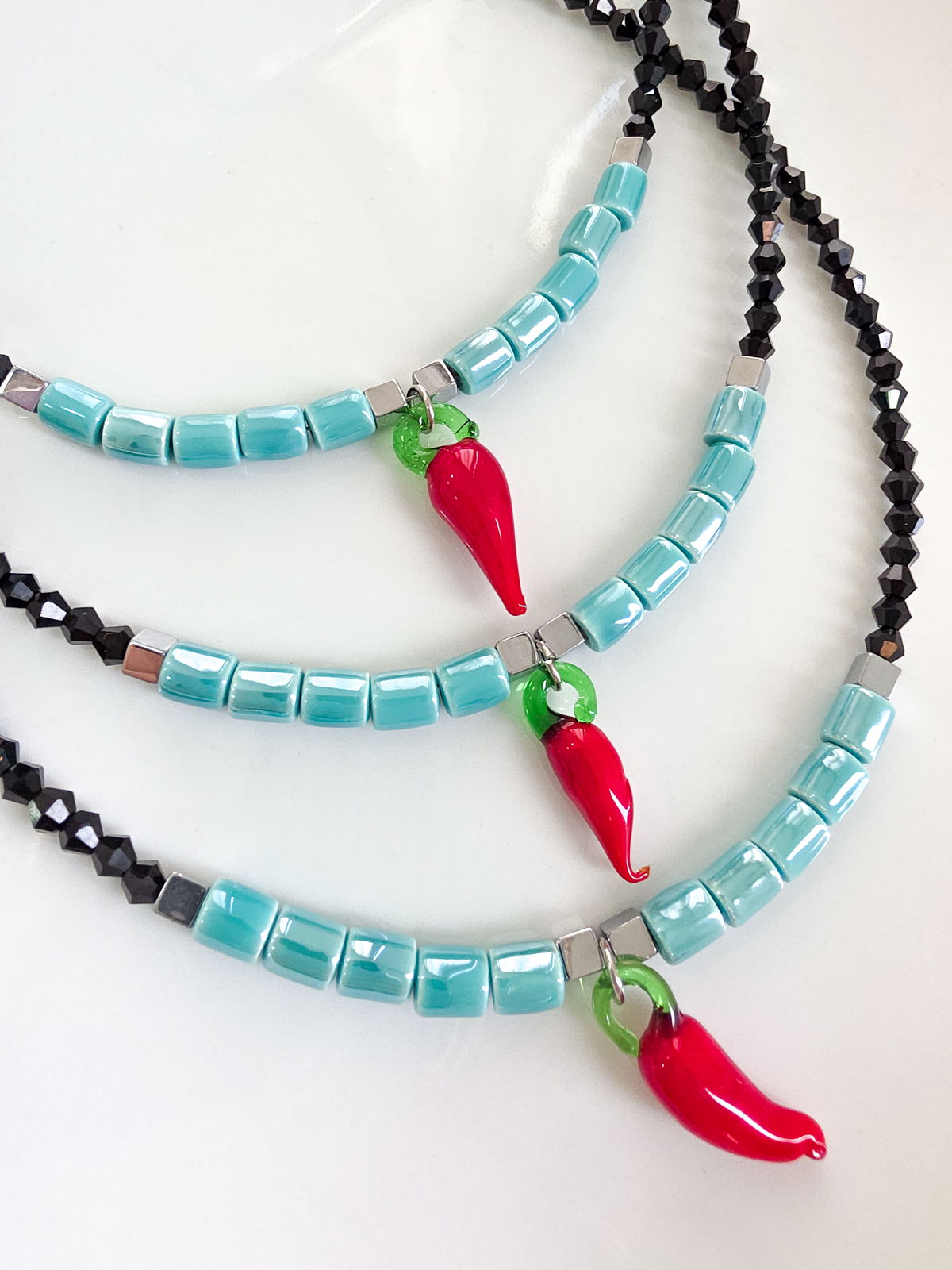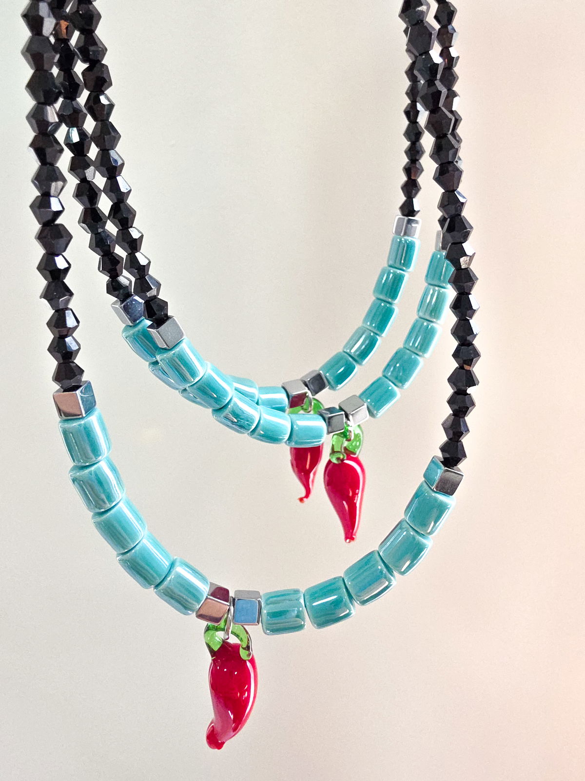 Collar de aproximadamente 40 cm (más cadena de alargue) compuesto por cristales y tubos de cerámica, cubos de Hematite y Amuleto de Murano.