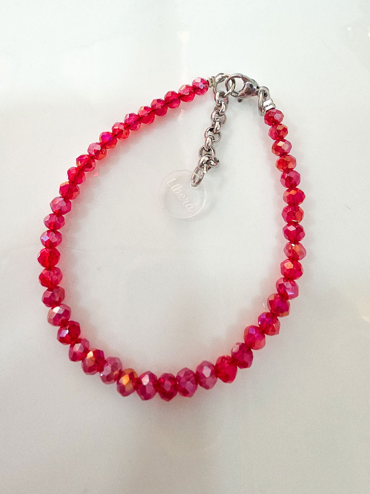 Pulsera compuesta por donitas de cristal, terminaciones, cierre y cadena de Acero Quirúrgico 316l.