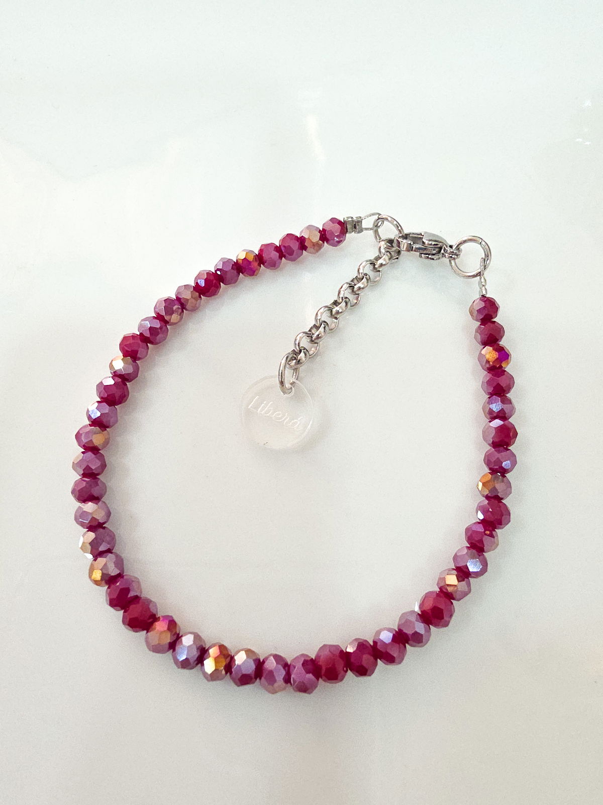 Pulsera compuesta por donitas de cristal, terminaciones, cierre y cadena de Acero Quirúrgico 316l.