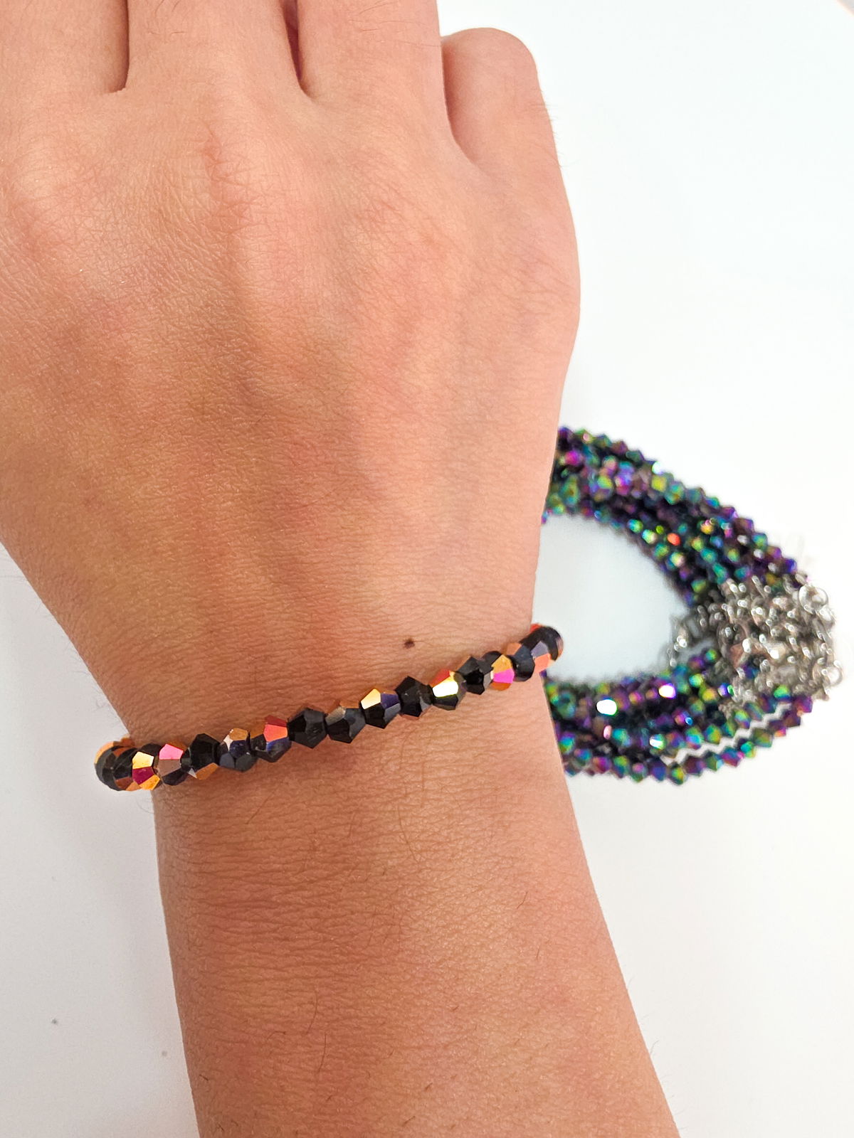 Pulsera compuesta por cristales cónicos. Detalles, cierre y cadena de Acero Quirúrgico 316l.