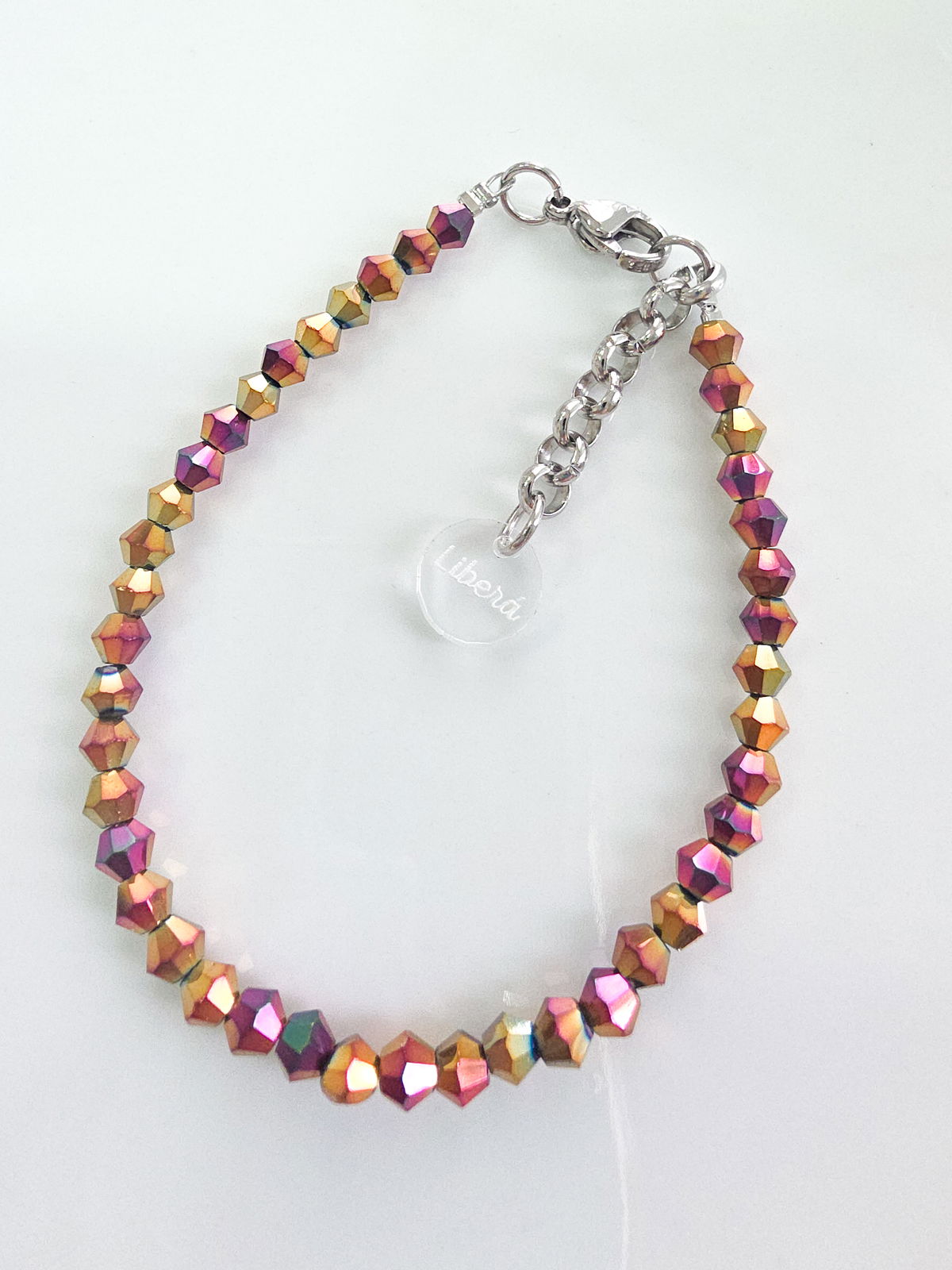 Pulsera compuesta por cristales cónicos. Detalles, cierre y cadena de Acero Quirúrgico 316l.