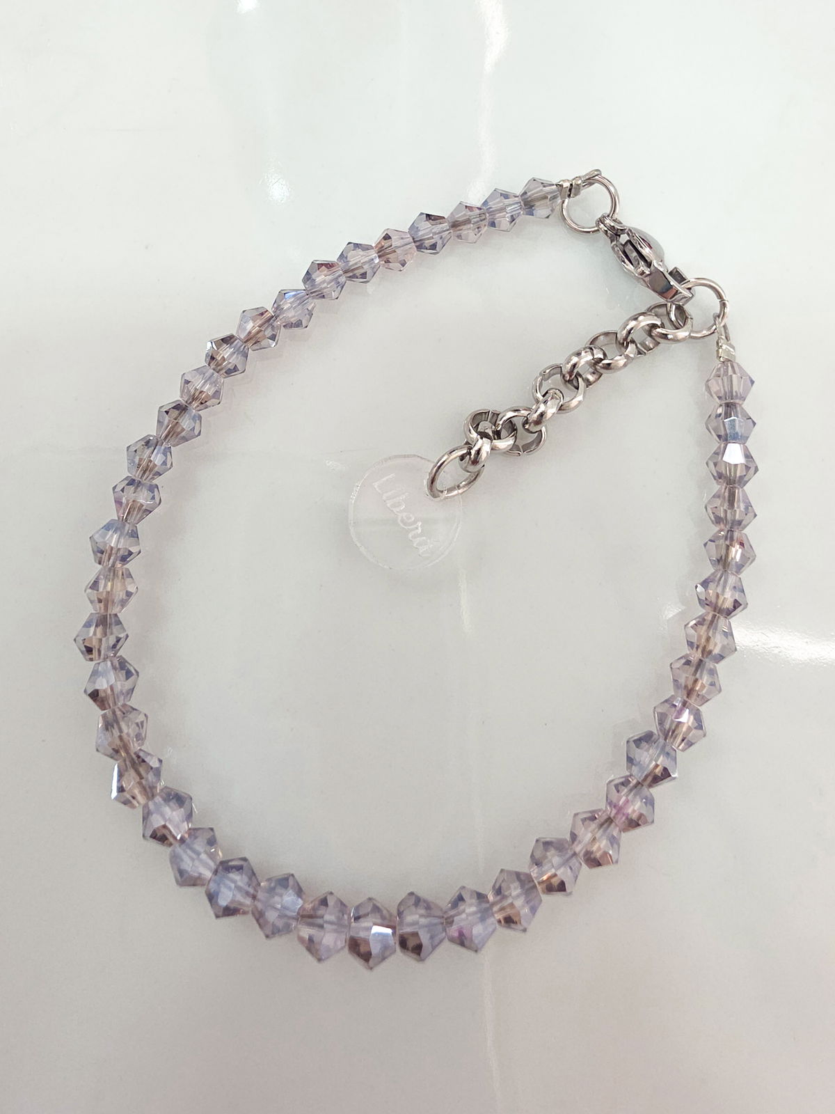 Pulsera compuesta por cristales cónicos. Detalles, cierre y cadena de Acero Quirúrgico 316l.
