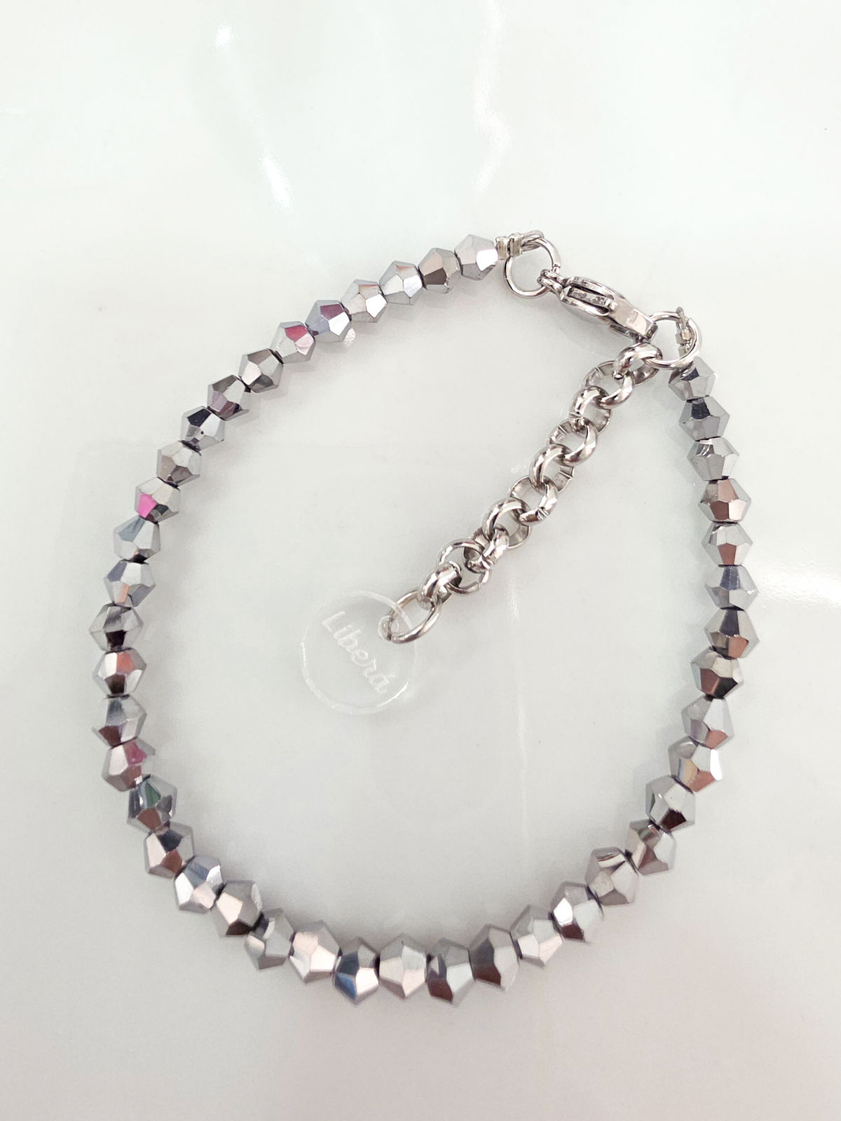 Pulsera compuesta por cristales cónicos. Detalles, cierre y cadena de Acero Quirúrgico 316l.